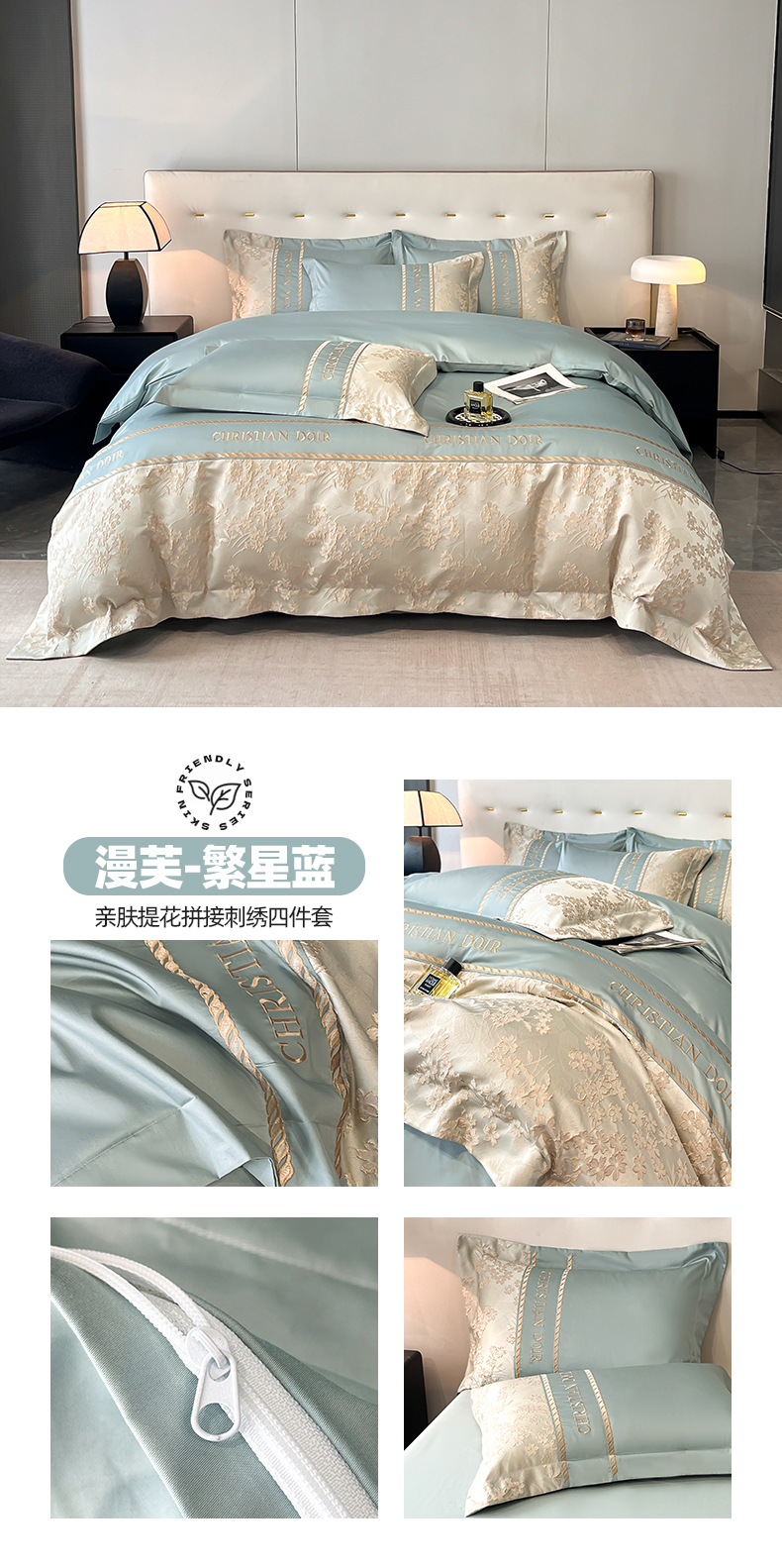 (总)置顶家纺 2026新款亲肤棉玫瑰刺绣提花卡罗拉系列四件套,卡罗拉-碧蓝,卡罗拉-魅粉,卡罗拉-浅香槟,卡罗拉-天空蓝
