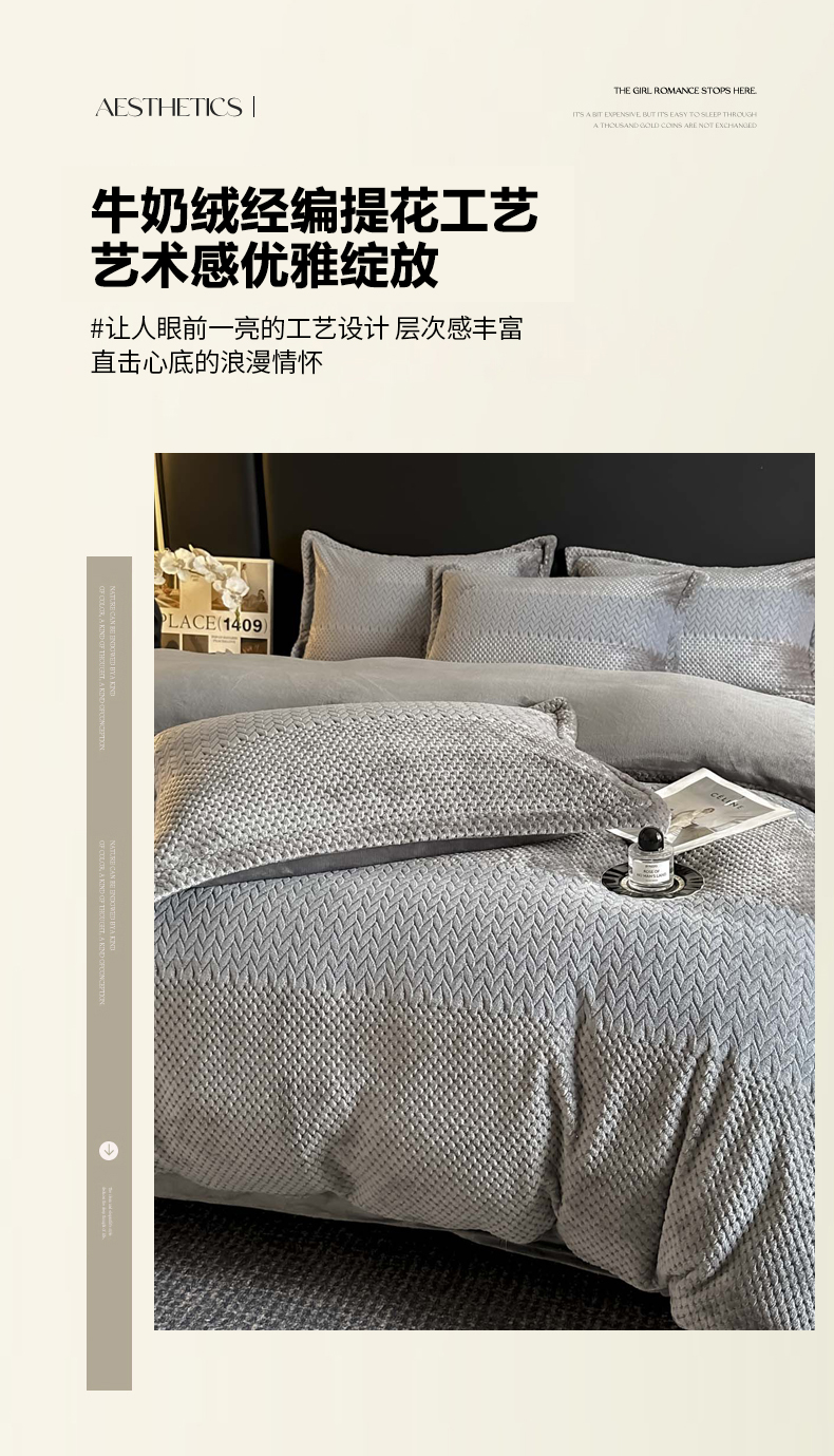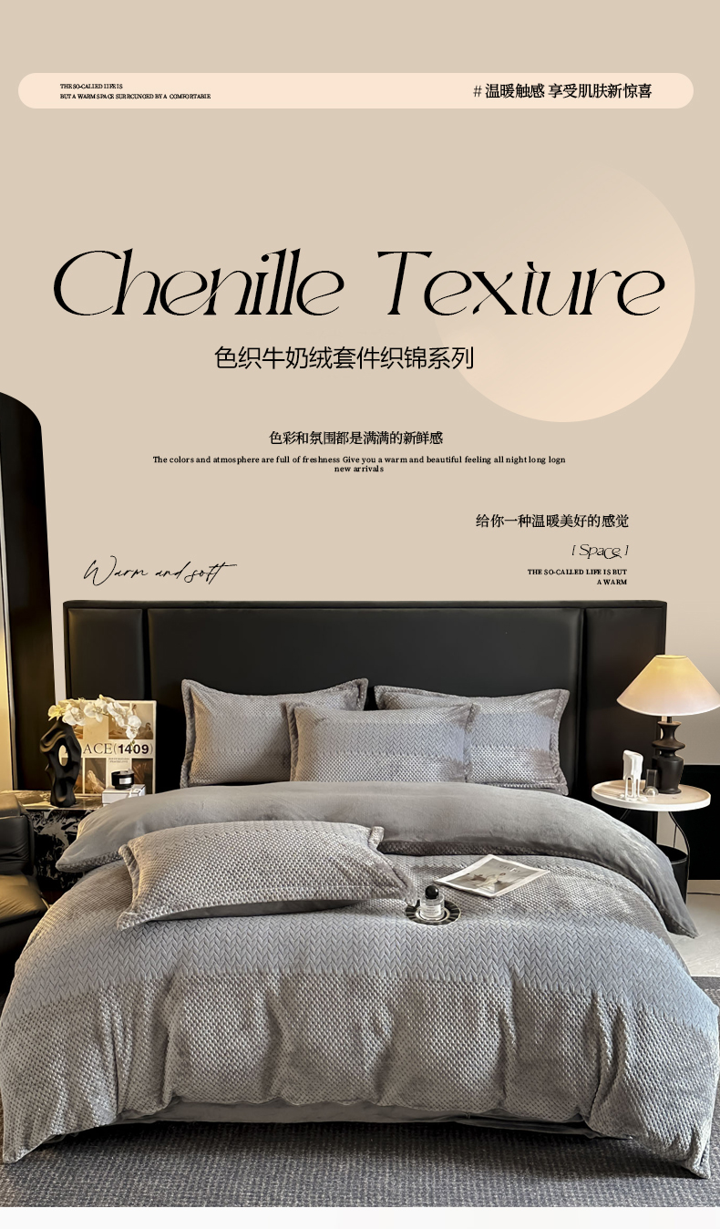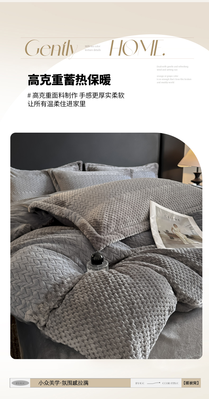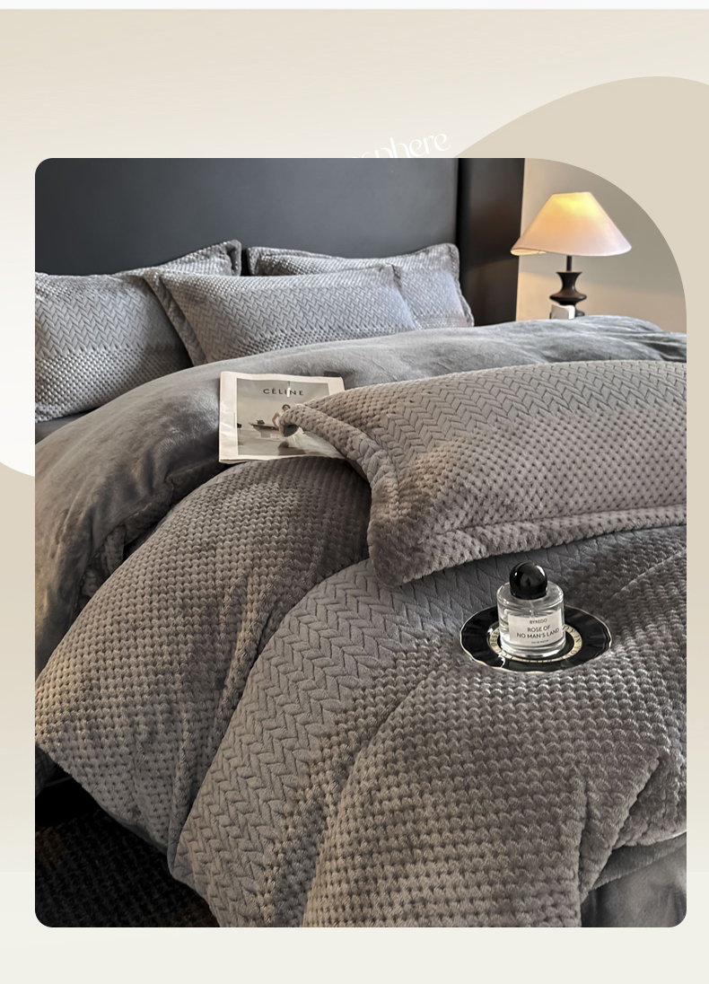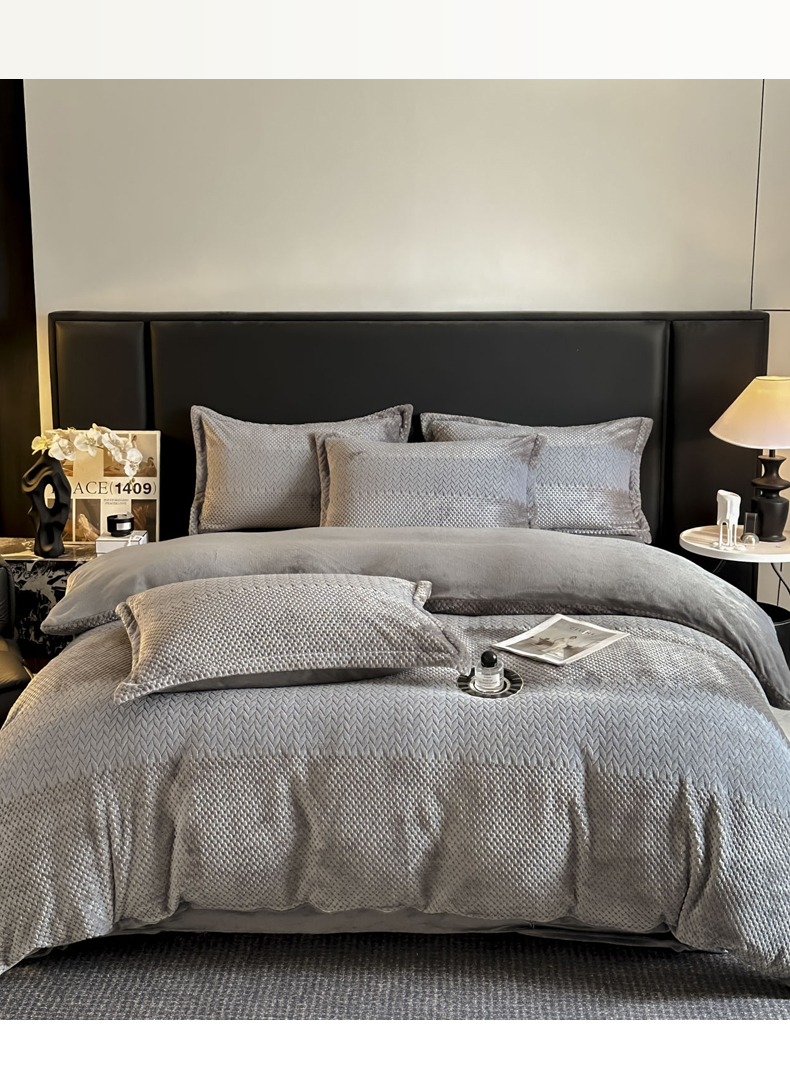 当前位置: 91家纺网 > 商品网购 > 床品套件 > 四件套 > 牛奶绒四件套 > 爱彼家纺 2025冬季新款色织拼色编织提花轻奢牛奶绒四件套-织锦系列 织锦-灰调