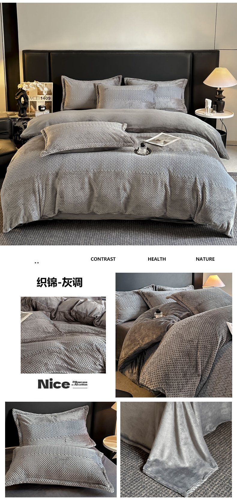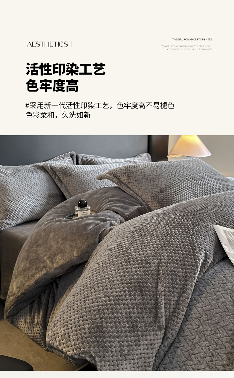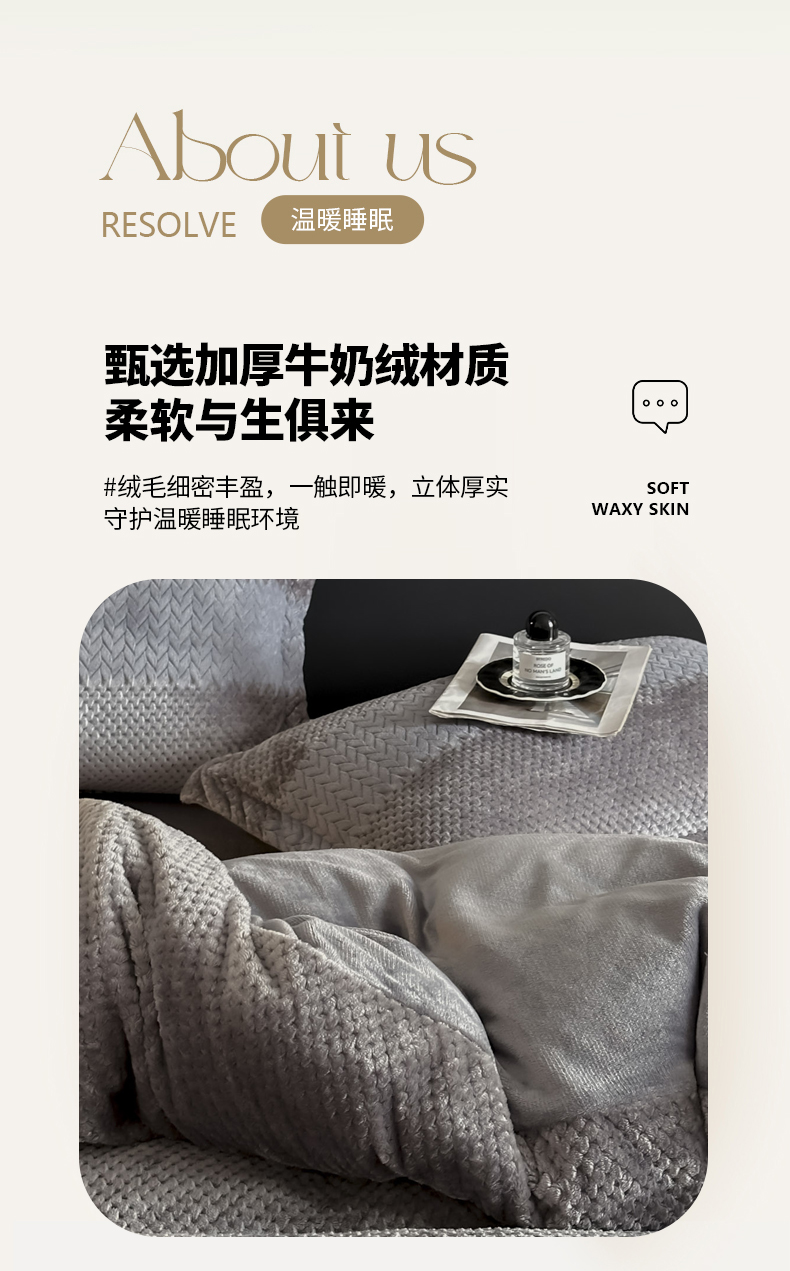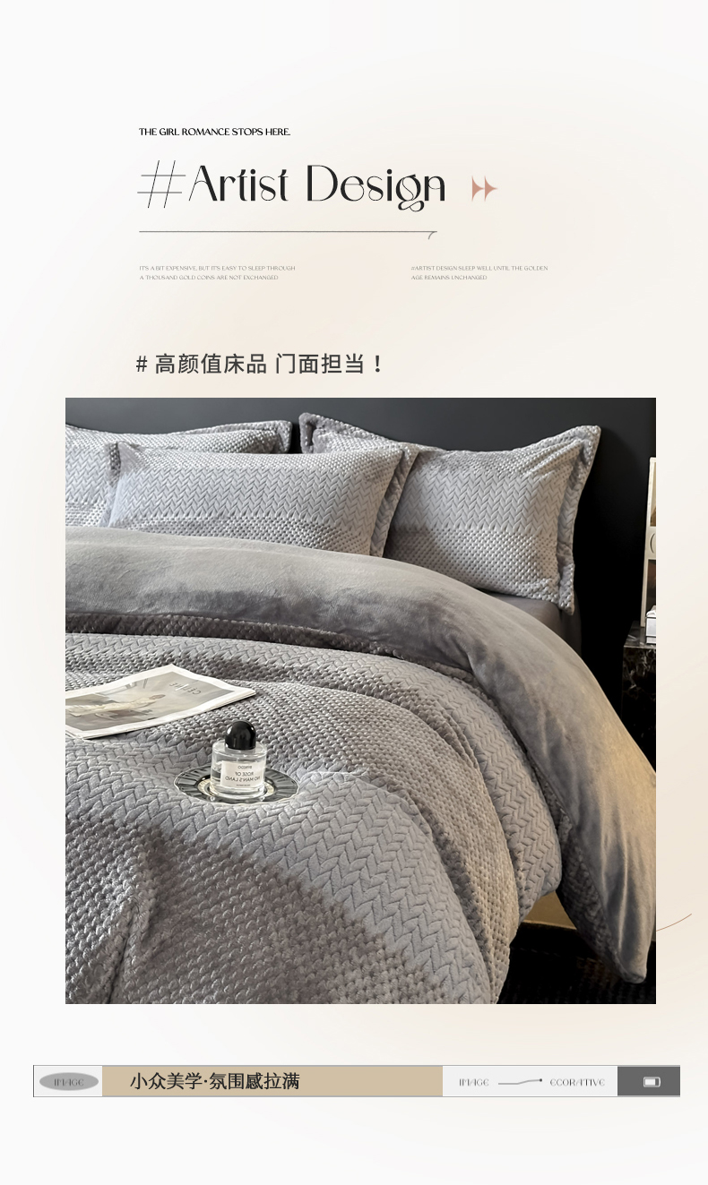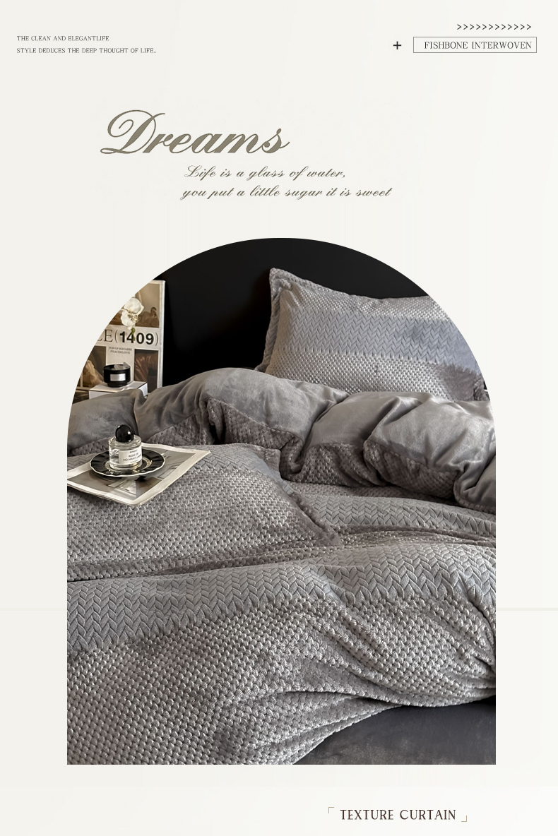 当前位置: 91家纺网 > 商品网购 > 床品套件 > 四件套 > 牛奶绒四件套 > 爱彼家纺 2025冬季新款色织拼色编织提花轻奢牛奶绒四件套-织锦系列 织锦-灰调