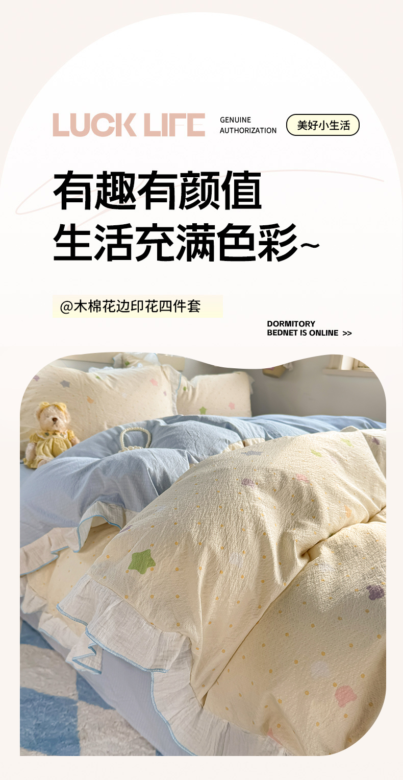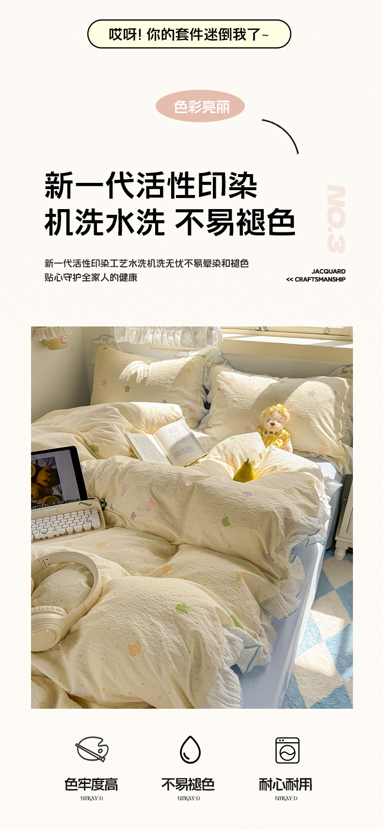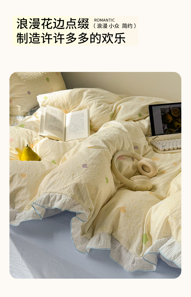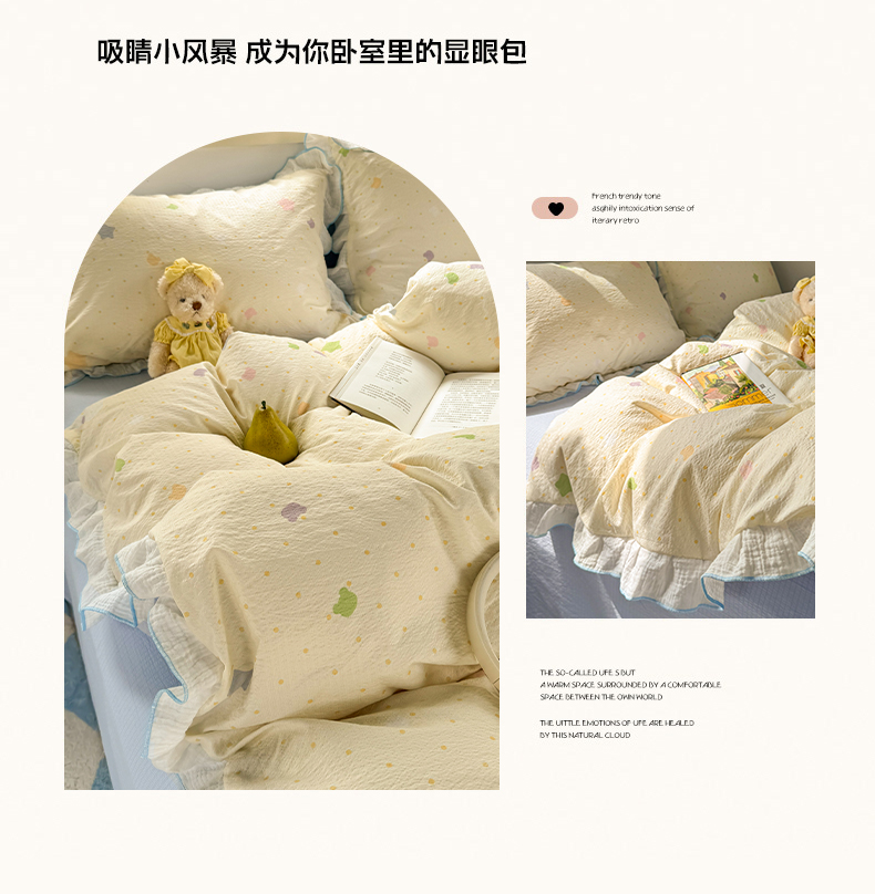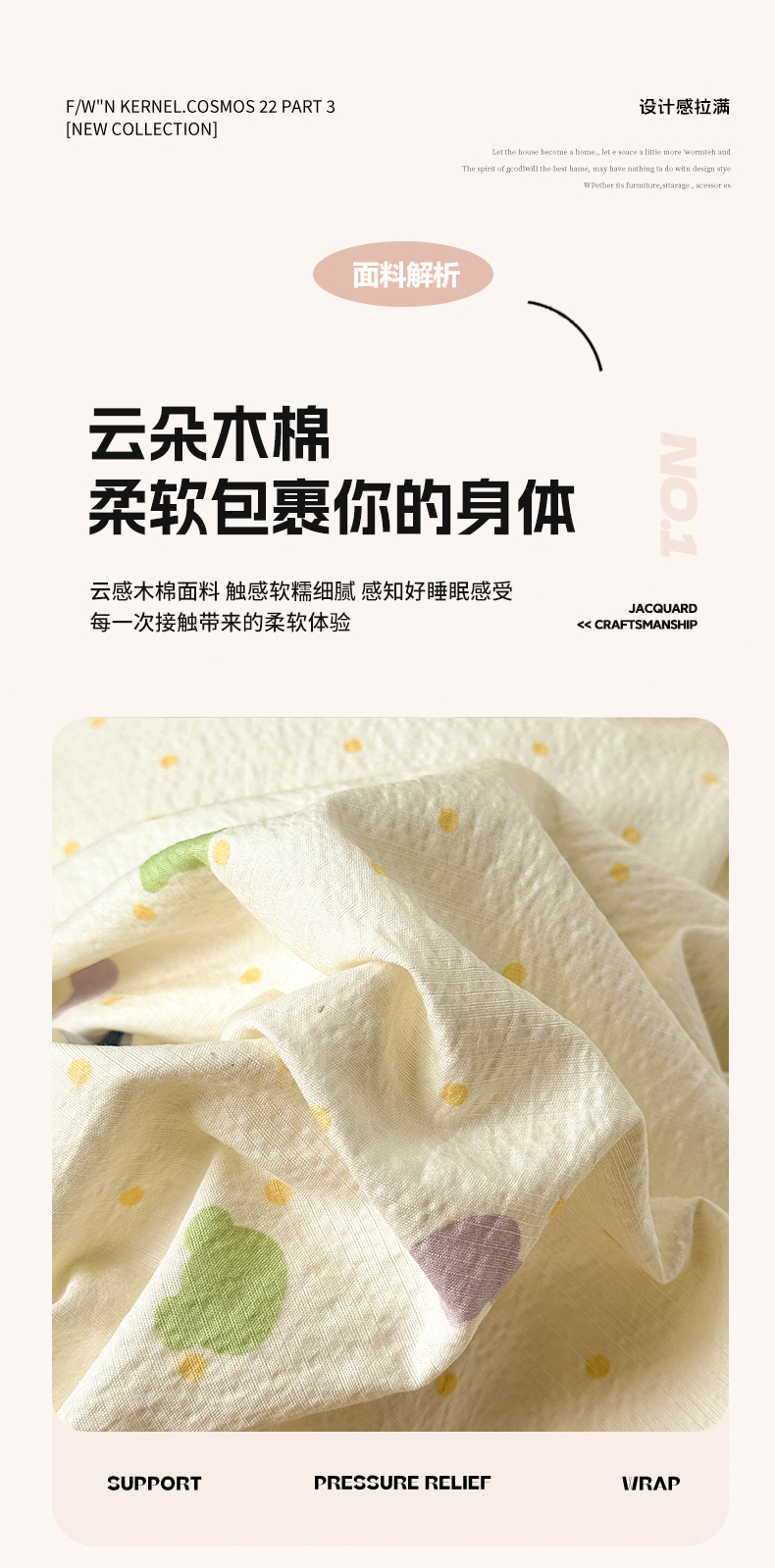 当前位置: 91家纺网 > 商品网购 > 床品套件 > 四件套 > 其它四件套 > 繁花家居 2025新款高弹线云感木棉多层纱花边超软四件套 波点熊头