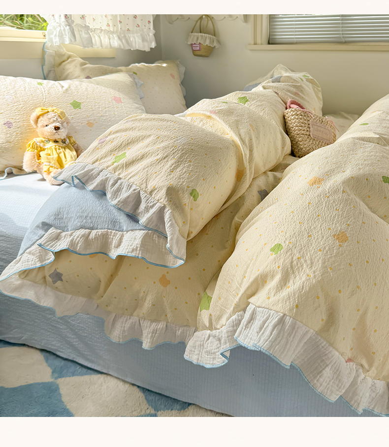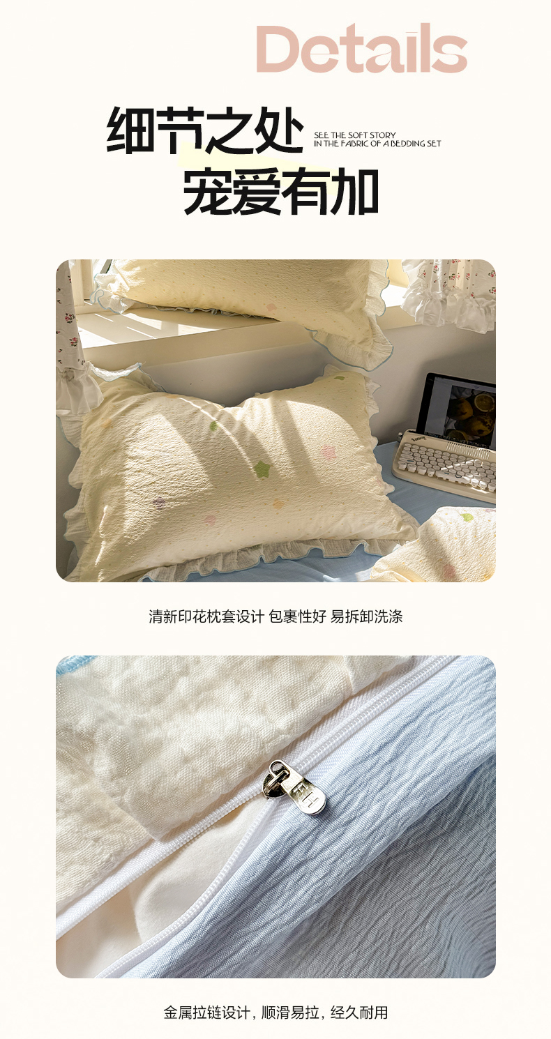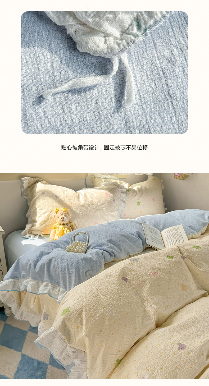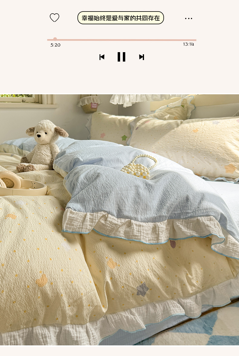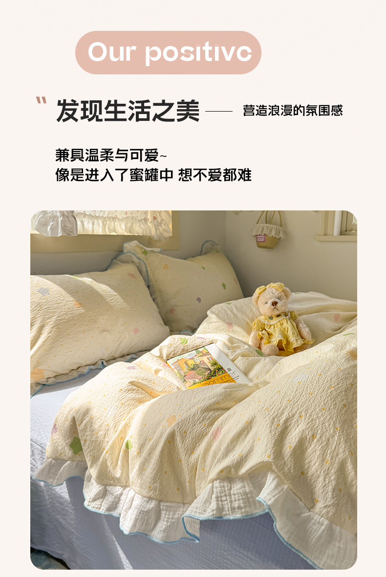 当前位置: 91家纺网 > 商品网购 > 床品套件 > 四件套 > 其它四件套 > 繁花家居 2025新款高弹线云感木棉多层纱花边超软四件套 波点熊头