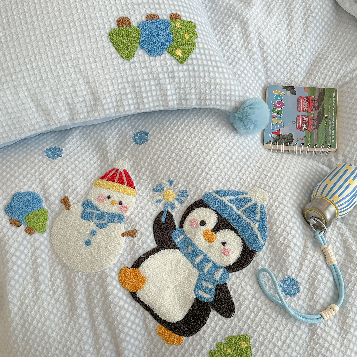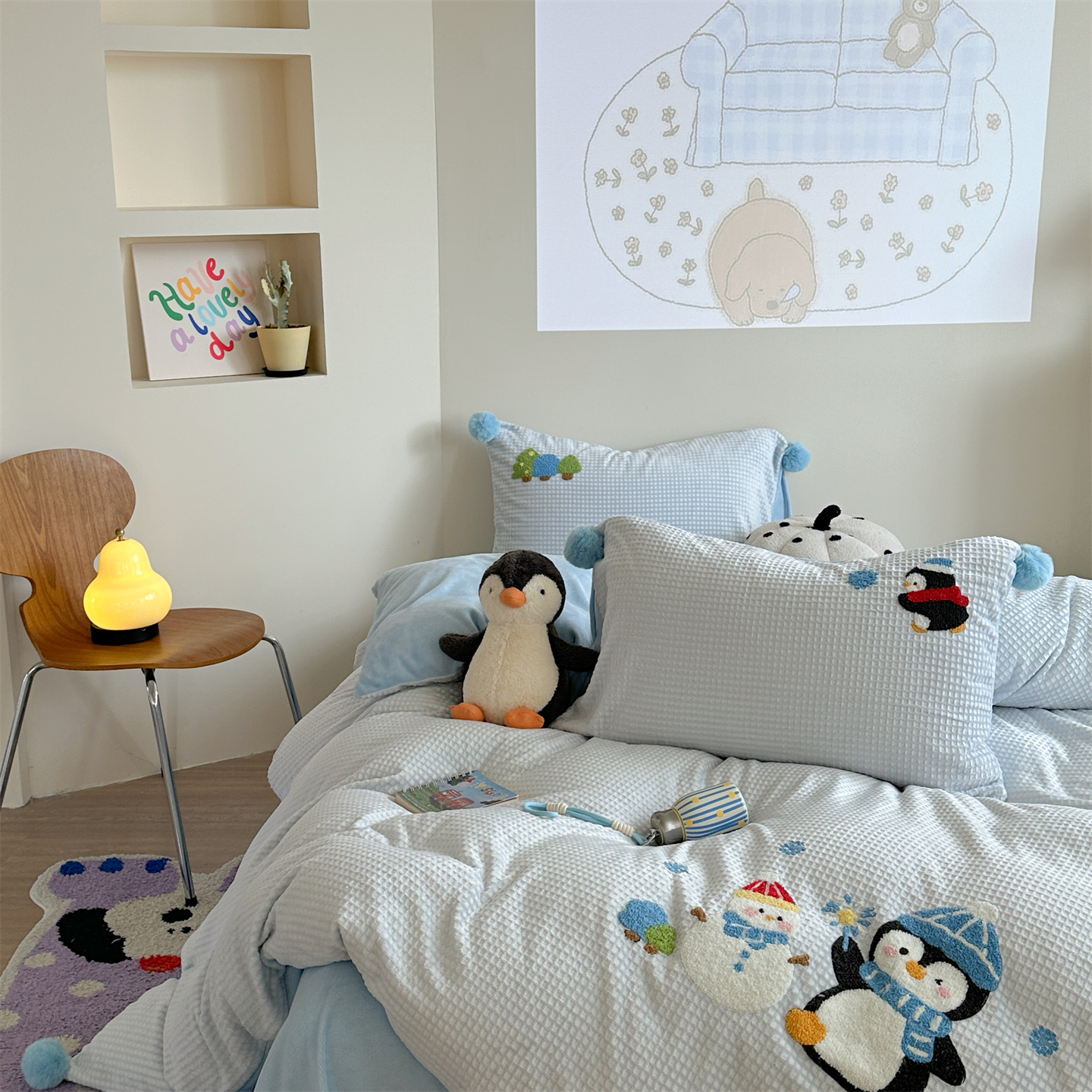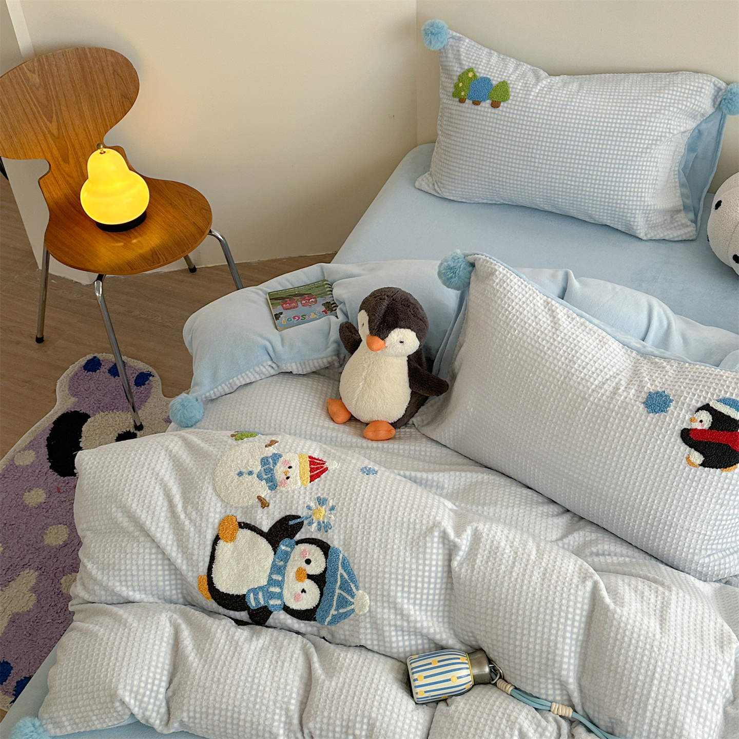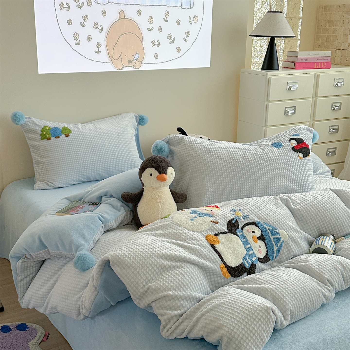(总)柚子YOUTH 2025新款双面泰迪绒毛巾绣四件套,甜甜圈,快乐企鹅,森林聚会,甜酷KT,小茄子,雪人王国