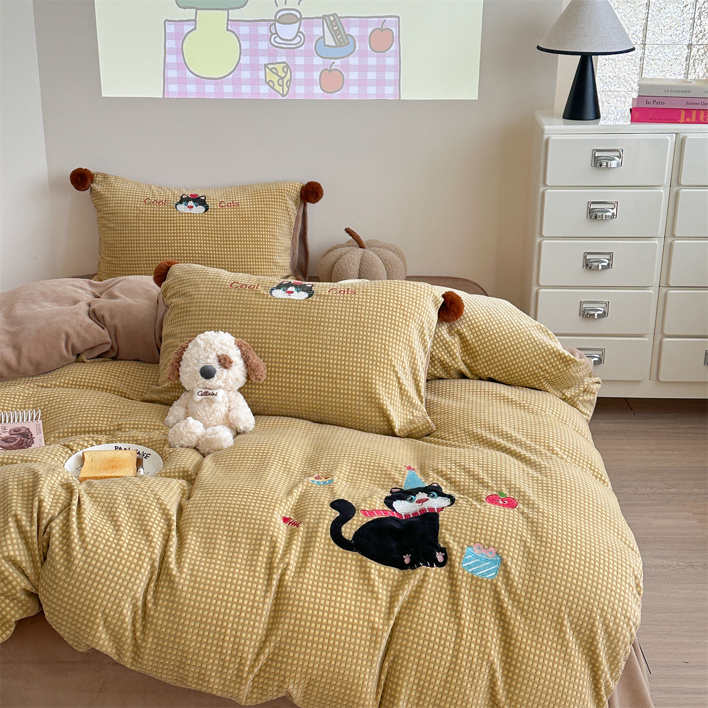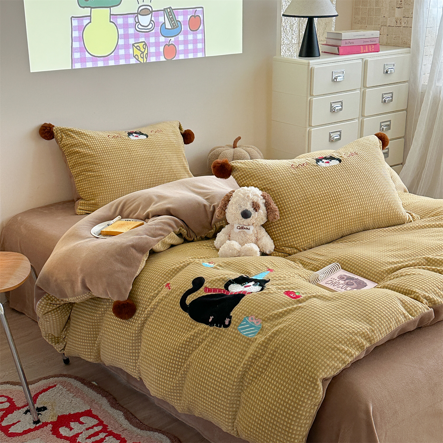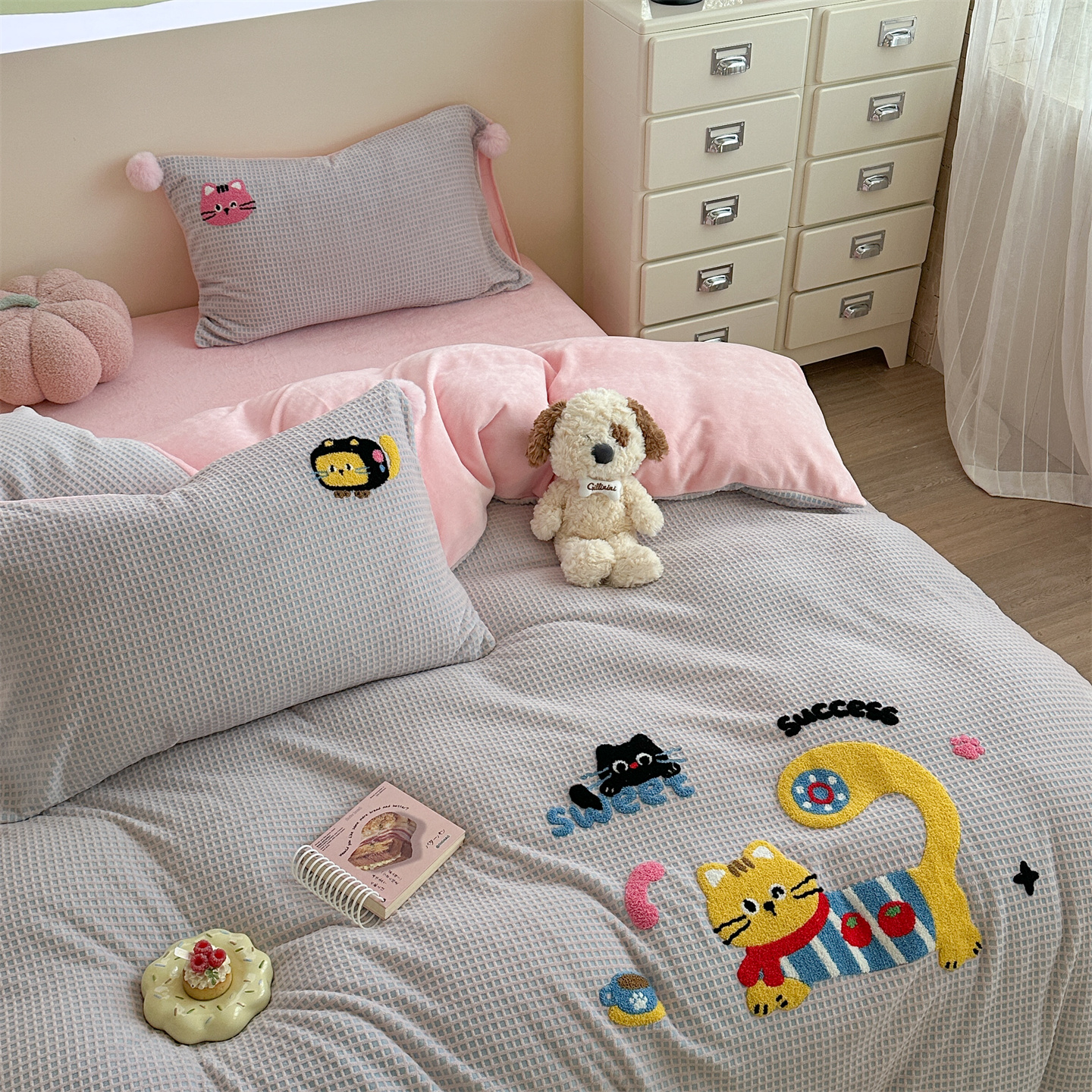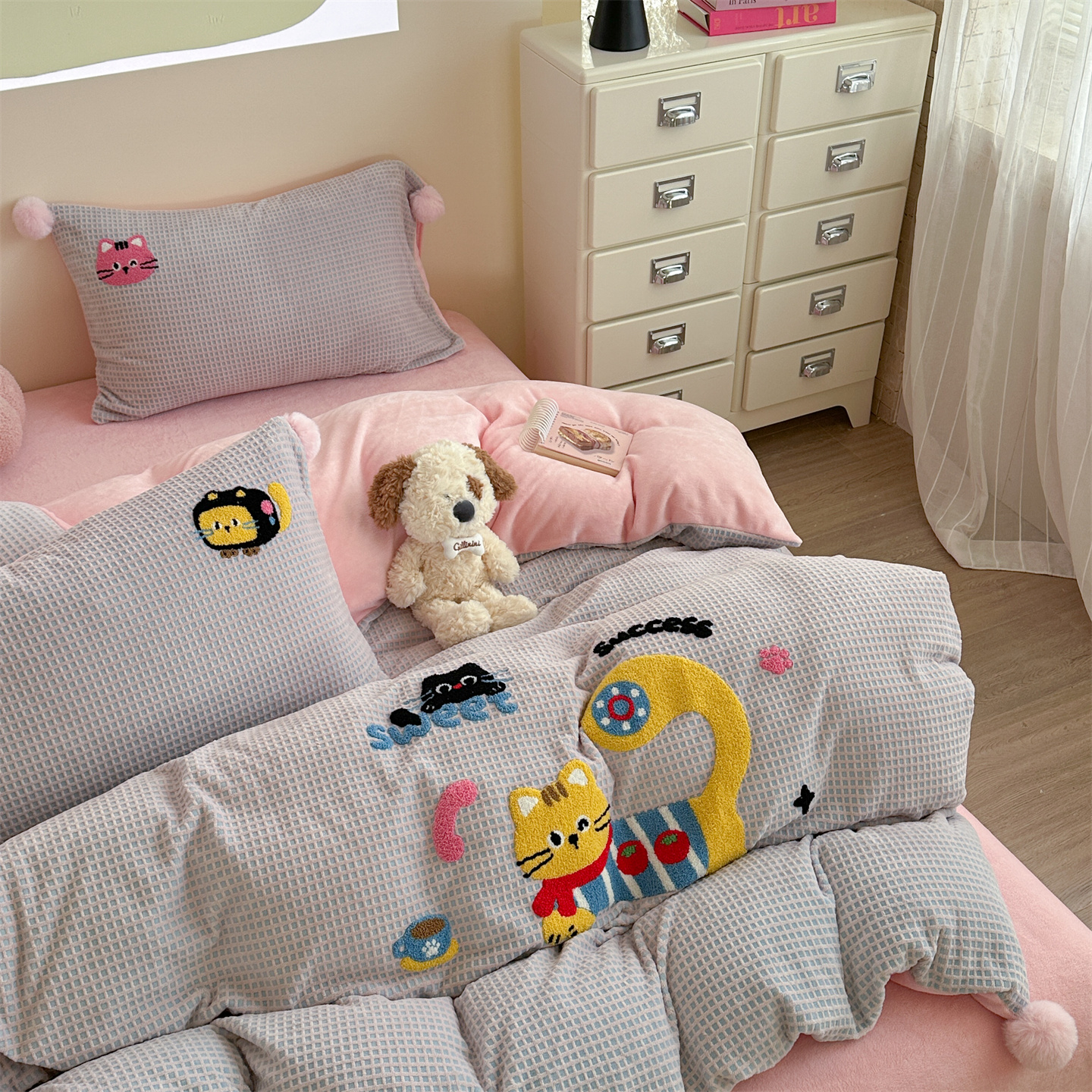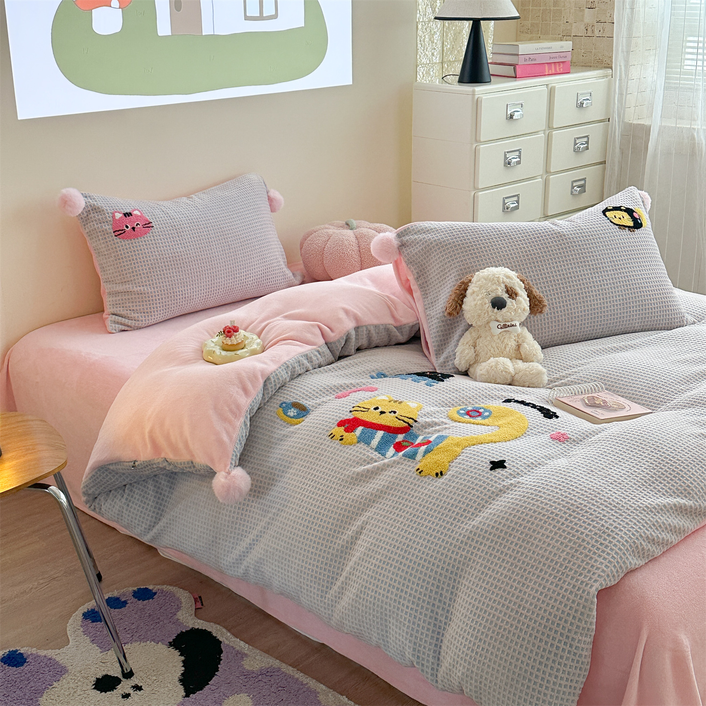 (总)柚子YOUTH 2025新款加厚牛奶绒卡通毛巾绣四件套-印加绣送同款毛毯,蛋糕小狗,公主猫,头套猫,兔兔花园,小伙伴,雪纳瑞