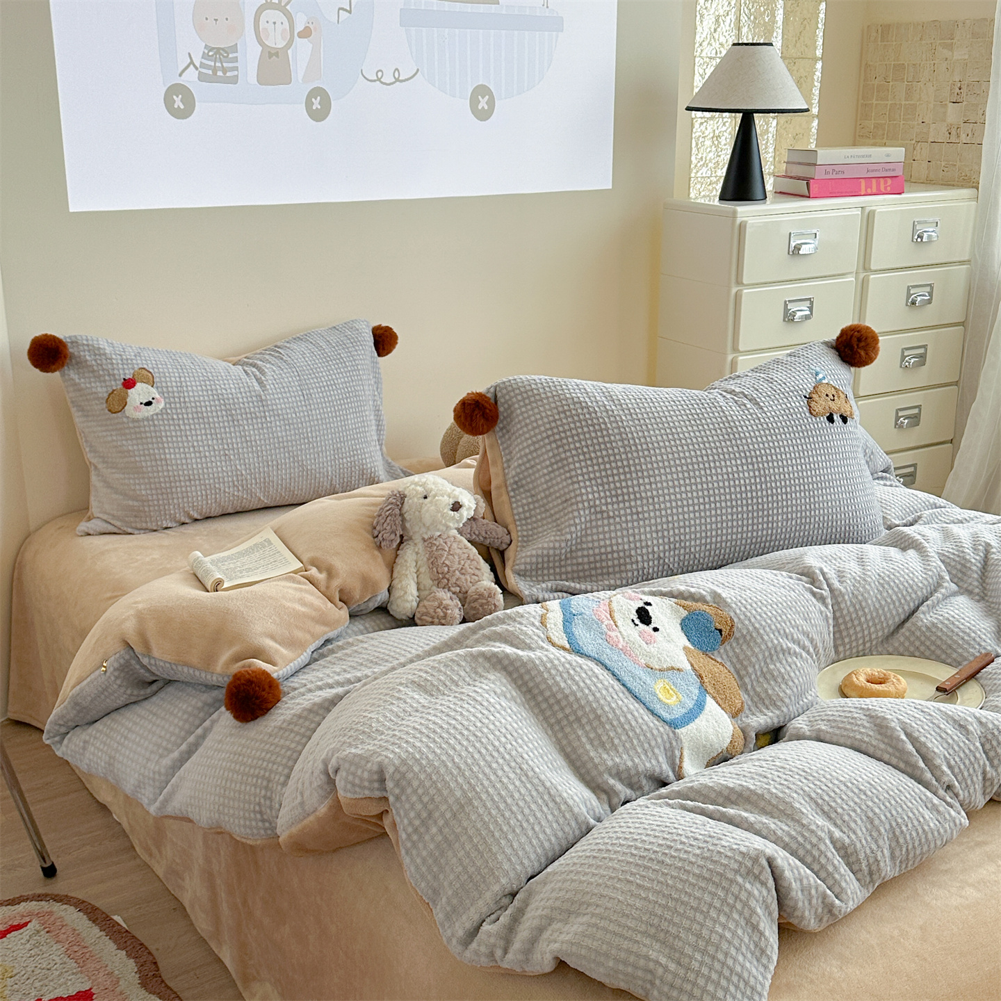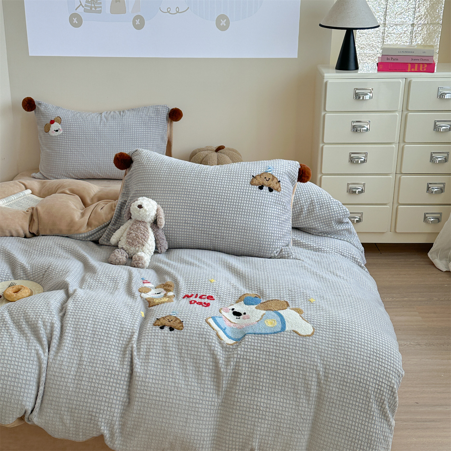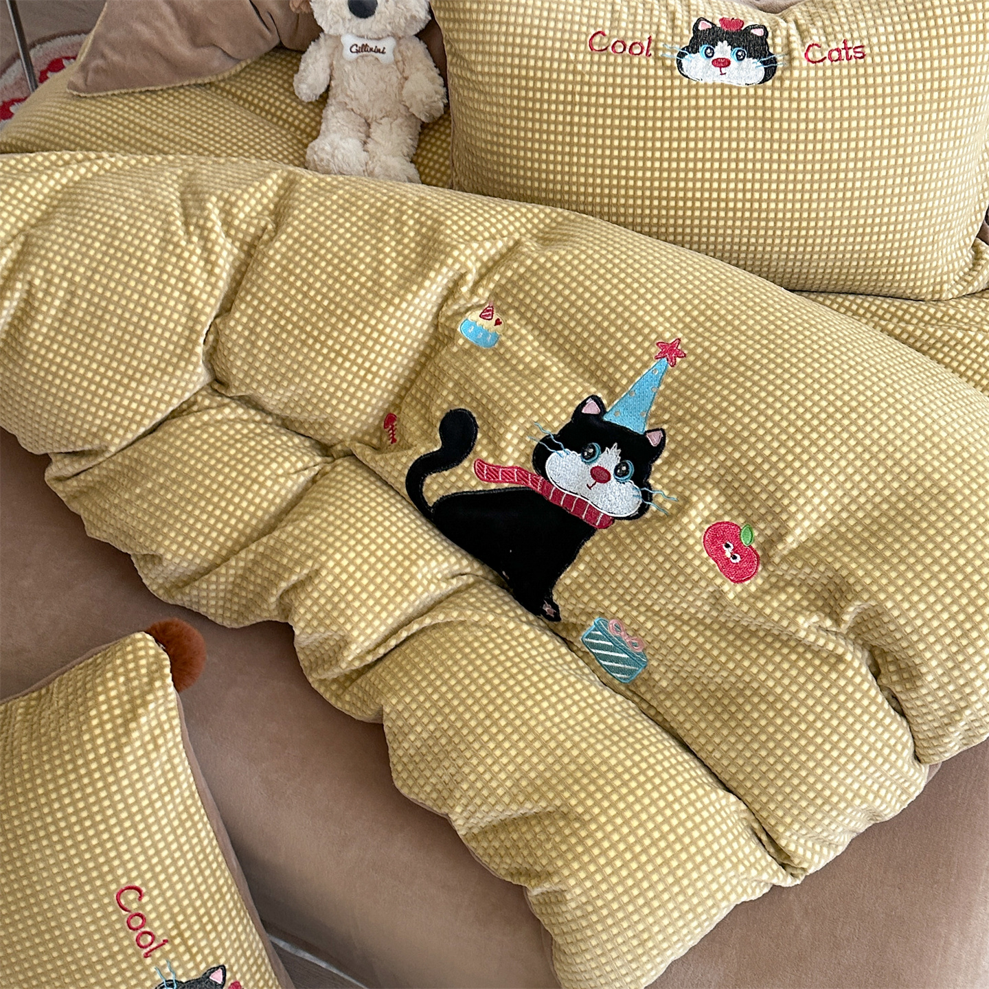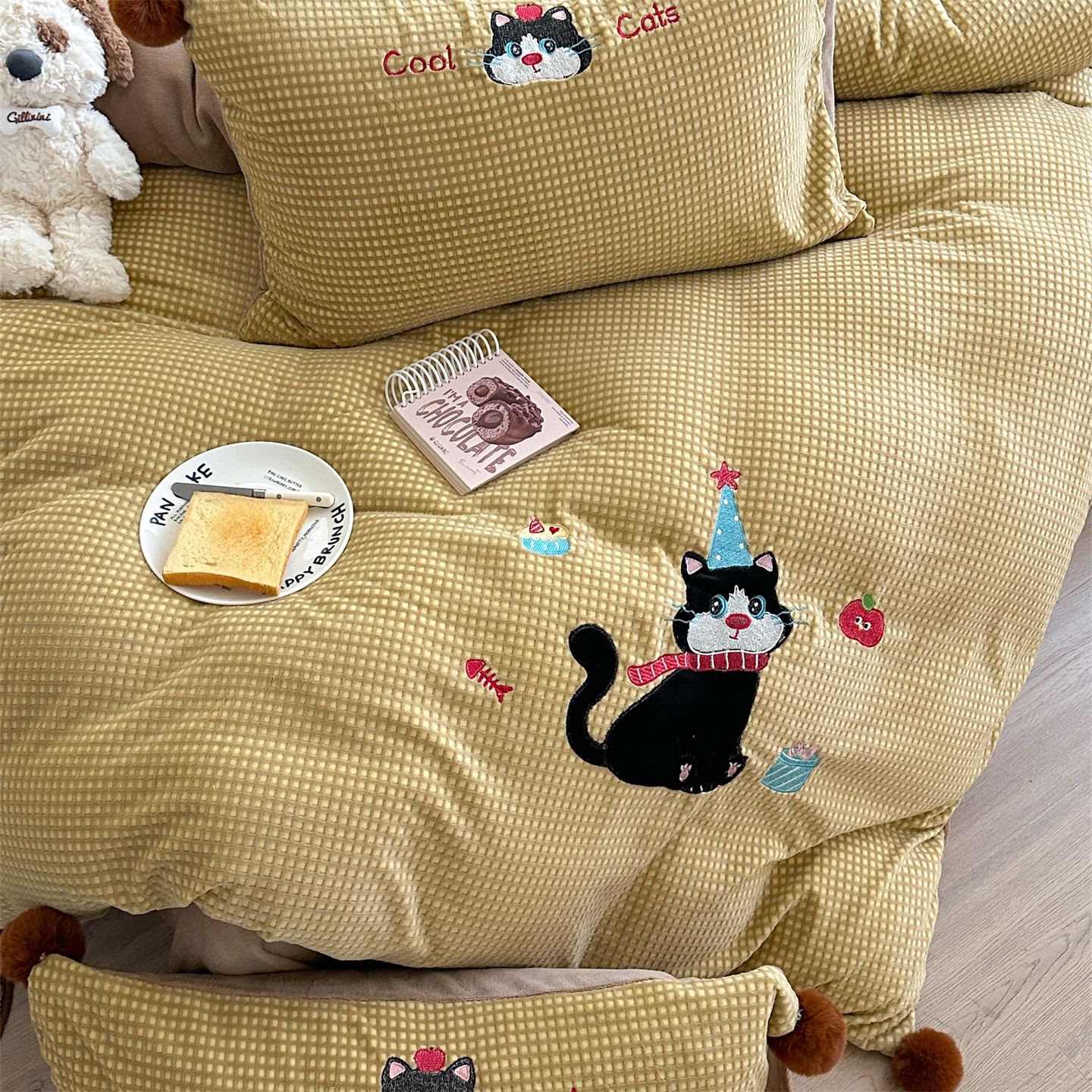 (总)柚子YOUTH 2025新款加厚牛奶绒卡通毛巾绣四件套-印加绣送同款毛毯,蛋糕小狗,公主猫,头套猫,兔兔花园,小伙伴,雪纳瑞