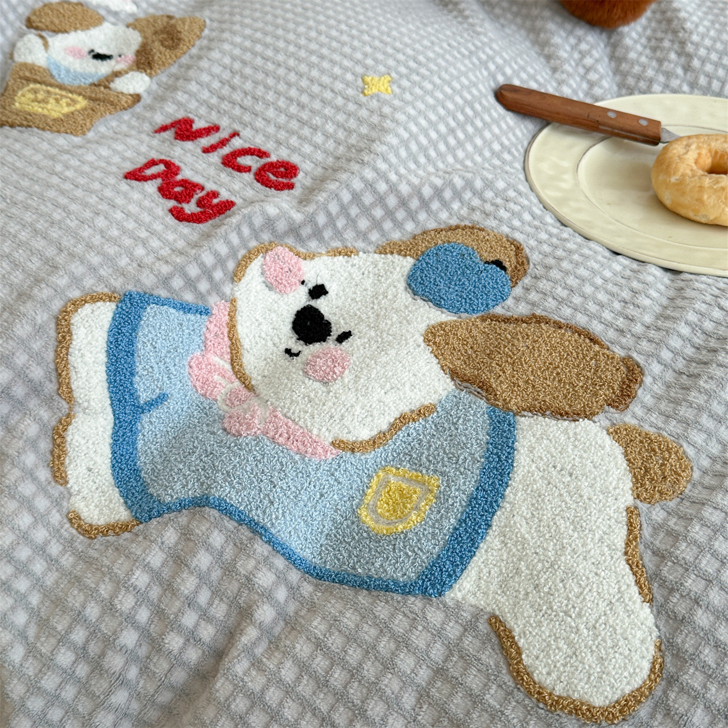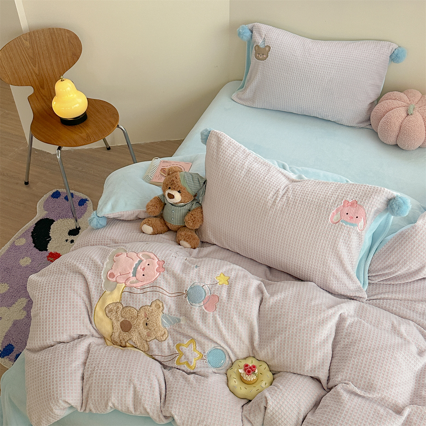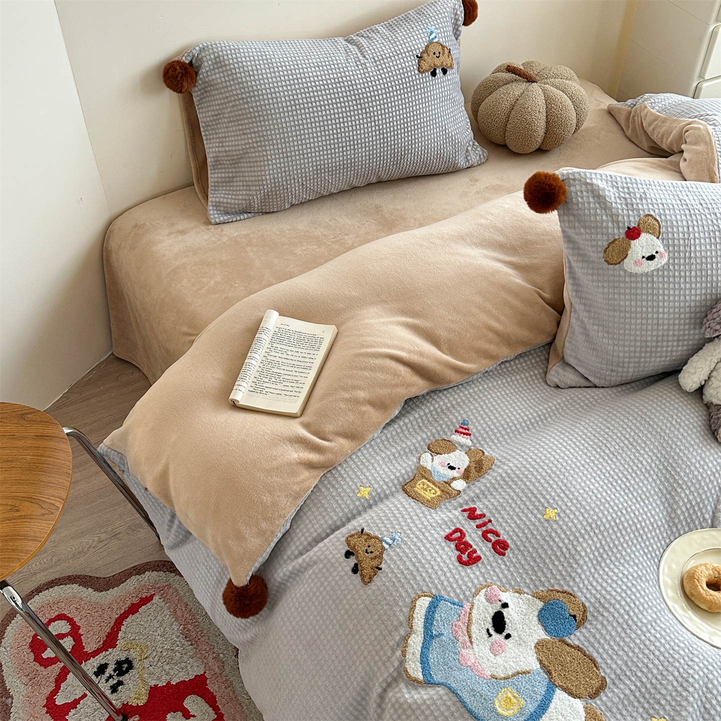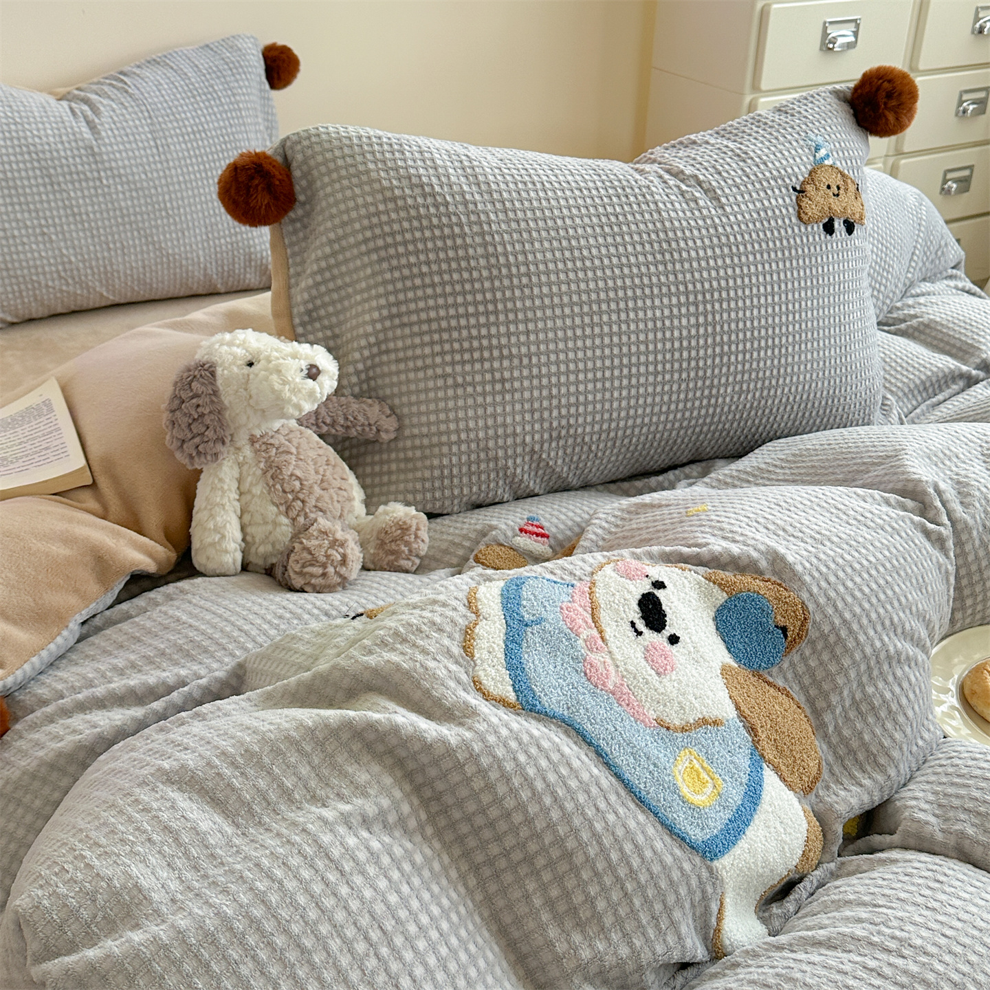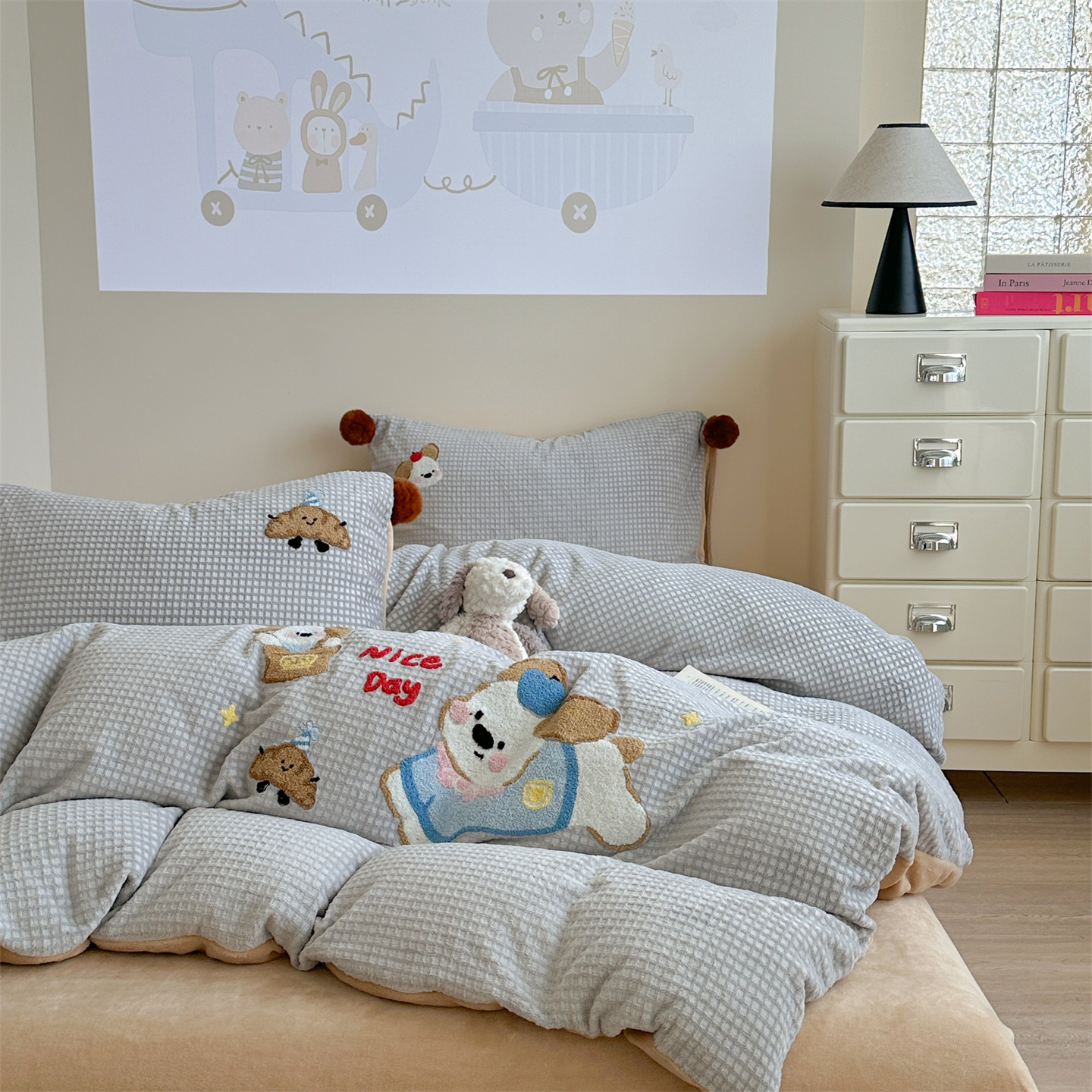 (总)柚子YOUTH 2025新款加厚牛奶绒卡通毛巾绣四件套-印加绣送同款毛毯,蛋糕小狗,公主猫,头套猫,兔兔花园,小伙伴,雪纳瑞