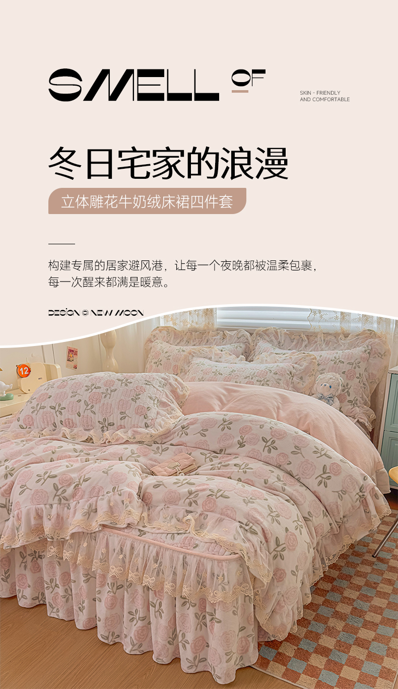 商品名称:家之硕家纺 2025新款立体雕花可拆洗牛奶绒单床裙系列 爱莎粉