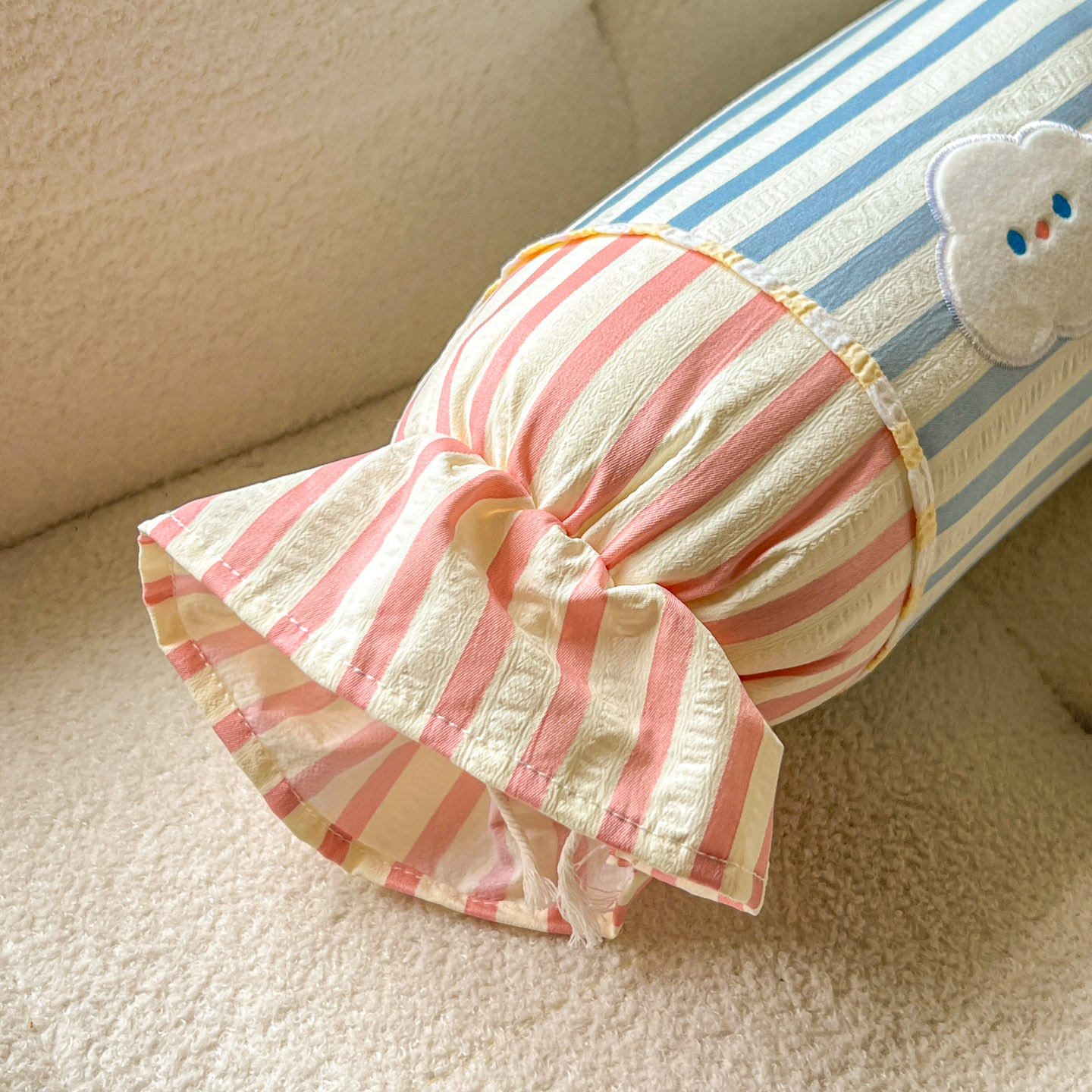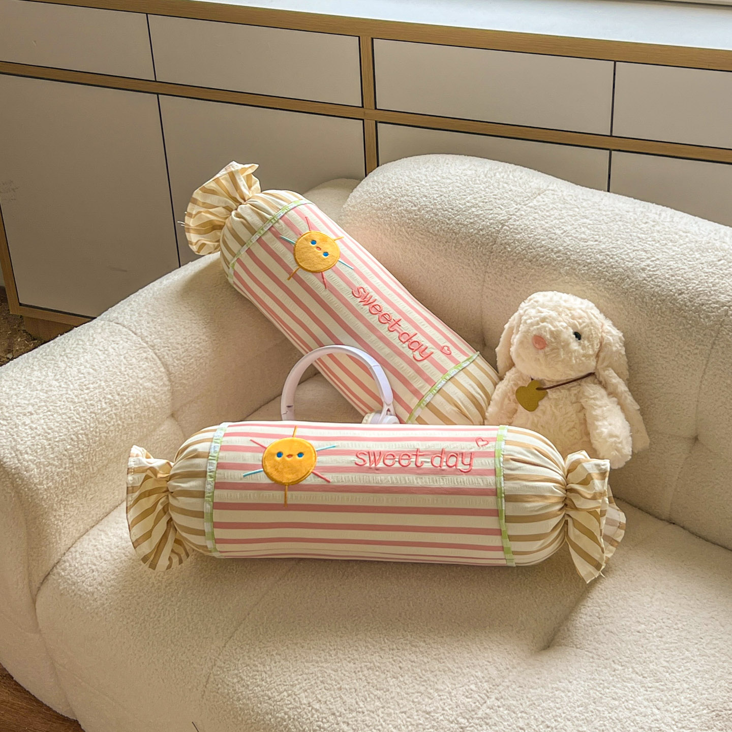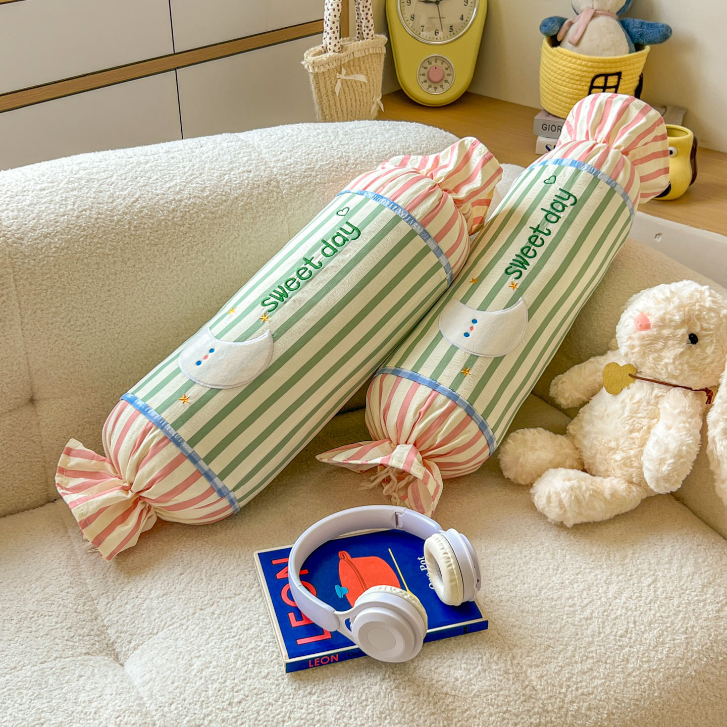 (总)希诺家居 2025新款ins奶油风奶糖枕糖果枕头枕芯,粉条纹太阳,黄条纹星星,蓝条纹云朵,绿条纹月亮,组合图