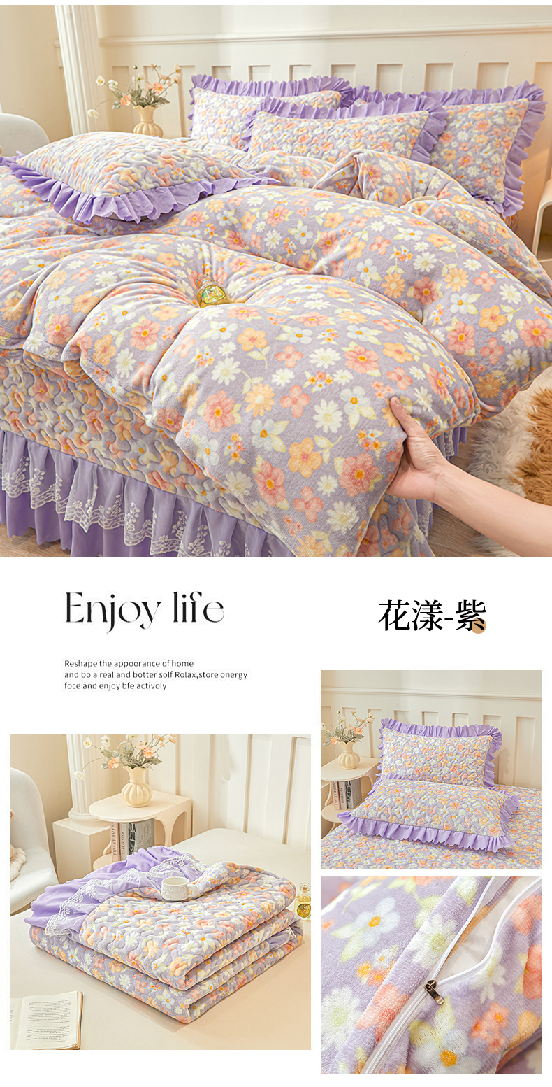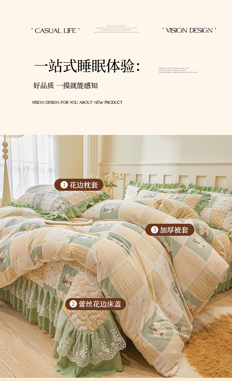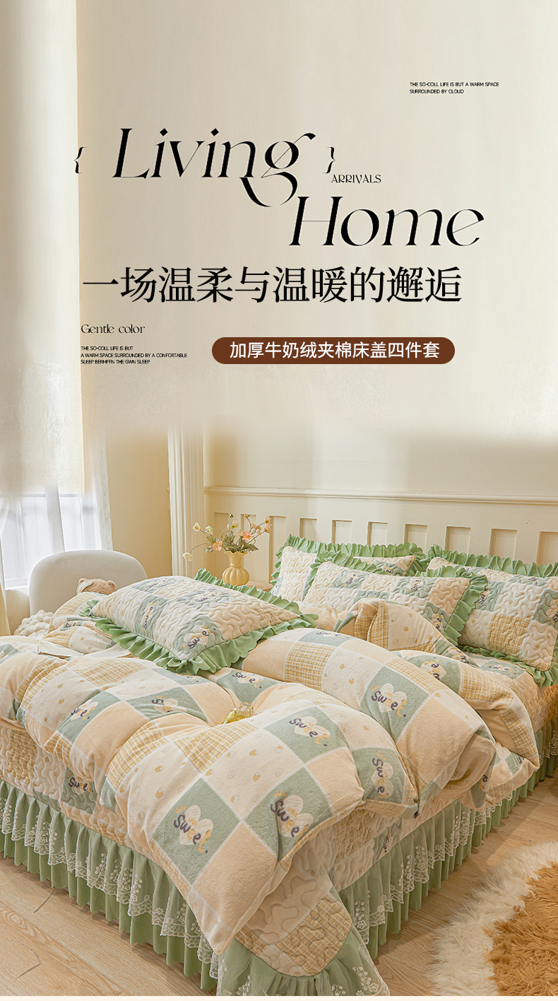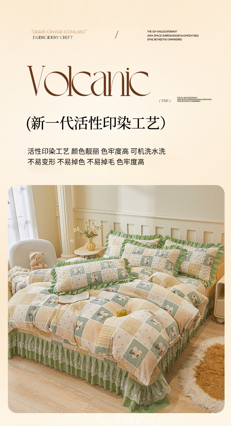 当前位置: 91家纺网 > 商品网购 > 床品套件 > 四件套 > 牛奶绒四件套 > 艾裙海 2025新款蕾丝边牛奶绒床盖四件套 梦想家-绿
