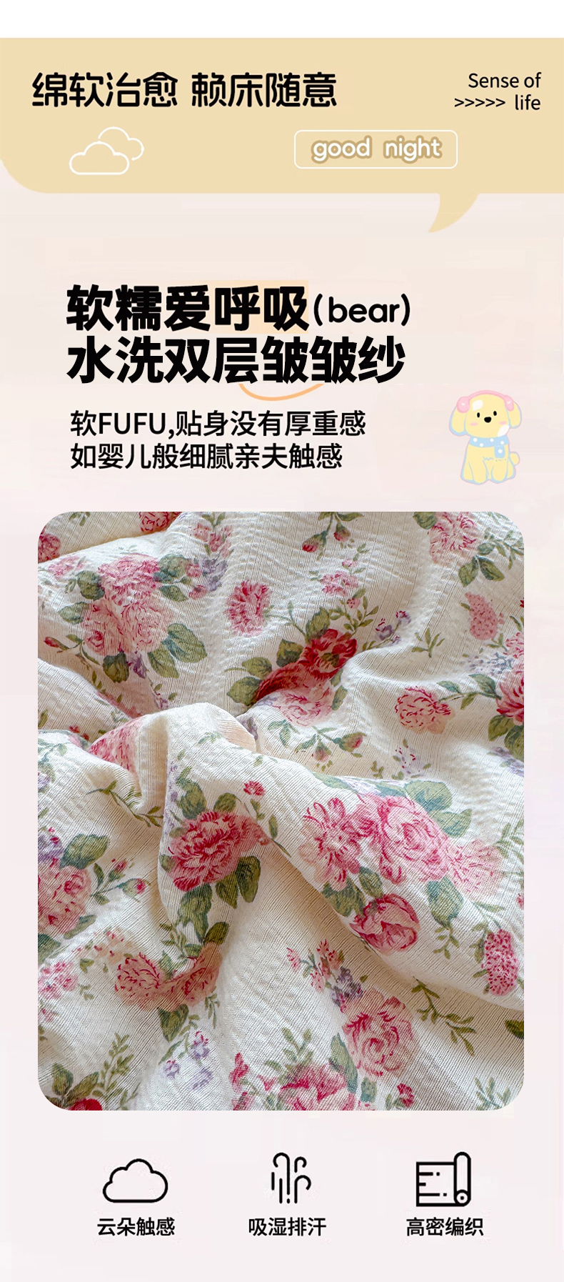 (总)桔禾家纺 2025新款小清新水洗棉有氧双层纱印花云感木棉皱皱纱四件套,春晓,蛋糕小狗,蝶恋,芳华,恋爱物语,满春庭,玫瑰心语,萌宠格子铺,萌宠来袭,千千结,巧克力饼干,斯兰,小确幸,小遇见,樱桃紫
