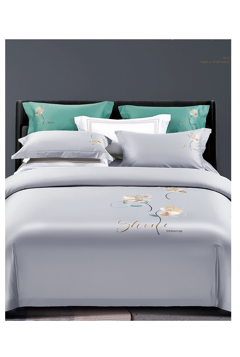 商品名称:浩情国际婚庆供货中心 2026新品- 秋冬高支密全棉长绒棉磨毛高端刺绣系列四件套 轻曼-银灰