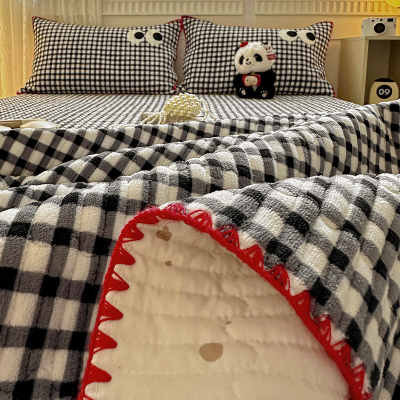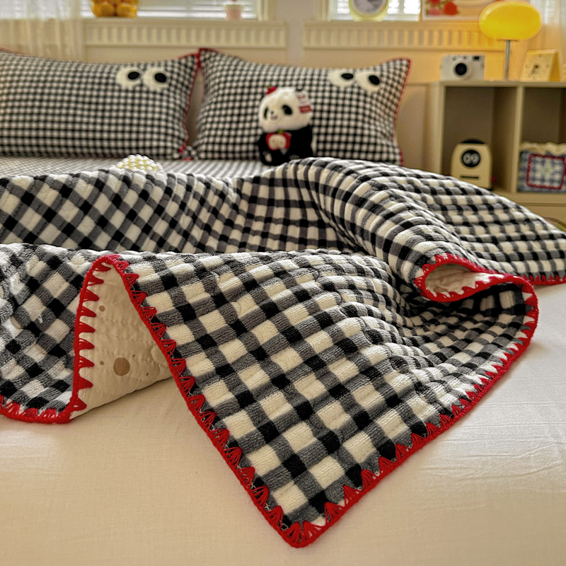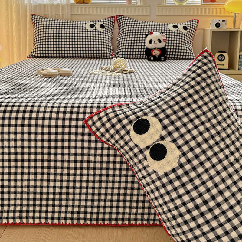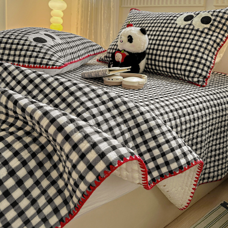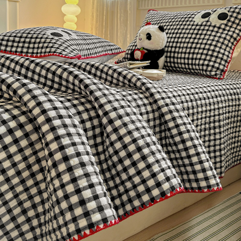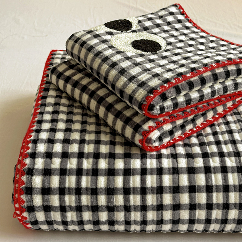 商品名称:格真 2025新款无印风贝壳绣三角针牛奶绒床盖三件套大眼萌枕套 黑白小格