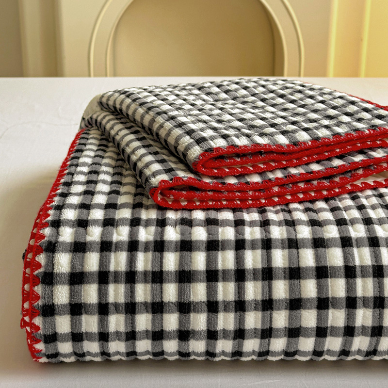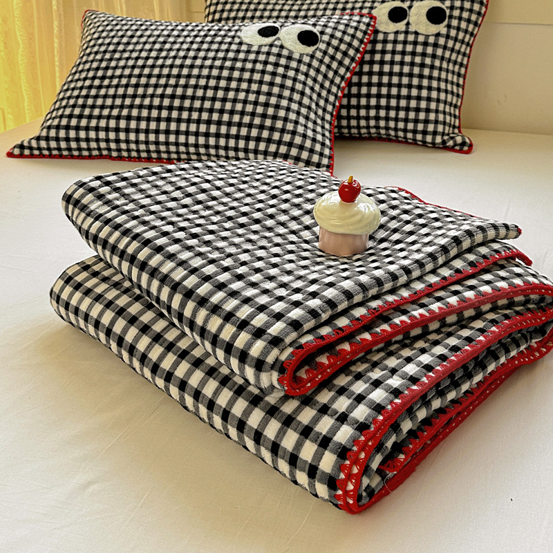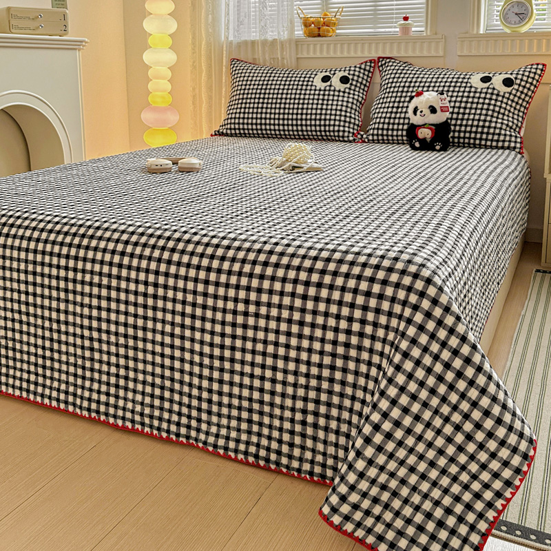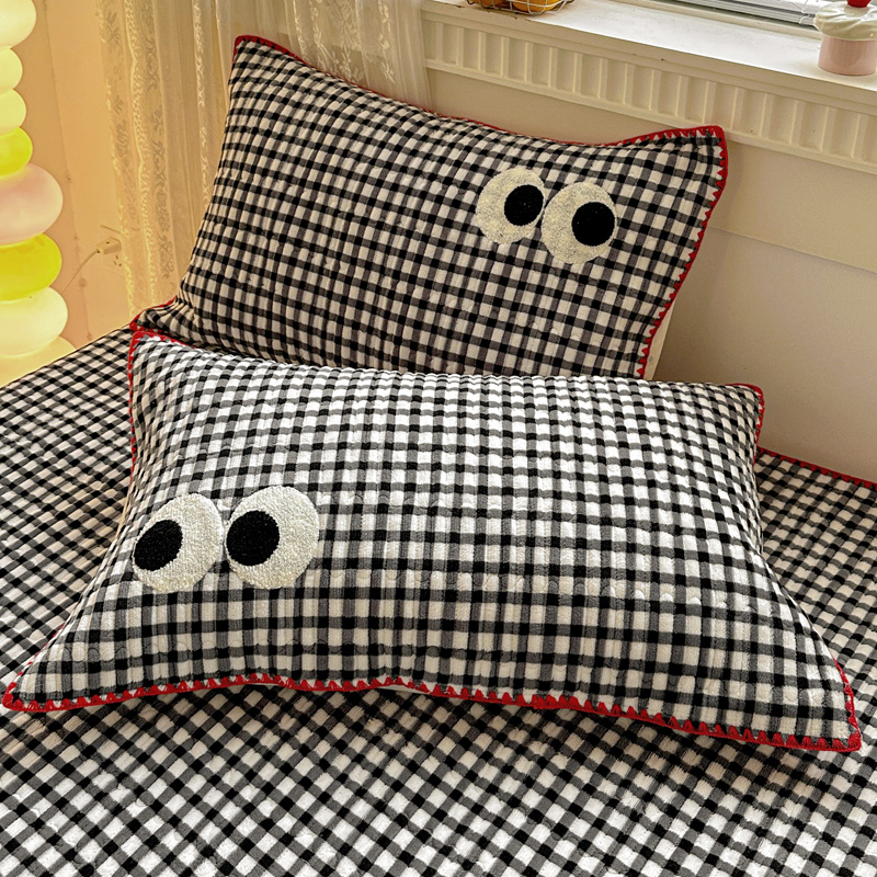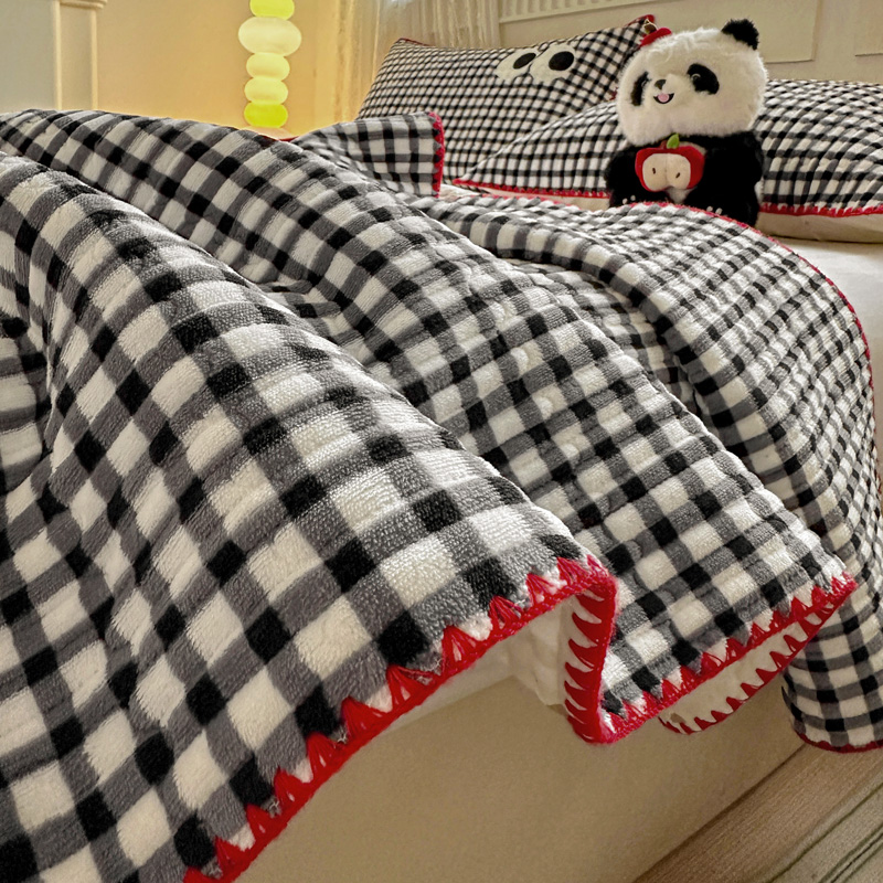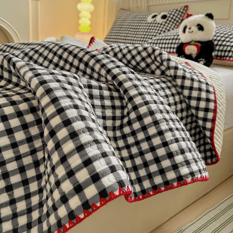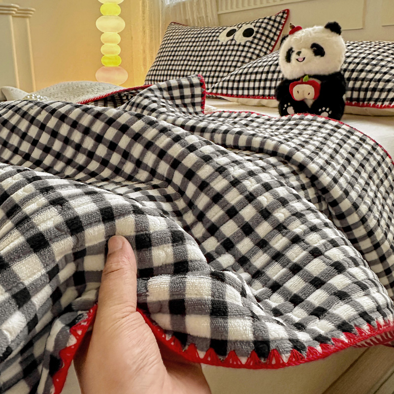 商品名称:格真 2025新款无印风贝壳绣三角针牛奶绒床盖三件套大眼萌枕套 黑白小格