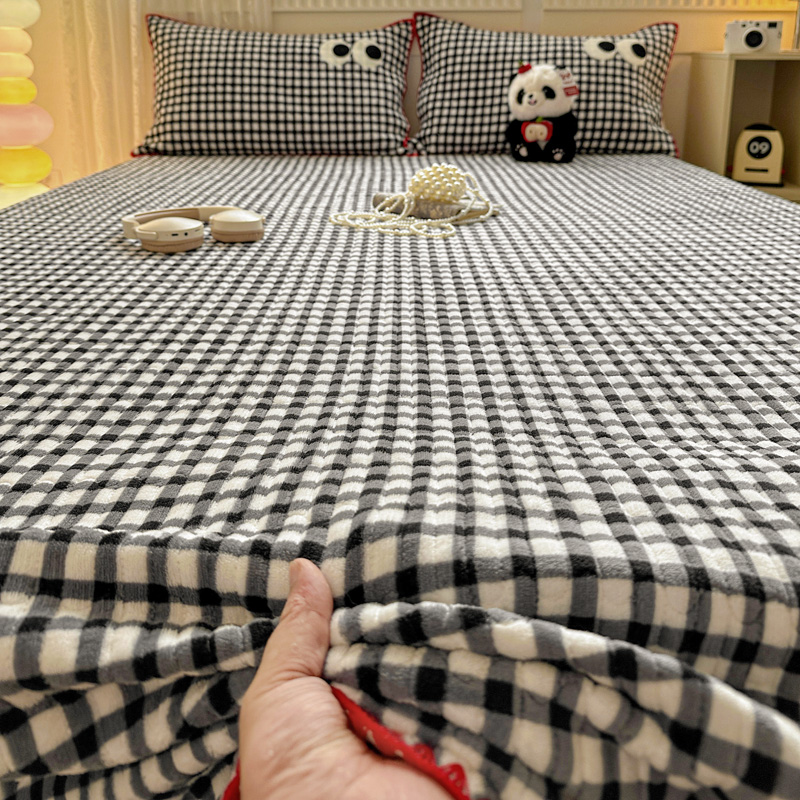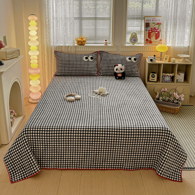 格真 2025新款无印风贝壳绣三角针牛奶绒床盖三件套大眼萌枕套 黑白小格