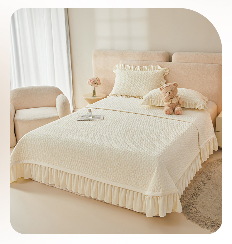 紫碧螺家纺 2025新款牛奶绒绗绣裙式床盖三件套 浅紫