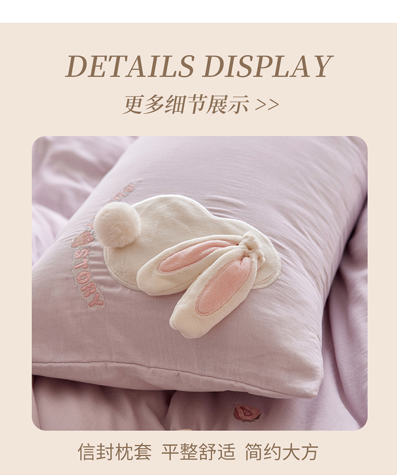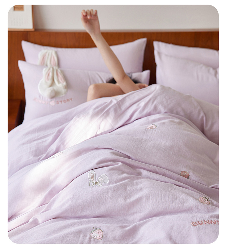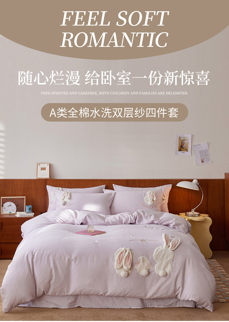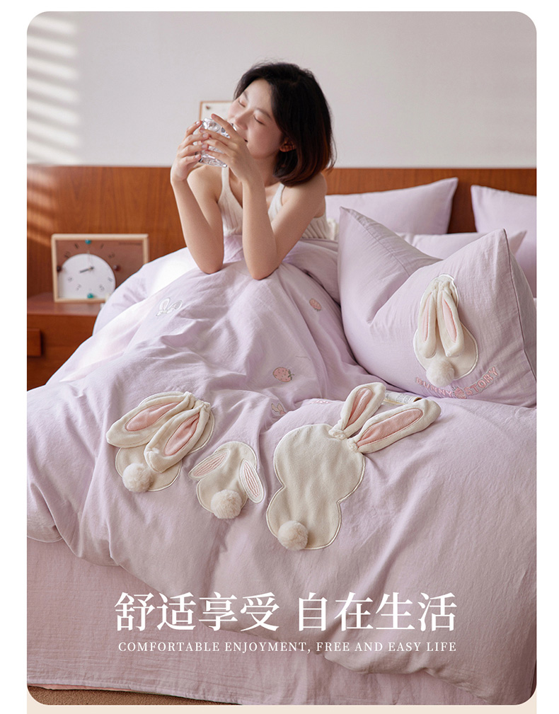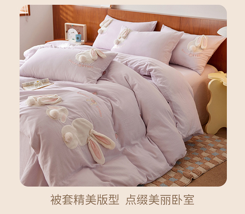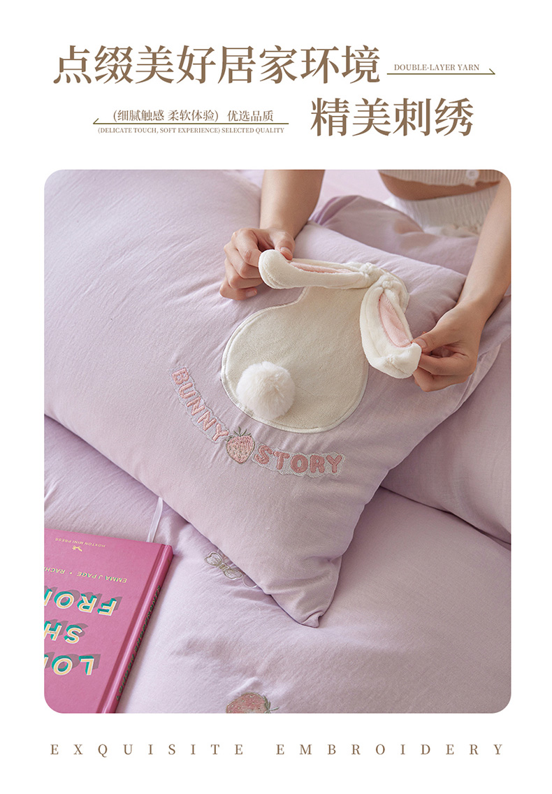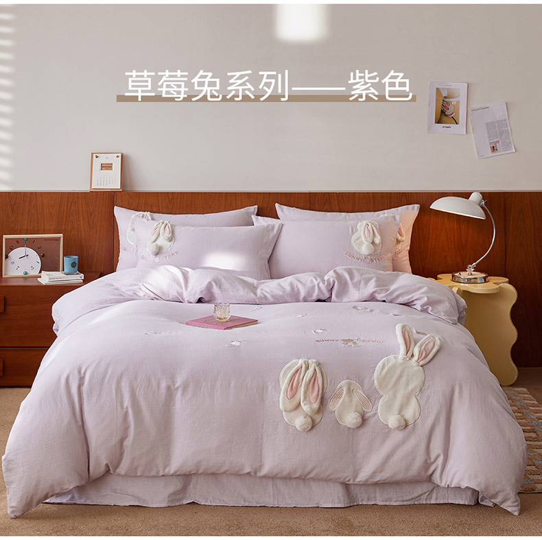 当前位置: 91家纺网 > 商品网购 > 床品套件 > 四件套 > 全棉普通四件套 > 爱缦 2025新款A类全棉水洗双层纱四件套-草莓兔系列(控价298起) 草莓兔-紫色