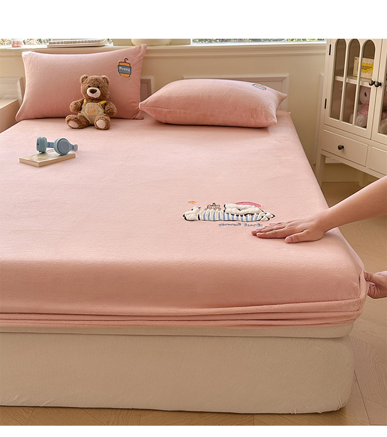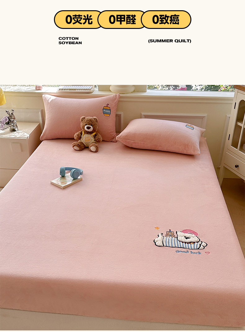 欣宜家纺 2025秋冬新款牛奶绒加厚保暖卡通贴布绣床笠三件套全包床单防滑床垫保护套-幸运萌犬 幸运萌犬灰