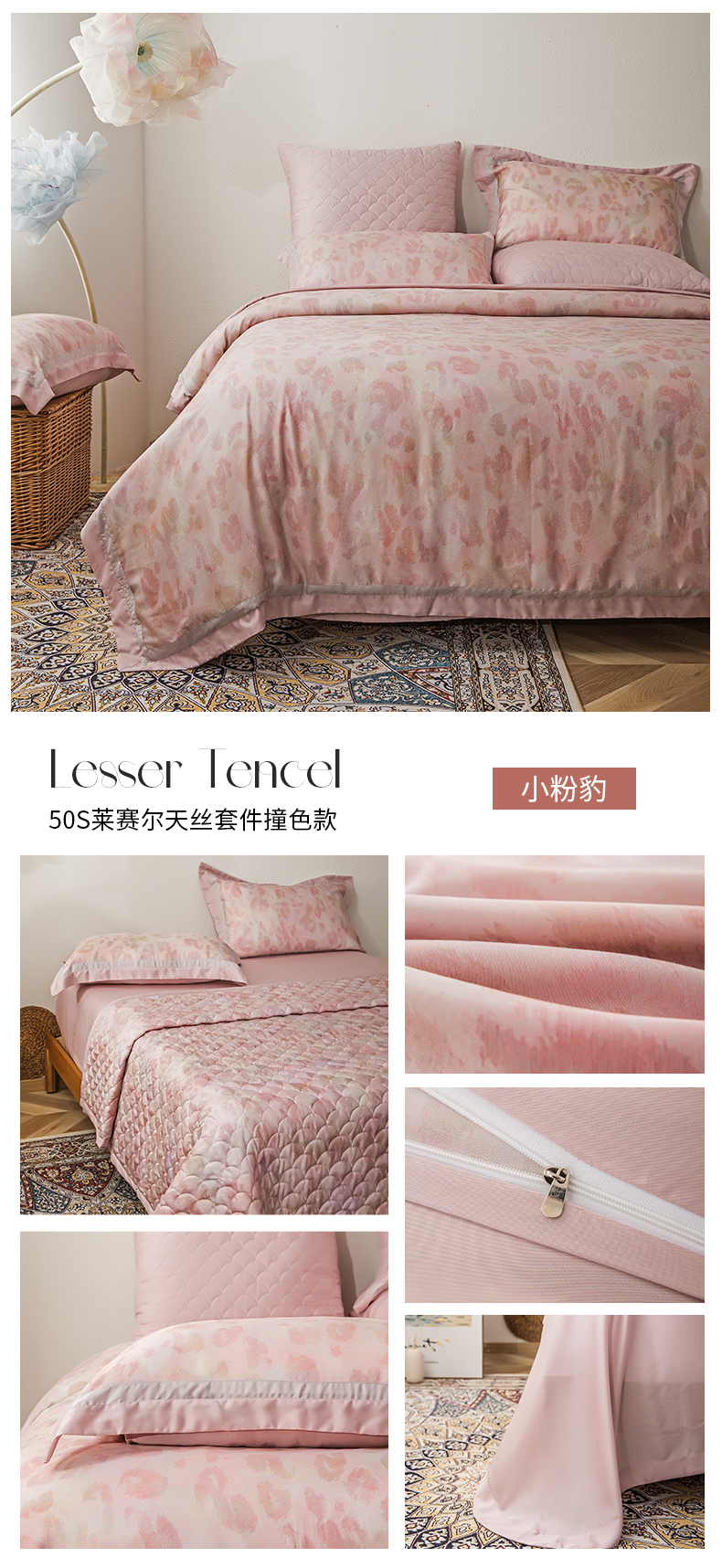 • 91家纺网 家纺一手货源 找家纺 恩和家纺 2026新款50s莱赛尔天丝床盖被轻奢撞色款四件套 绽放 山茶粉