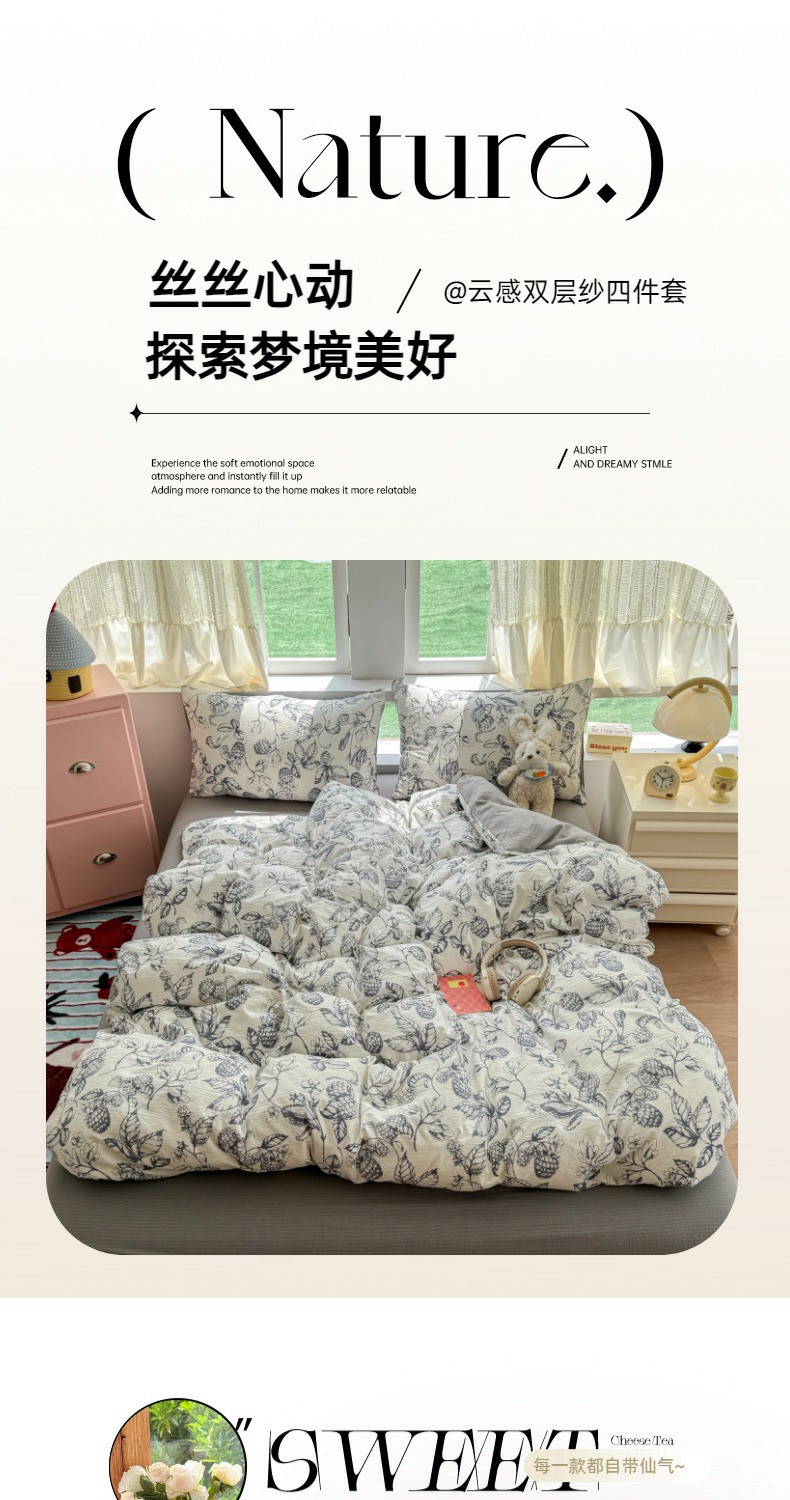 (总)温眠家纺 2026新款亲肤舒适甄选三层纱印花套件系列四件套,贩卖夏风-蓝,花丛点点猫,樱桃蝴蝶,蕾丝熊,葡萄腊肠狗,糖豆腊肠狗,星月天空,樱桃物语,雨爱,圆舞曲,芭乐米菲,彩波波,彩虹世界,动物团团,莓果结,梅森粉,莫奈-咖,沐风,秋月梨,小狗集合会,小黑豆,小花点点,幸运星,南瓜派,复古修狗,碱水结,蓝莓小猫,玫瑰夜-绿