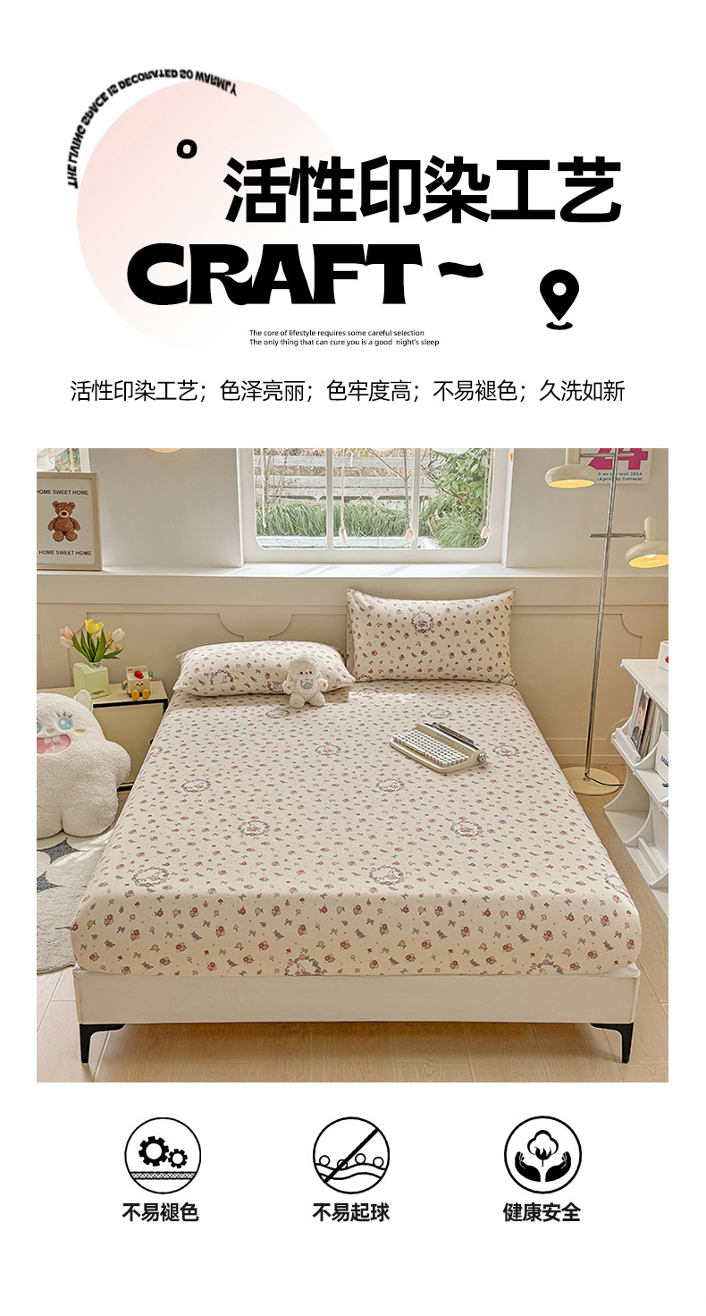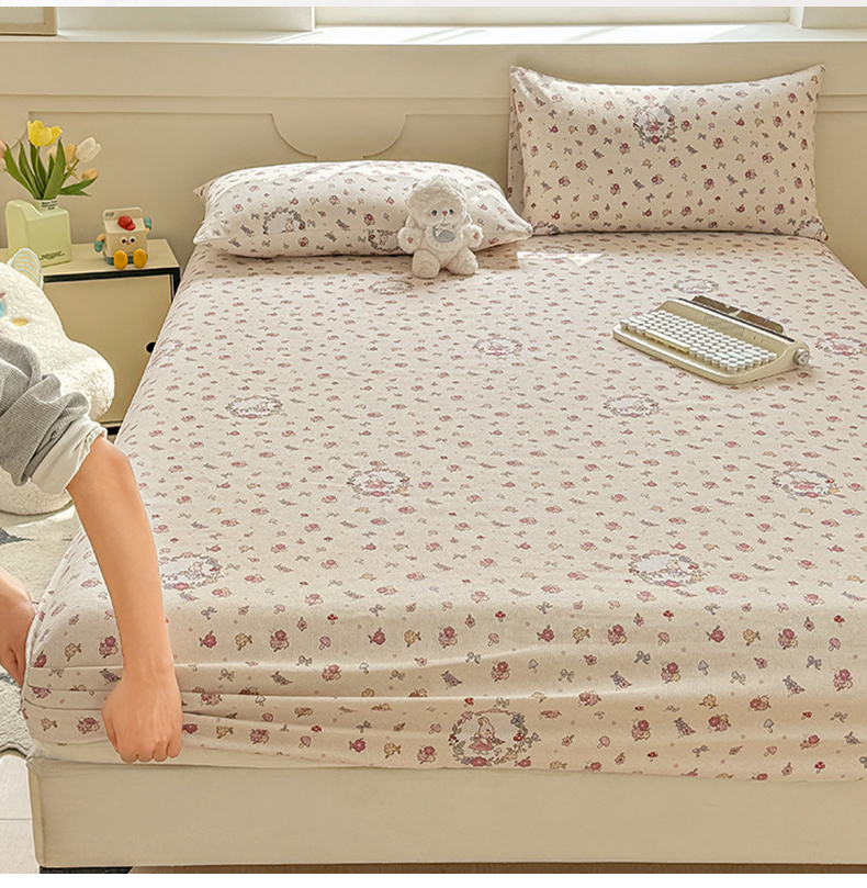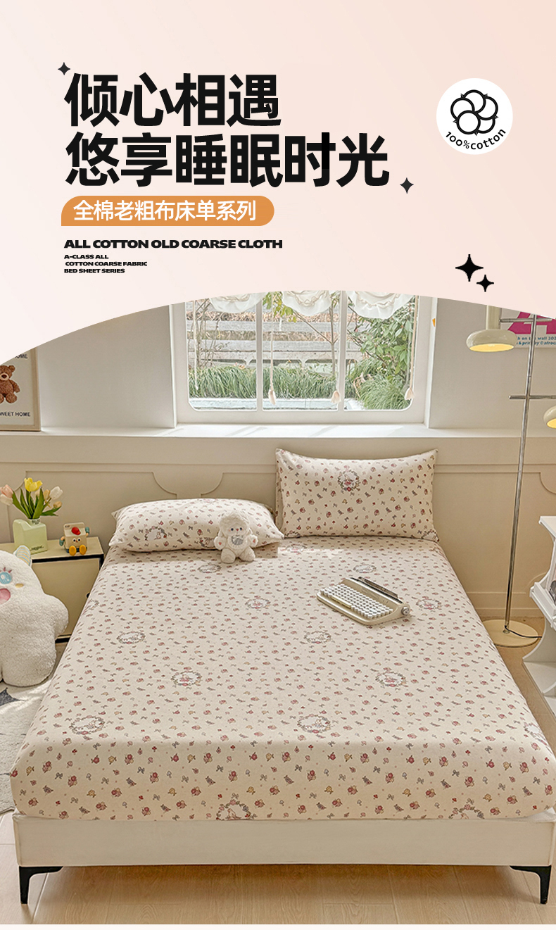 爱彼家纺 2026新款舒适透气老粗布凉席印花床笠单件-床笠三件套 老粗布床笠-白朵花园