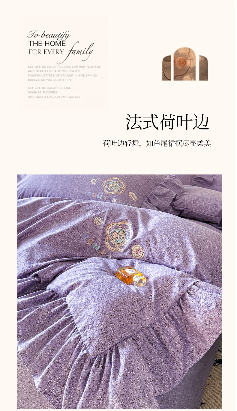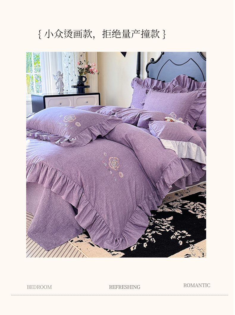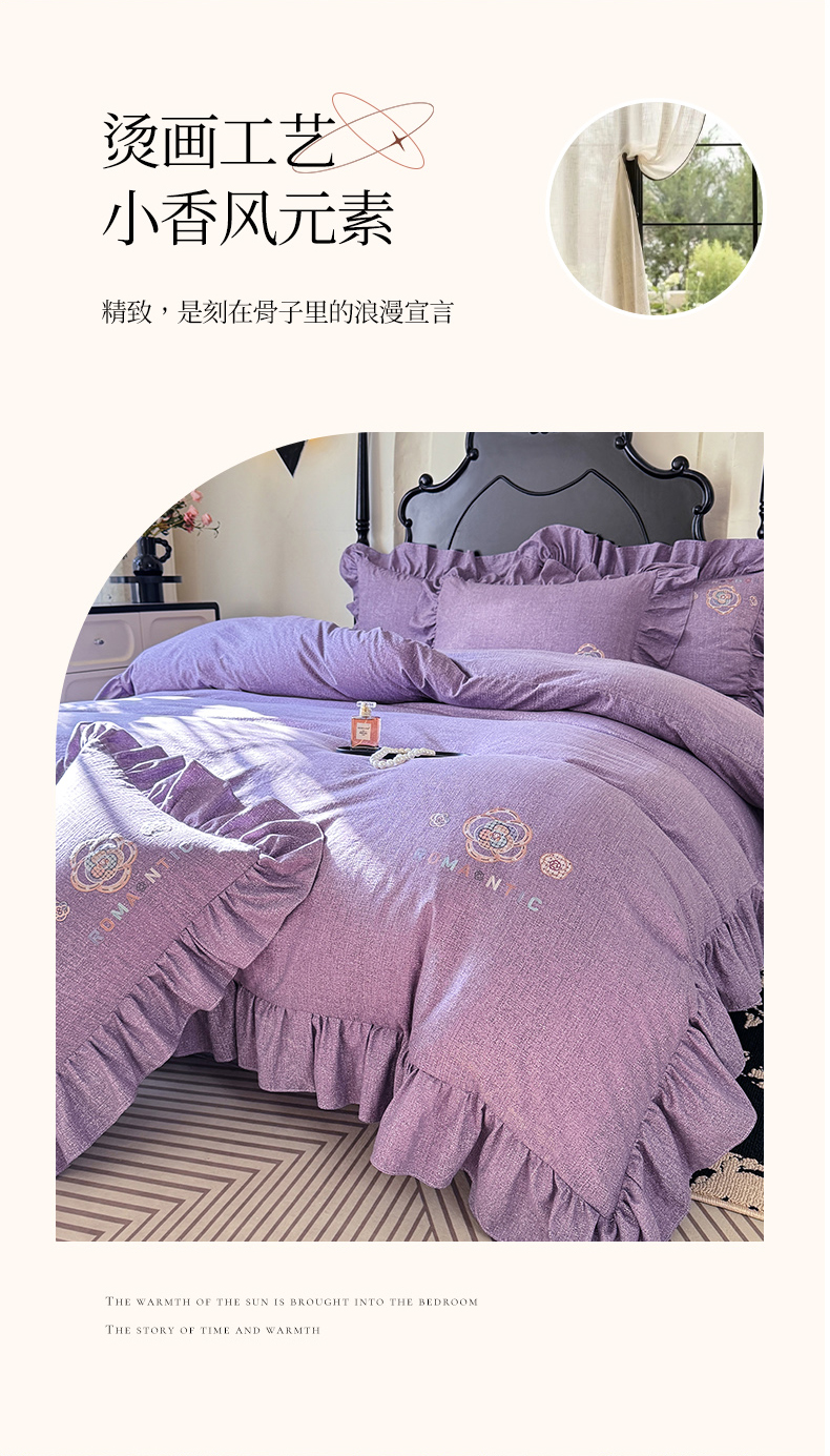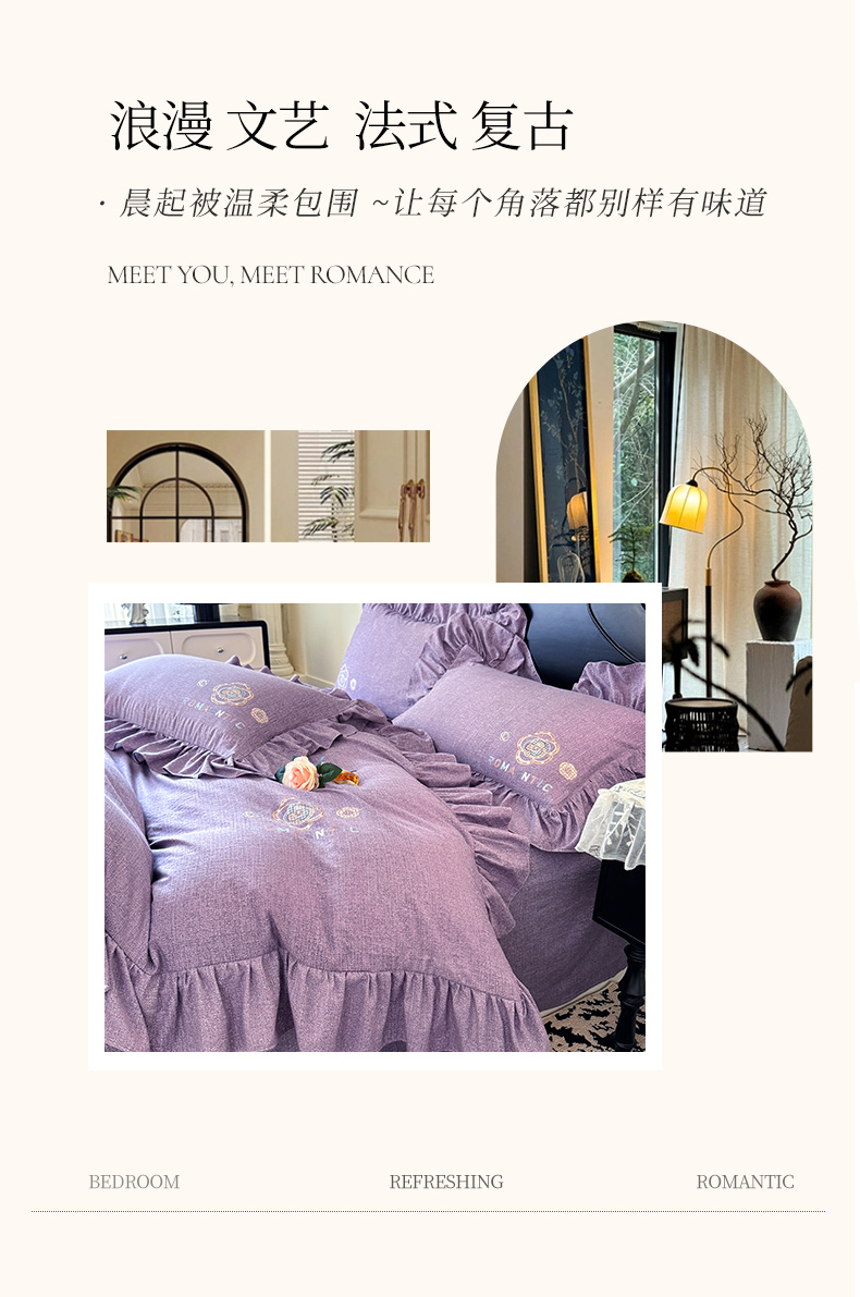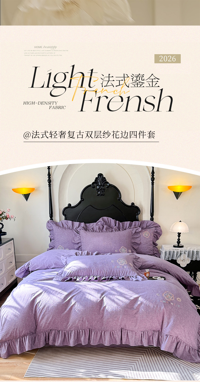 当前位置: 91家纺网 > 商品网购 > 床品套件 > 四件套 > 其它四件套 > 贝凯瑞 2026新款法式轻奢复古仿亚麻木棉皱皱棉双层纱花边四件套-鎏光系列 紫晶典藏
