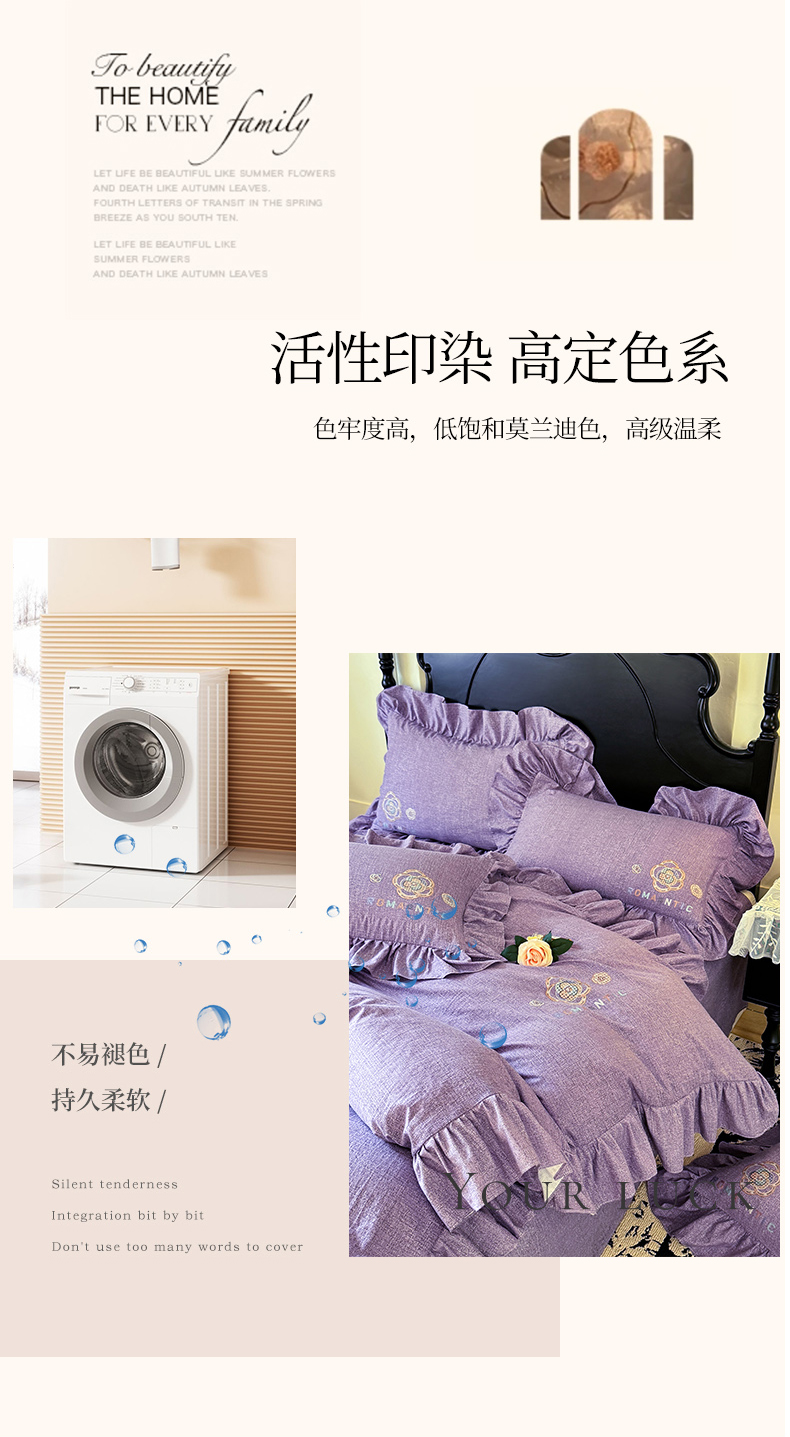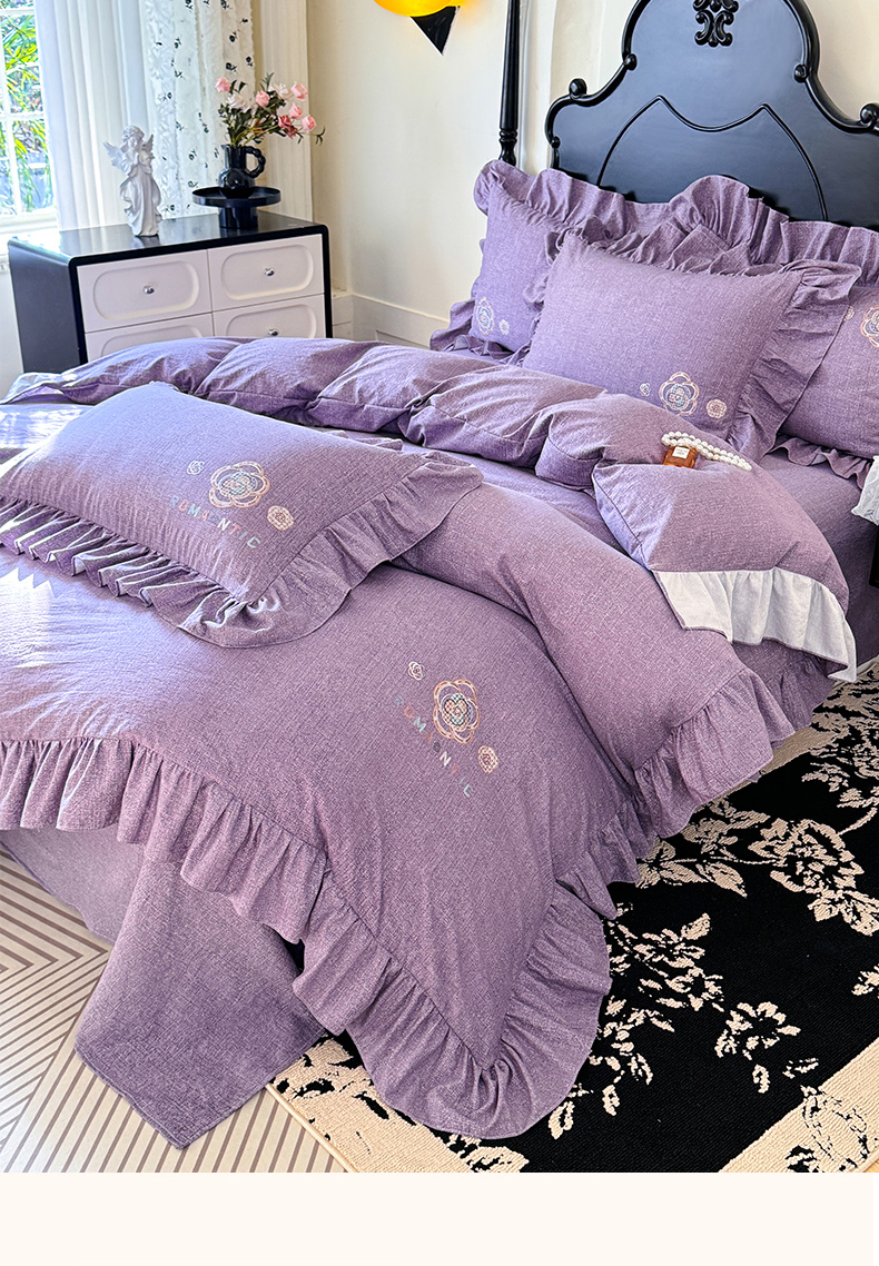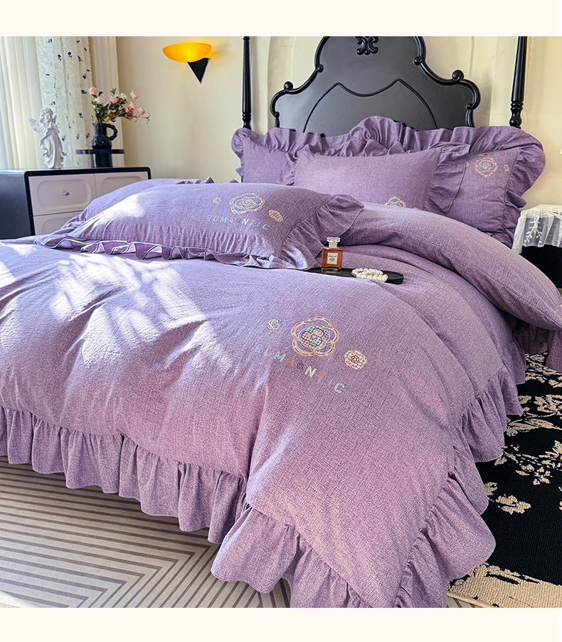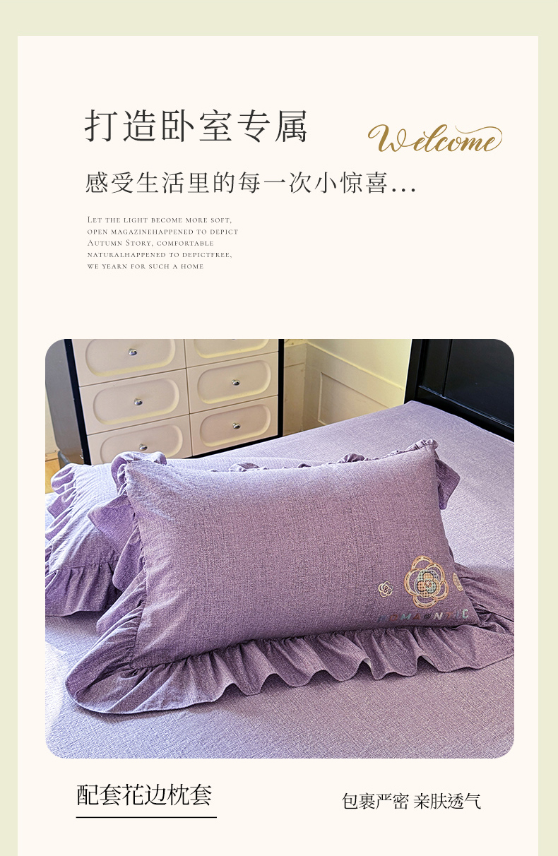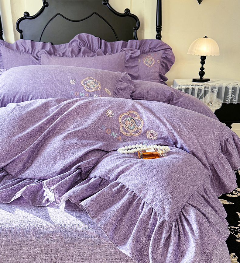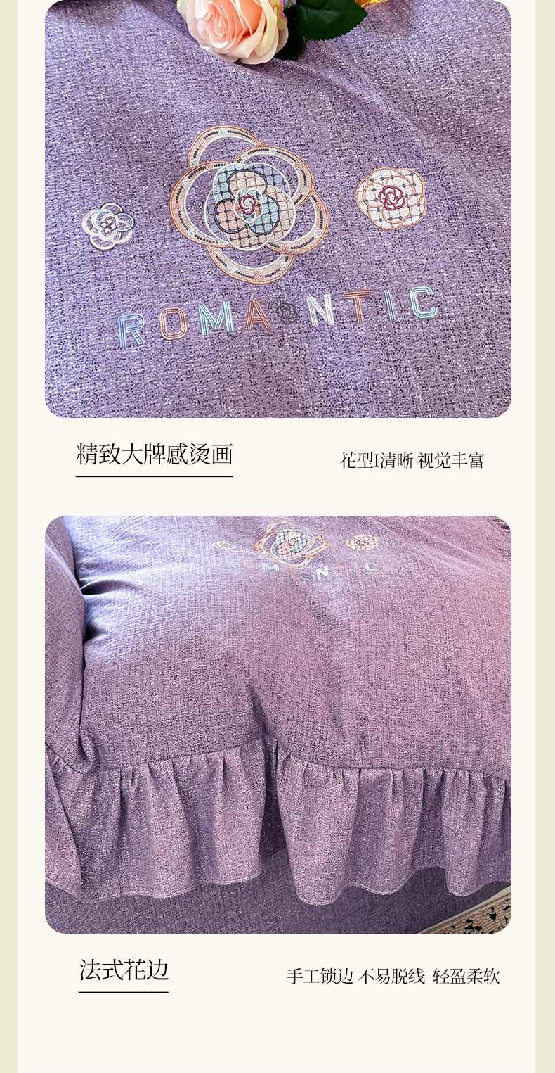 当前位置: 91家纺网 > 商品网购 > 床品套件 > 四件套 > 其它四件套 > 贝凯瑞 2026新款法式轻奢复古仿亚麻木棉皱皱棉双层纱花边四件套-鎏光系列 紫晶典藏
