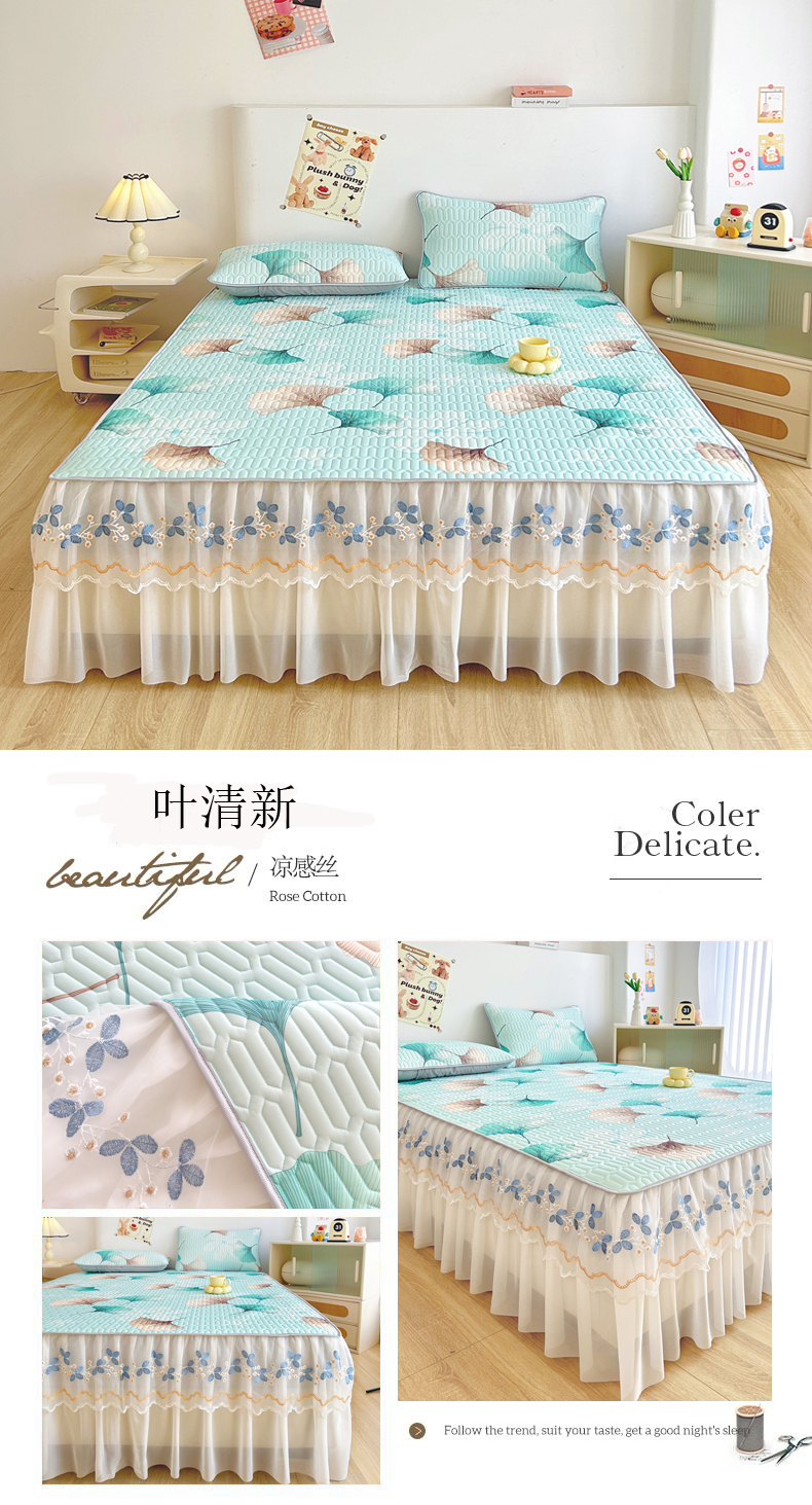 (总)能好家纺 2026春夏新款纯色+印花凉感丝乳胶凉席床裙款三件套,薄荷绿,豆沙,灰色,酒红,孔雀蓝,墨绿,雪青,棕色,古韵,小熊,雅韵,幽梦