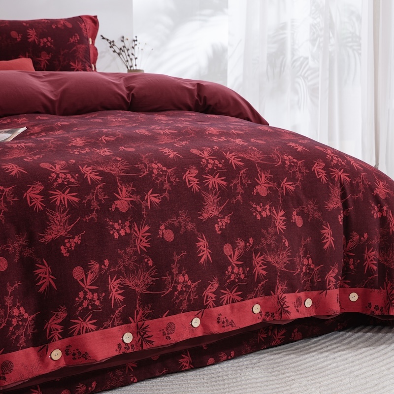商品名称:(总)仰望棉麻双层纱供应链 2026新款邻家小院黑红全棉色织提花纽扣款四件套