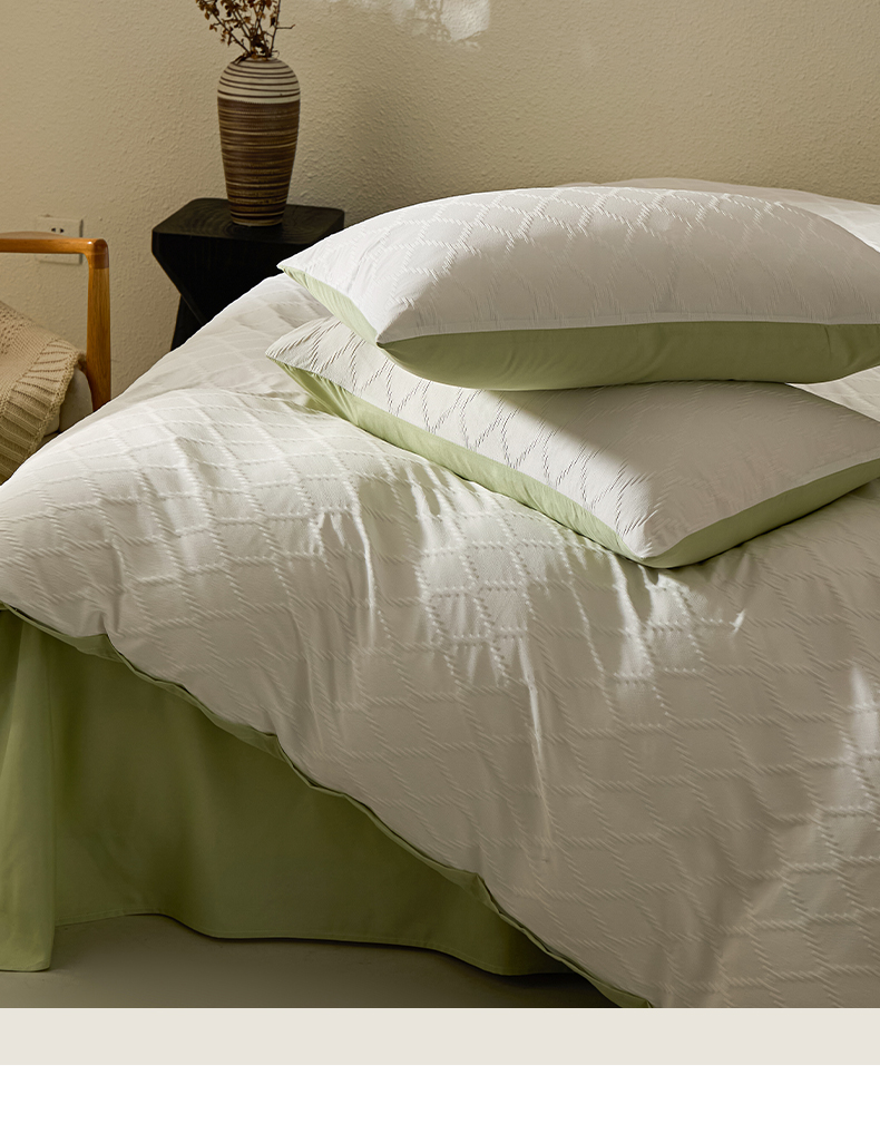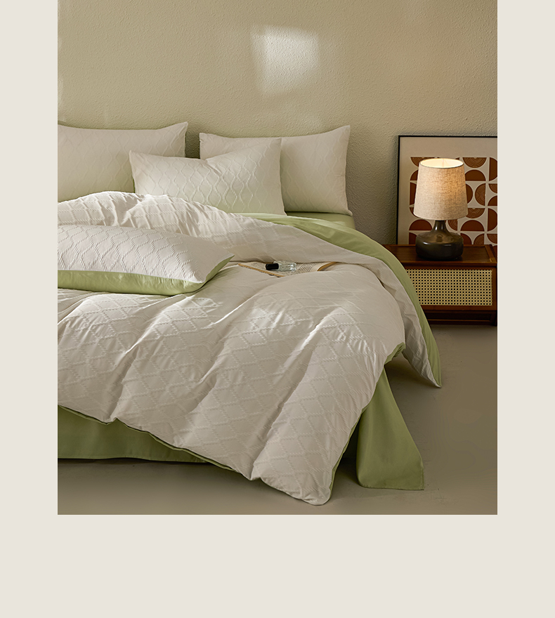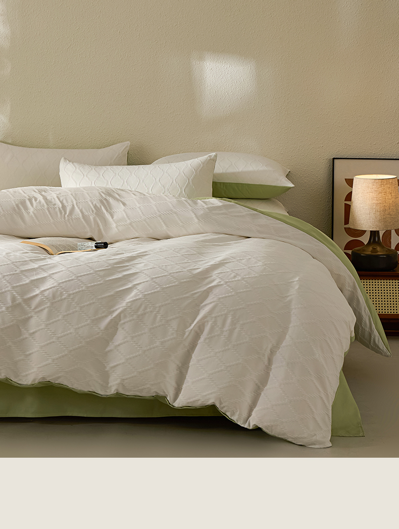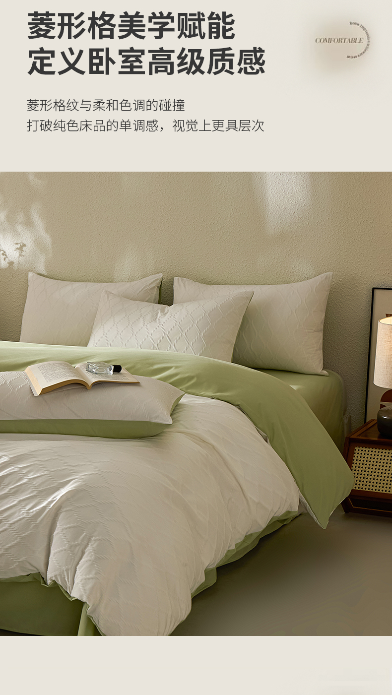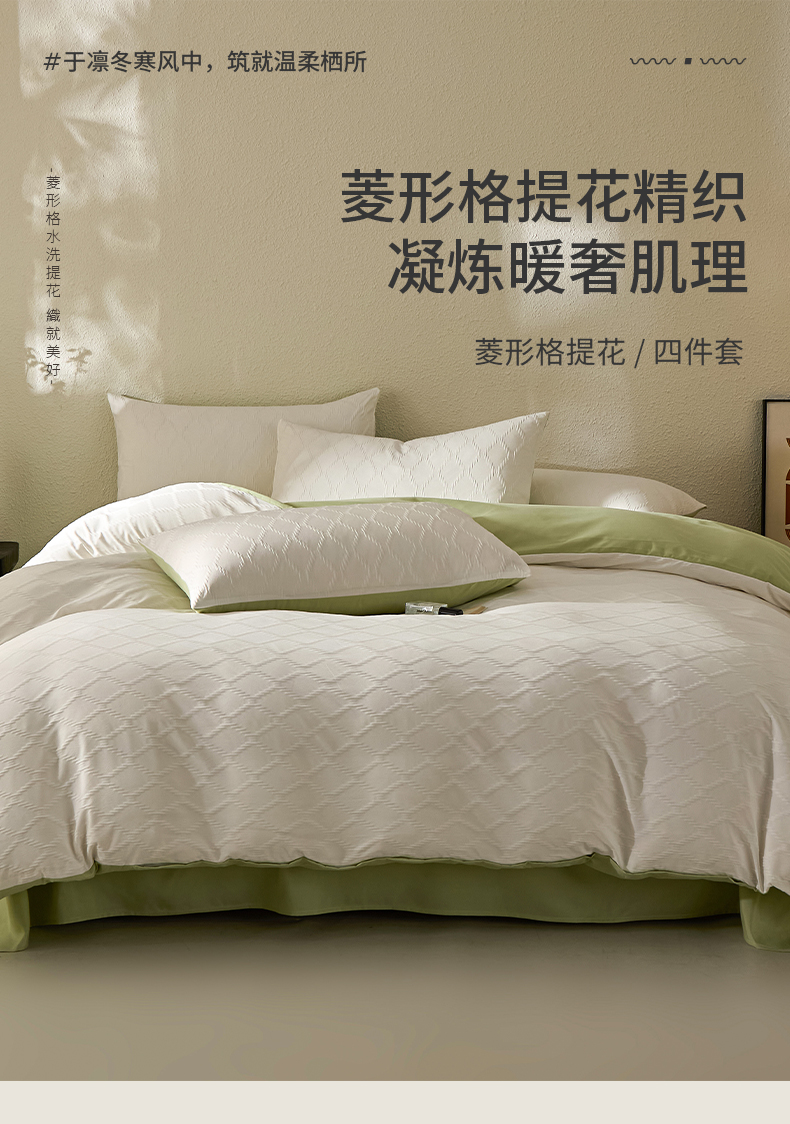 当前位置: 91家纺网 > 商品网购 > 床品套件 > 四件套 > 其它四件套 > 悦织湾家纺 2026新款超柔菱形格提花四件套轻奢纯色时尚学生宿舍床单床笠款三四件套单被套 菱形格-奶白+果绿