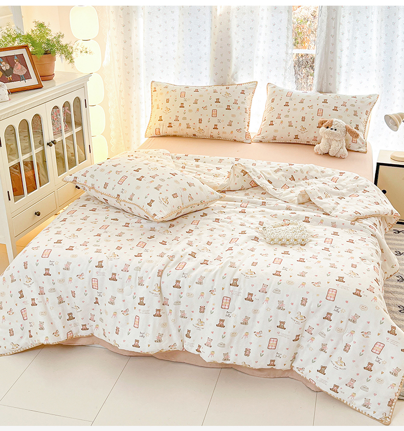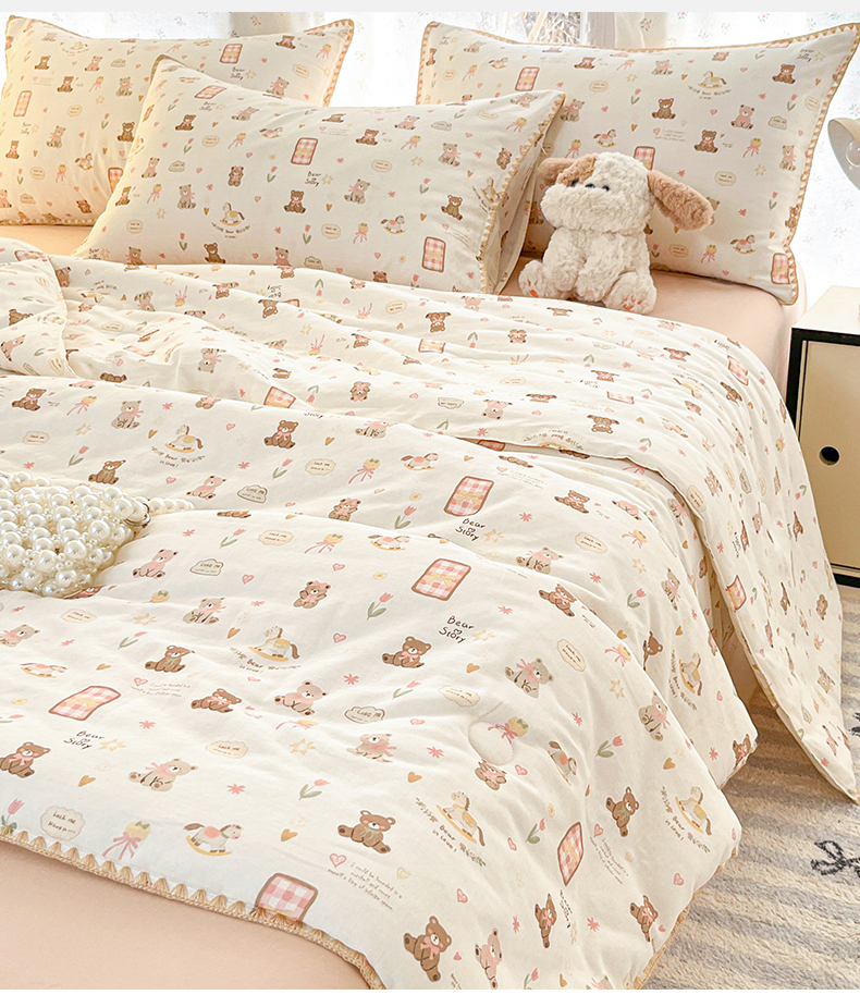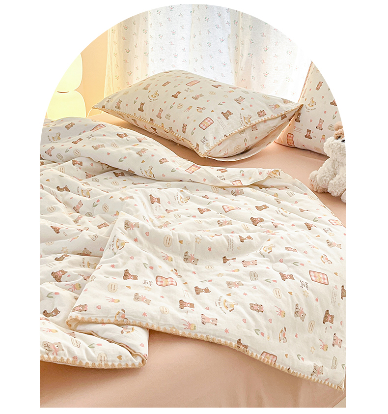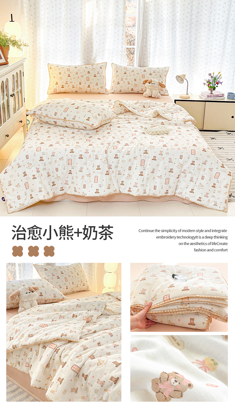 • 91家纺网 家纺一手货源 找家纺 盛秋家纺 2026新款三角针水洗棉贝壳边印花夏被系列 治愈小熊+奶茶