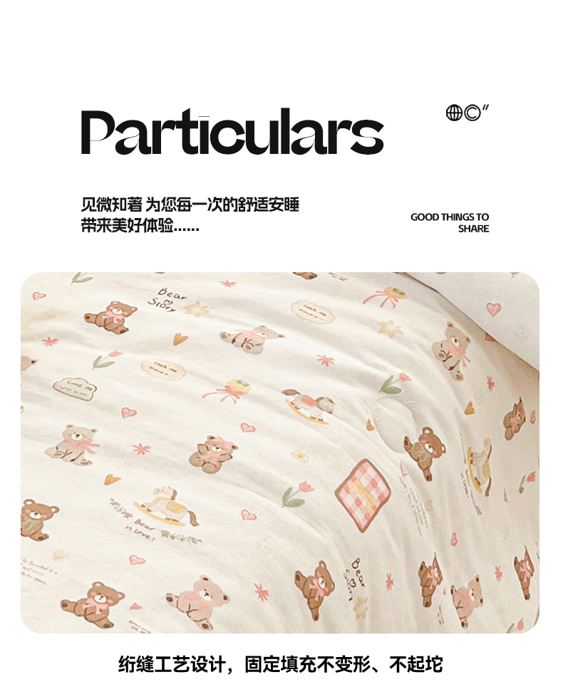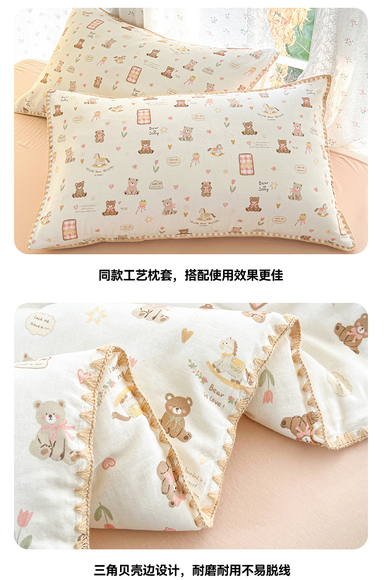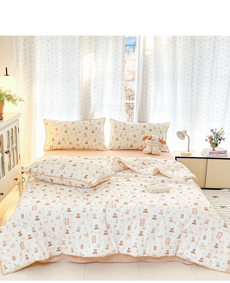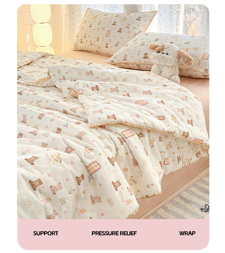 • 91家纺网 家纺一手货源 找家纺 盛秋家纺 2026新款三角针水洗棉贝壳边印花夏被系列 治愈小熊+奶茶