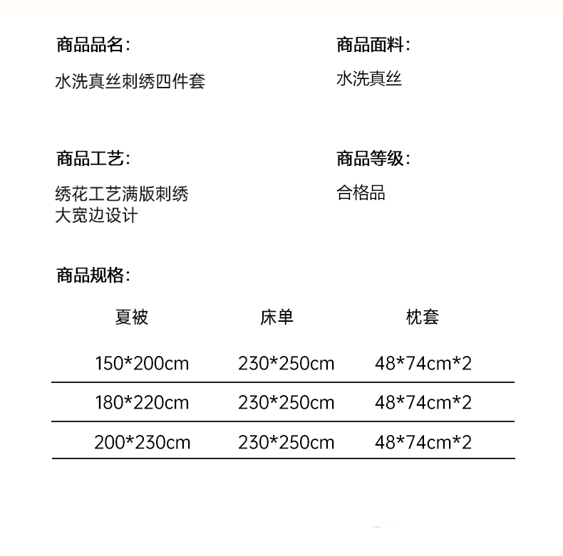 [{"sp_id":1,"sp_name":"\u989c\u8272","sp_format":2,"sp_list":[{"sp_value_id":477,"sp_value_name":"\u82b1\u6735\u5976\u767d\u7c89","sp_value_image":{"id":999,"path":"https:\/\/img3.91jf.com\/ghelp\/2026\/20260305\/20260305154402_331914.jpeg"},"sp_value_video":{"id":0,"img":"","path":"","time":0,"download_num":0,"play_num":0},"price":"36.00","storage":8999,"weight":"1.000","is_check_weight":0,"plus_price":"","sp_sort":22}]},{"sp_id":27,"sp_name":"\u5c3a\u5bf8","sp_format":1,"sp_list":[{"sp_value_id":302,"sp_value_name":"150x200cm\u5355\u590f\u88ab","sp_value_image":{"id":0,"path":""},"sp_value_video":{"id":0,"img":"","path":"","time":0,"download_num":0,"play_num":0},"price":"36.00","storage":500,"weight":"1.000","is_check_weight":0,"plus_price":"","sp_sort":5},{"sp_value_id":303,"sp_value_name":"180x200cm\u5355\u590f\u88ab","sp_value_image":{"id":0,"path":""},"sp_value_video":{"id":0,"img":"","path":"","time":0,"download_num":0,"play_num":0},"price":"41.00","storage":500,"weight":"1.300","is_check_weight":0,"plus_price":"","sp_sort":6},{"sp_value_id":304,"sp_value_name":"200x230cm\u5355\u590f\u88ab","sp_value_image":{"id":0,"path":""},"sp_value_video":{"id":0,"img":"","path":"","time":0,"download_num":0,"play_num":0},"price":"45.00","storage":499,"weight":"1.500","is_check_weight":0,"plus_price":"","sp_sort":7},{"sp_value_id":305,"sp_value_name":"150x200cm\u5355\u590f\u88ab+\u6795\u5957\u4e00\u5bf9","sp_value_image":{"id":0,"path":""},"sp_value_video":{"id":0,"img":"","path":"","time":0,"download_num":0,"play_num":0},"price":"51.00","storage":500,"weight":"1.200","is_check_weight":0,"plus_price":"","sp_sort":8},{"sp_value_id":306,"sp_value_name":"180x200cm\u5355\u590f\u88ab+\u6795\u5957\u4e00\u5bf9","sp_value_image":{"id":0,"path":""},"sp_value_video":{"id":0,"img":"","path":"","time":0,"download_num":0,"play_num":0},"price":"56.00","storage":500,"weight":"1.500","is_check_weight":0,"plus_price":"","sp_sort":9},{"sp_value_id":307,"sp_value_name":"200x230cm\u5355\u590f\u88ab+\u6795\u5957\u4e00\u5bf9","sp_value_image":{"id":0,"path":""},"sp_value_video":{"id":0,"img":"","path":"","time":0,"download_num":0,"play_num":0},"price":"61.00","storage":500,"weight":"1.700","is_check_weight":0,"plus_price":"","sp_sort":10},{"sp_value_id":308,"sp_value_name":"150x200cm\u590f\u88ab\u56db\u4ef6\u5957","sp_value_image":{"id":0,"path":""},"sp_value_video":{"id":0,"img":"","path":"","time":0,"download_num":0,"play_num":0},"price":"63.00","storage":500,"weight":"1.800","is_check_weight":0,"plus_price":"","sp_sort":11},{"sp_value_id":309,"sp_value_name":"180x200cm\u590f\u88ab\u56db\u4ef6\u5957","sp_value_image":{"id":0,"path":""},"sp_value_video":{"id":0,"img":"","path":"","time":0,"download_num":0,"play_num":0},"price":"67.00","storage":500,"weight":"2.100","is_check_weight":0,"plus_price":"","sp_sort":12},{"sp_value_id":310,"sp_value_name":"200x230cm\u590f\u88ab\u56db\u4ef6\u5957","sp_value_image":{"id":0,"path":""},"sp_value_video":{"id":0,"img":"","path":"","time":0,"download_num":0,"play_num":0},"price":"70.00","storage":500,"weight":"2.300","is_check_weight":0,"plus_price":"","sp_sort":13},{"sp_value_id":311,"sp_value_name":"\u5e8a\u5355","sp_value_image":{"id":0,"path":""},"sp_value_video":{"id":0,"img":"","path":"","time":0,"download_num":0,"play_num":0},"price":"20.00","storage":500,"weight":"0.800","is_check_weight":0,"plus_price":"","sp_sort":14},{"sp_value_id":312,"sp_value_name":"\u6795\u5957\u4e00\u5bf9","sp_value_image":{"id":0,"path":""},"sp_value_video":{"id":0,"img":"","path":"","time":0,"download_num":0,"play_num":0},"price":"15.00","storage":500,"weight":"0.300","is_check_weight":0,"plus_price":"","sp_sort":15},{"sp_value_id":313,"sp_value_name":"1.5m\u5e8a\u7b20\u6b3e\u590f\u88ab\u56db\u4ef6\u5957-\u590f\u88ab150x200cm","sp_value_image":{"id":0,"path":""},"sp_value_video":{"id":0,"img":"","path":"","time":0,"download_num":0,"play_num":0},"price":"73.00","storage":500,"weight":"1.800","is_check_weight":0,"plus_price":"","sp_sort":16},{"sp_value_id":314,"sp_value_name":"1.8m\u5e8a\u7b20\u6b3e\u590f\u88ab\u56db\u4ef6\u5957-\u590f\u88ab150x200cm","sp_value_image":{"id":0,"path":""},"sp_value_video":{"id":0,"img":"","path":"","time":0,"download_num":0,"play_num":0},"price":"73.00","storage":500,"weight":"1.800","is_check_weight":0,"plus_price":"","sp_sort":17},{"sp_value_id":315,"sp_value_name":"1.5m\u5e8a\u7b20\u6b3e\u590f\u88ab\u56db\u4ef6\u5957-\u590f\u88ab180x200cm","sp_value_image":{"id":0,"path":""},"sp_value_video":{"id":0,"img":"","path":"","time":0,"download_num":0,"play_num":0},"price":"77.00","storage":500,"weight":"2.100","is_check_weight":0,"plus_price":"","sp_sort":18},{"sp_value_id":316,"sp_value_name":"1.8m\u5e8a\u7b20\u6b3e\u590f\u88ab\u56db\u4ef6\u5957-\u590f\u88ab180x200cm","sp_value_image":{"id":0,"path":""},"sp_value_video":{"id":0,"img":"","path":"","time":0,"download_num":0,"play_num":0},"price":"77.00","storage":500,"weight":"2.100","is_check_weight":0,"plus_price":"","sp_sort":19},{"sp_value_id":317,"sp_value_name":"1.8m\u5e8a\u7b20\u6b3e\u590f\u88ab\u56db\u4ef6\u5957-\u590f\u88ab200x230cm","sp_value_image":{"id":0,"path":""},"sp_value_video":{"id":0,"img":"","path":"","time":0,"download_num":0,"play_num":0},"price":"80.00","storage":500,"weight":"2.300","is_check_weight":0,"plus_price":"","sp_sort":20},{"sp_value_id":318,"sp_value_name":"1.5m\u5e8a\u7b20\u6b3e\u590f\u88ab\u56db\u4ef6\u5957-\u590f\u88ab200x230cm","sp_value_image":{"id":0,"path":""},"sp_value_video":{"id":0,"img":"","path":"","time":0,"download_num":0,"play_num":0},"price":"80.00","storage":500,"weight":"2.300","is_check_weight":0,"plus_price":"","sp_sort":21},{"sp_value_id":319,"sp_value_name":"\u5355\u5e8a\u7b20","sp_value_image":{"id":0,"path":""},"sp_value_video":{"id":0,"img":"","path":"","time":0,"download_num":0,"play_num":0},"price":"30.00","storage":500,"weight":"1.000","is_check_weight":0,"plus_price":"","sp_sort":22}]}]