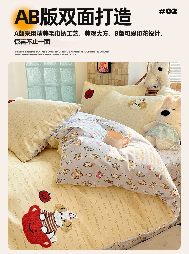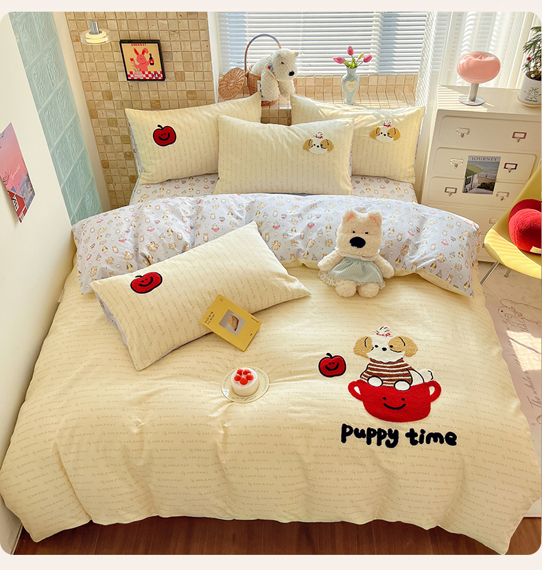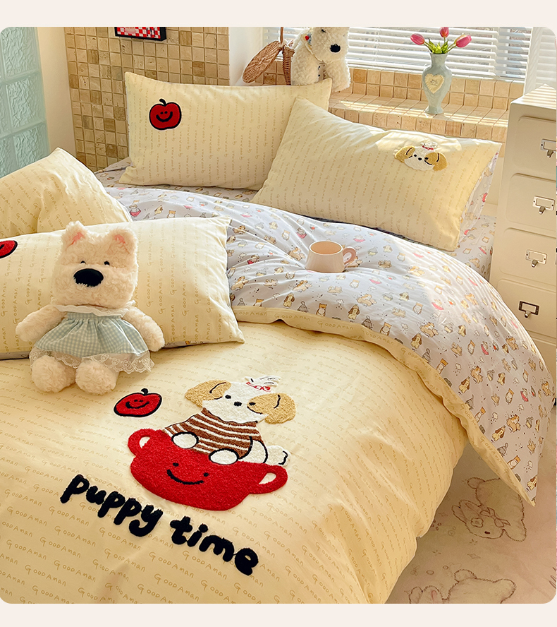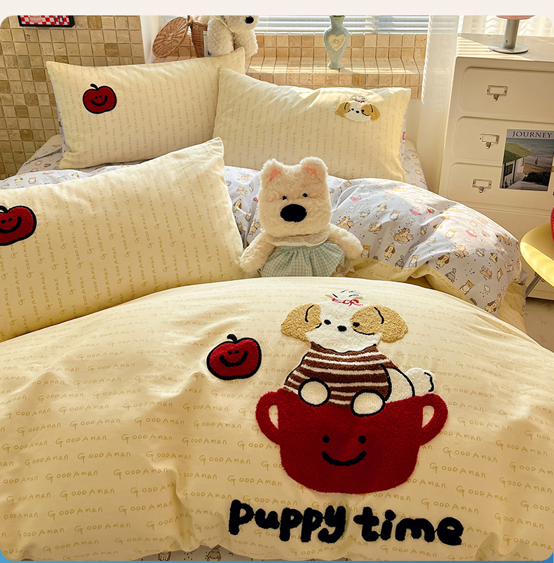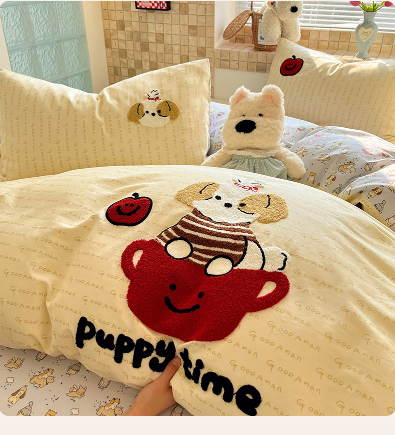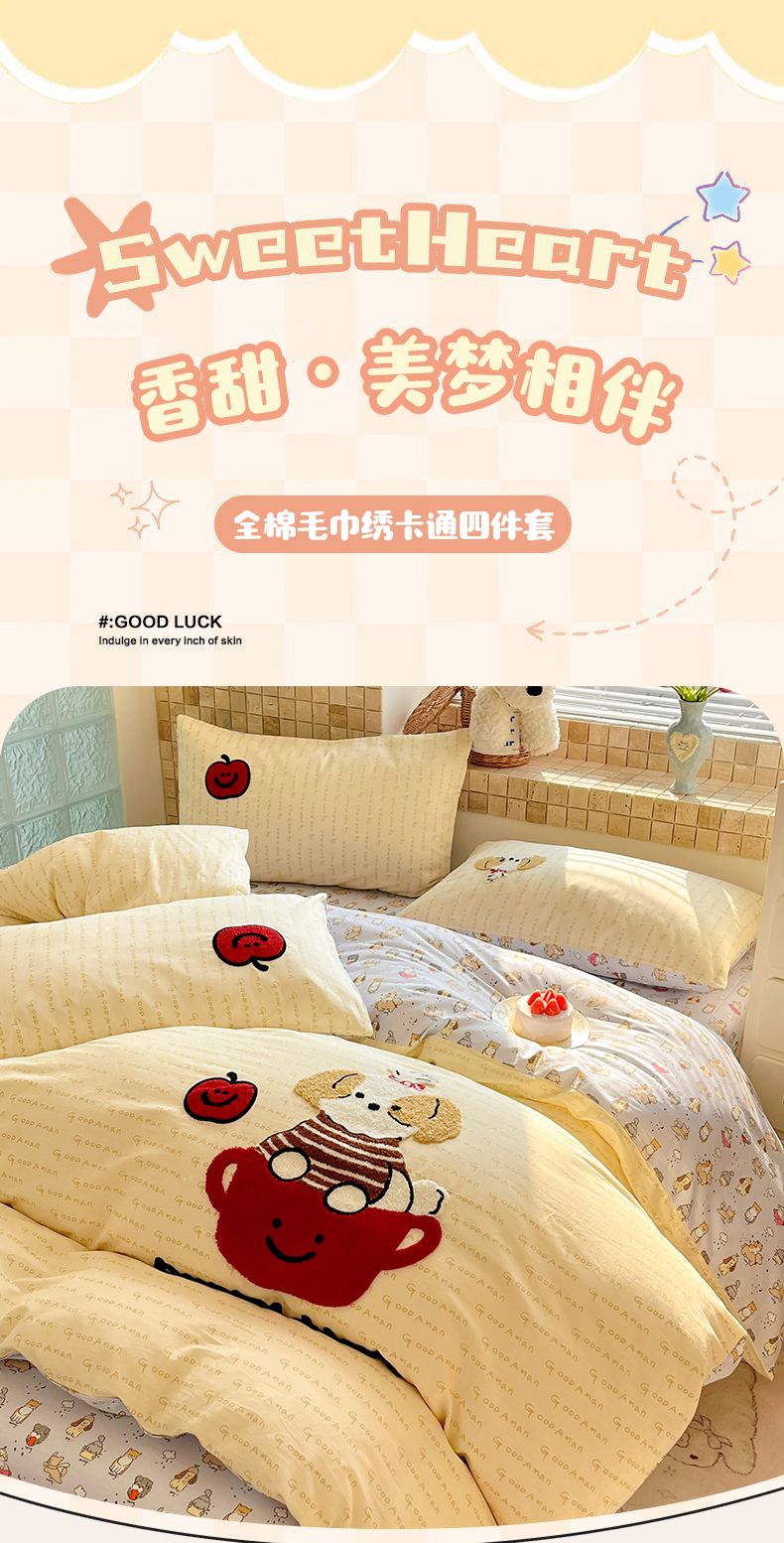 商品名称:寐居家纺 2026新款全棉毛巾绣四件套 奶黄茶犬
