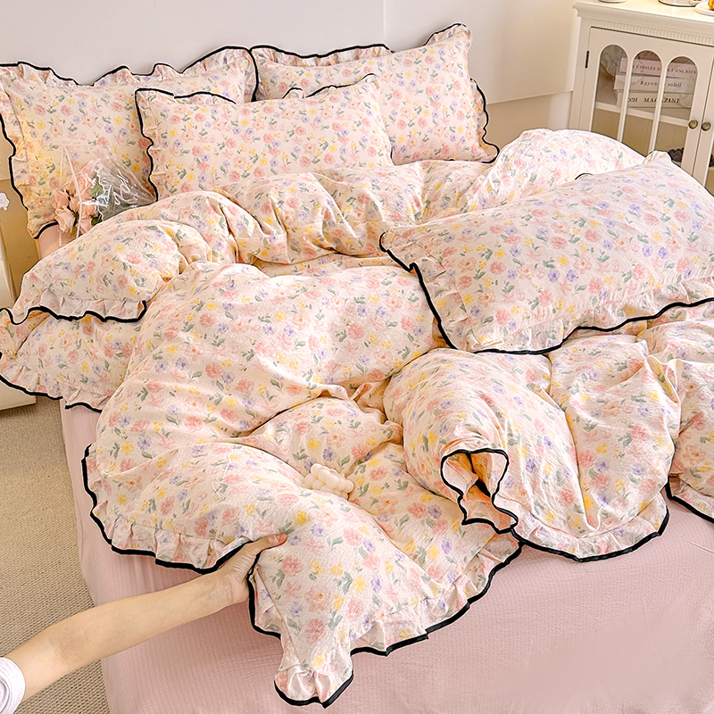 绘萱家居 2026直播爆款云感皱皱纱双层纱皱皱棉花边四件套印花水洗棉 奶油波点