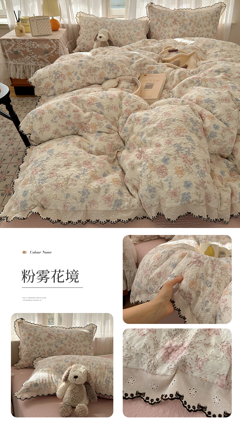 (总)凯洛奇 2026新款仿棉古法水洗棉复古法式花边四件套,春风里,粉黛花,蝴蝶结,花春晓,花漫里,花漫漫,萌趣象,紫铃兰