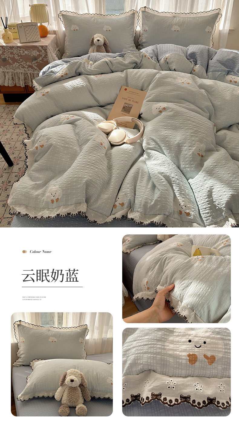 (总)凯洛奇 2026新款A类仿棉四件套古法水洗棉法式工艺花边套件(提供买家秀),精灵女孩,可爱小白,紫藤花语,心动蓝海,萌萌小猫,林间小兔,腊肠小狗,硕果盈盈,浪漫花海,兔兔聚会