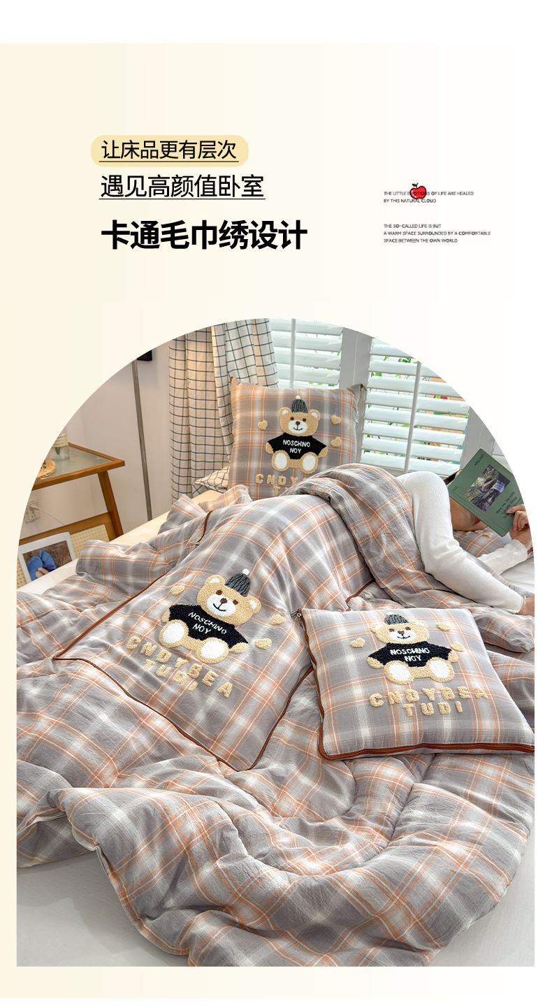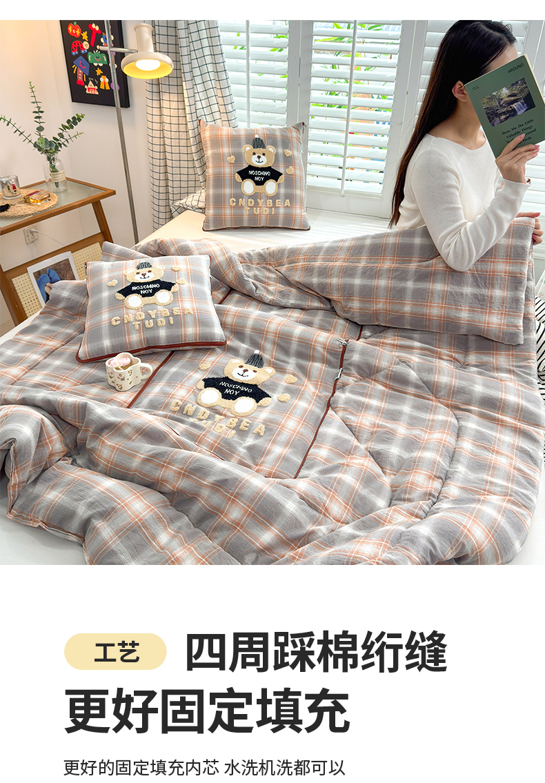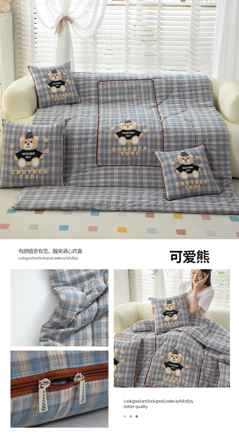 (总)宝马家纺(原梦童画) 2026新款全棉色织帽子熊抱枕被,可爱熊-蓝,可爱熊-黄,可爱熊-灰,可爱熊-橘
