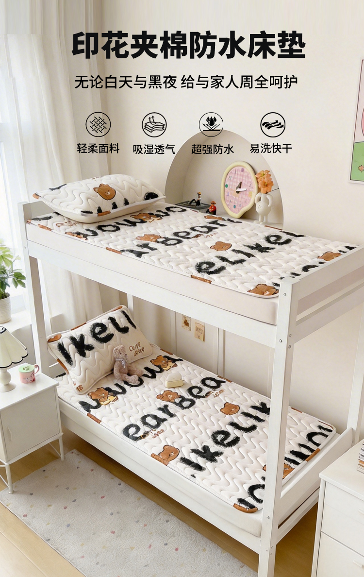 (总)希廷顿 2026新款印花夹棉防水床垫学生款,小恐龙,梦幻森林,小煤球,太空人,luck熊,萌宠狗,马上暴富,草莓熊,星星犬,熊本熊,熊猫攀竹,云之恋