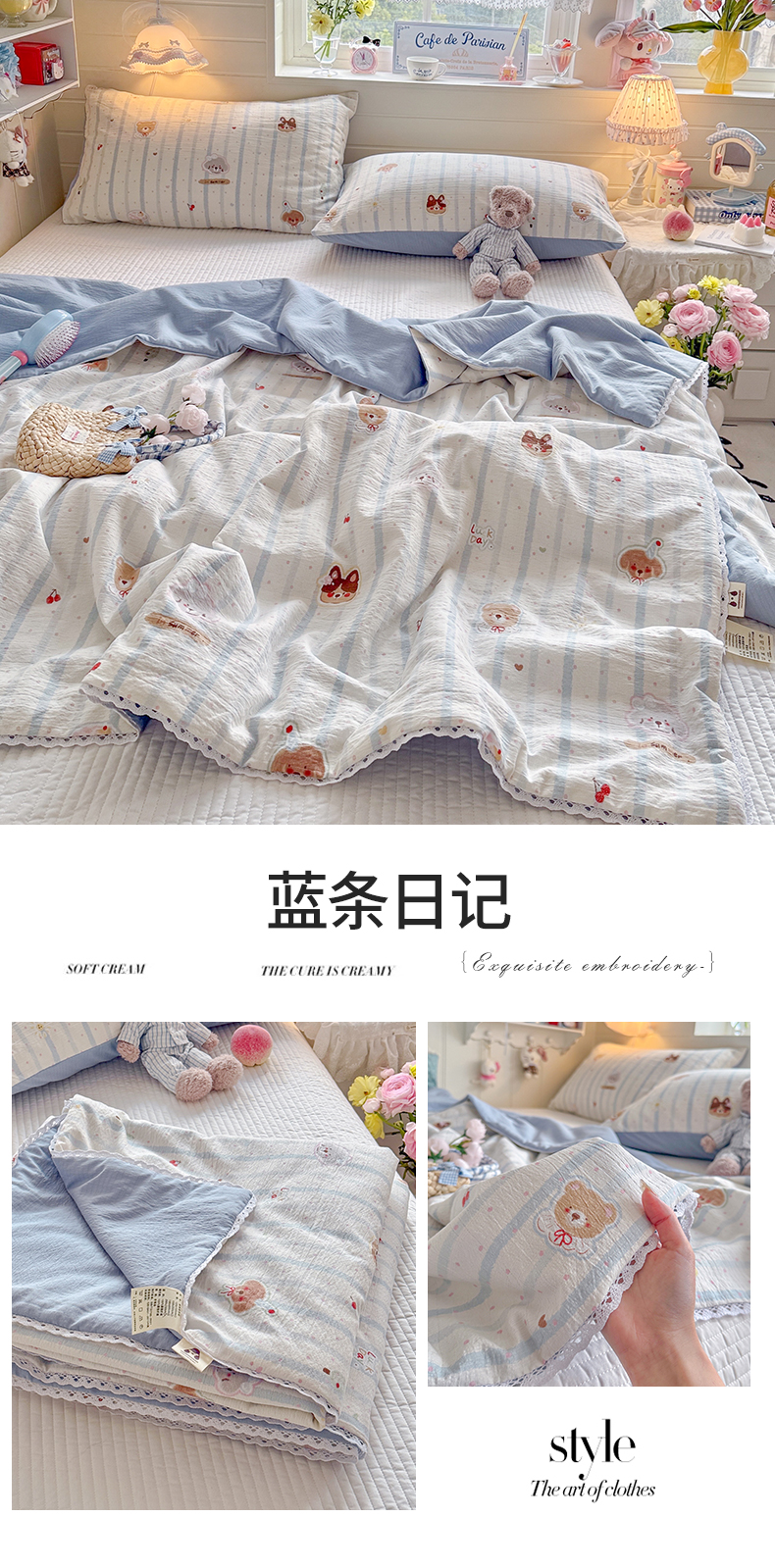 名兮家居 2026新款亲肤A类皱皱纱夏被夏凉被空调被 蓝条日记