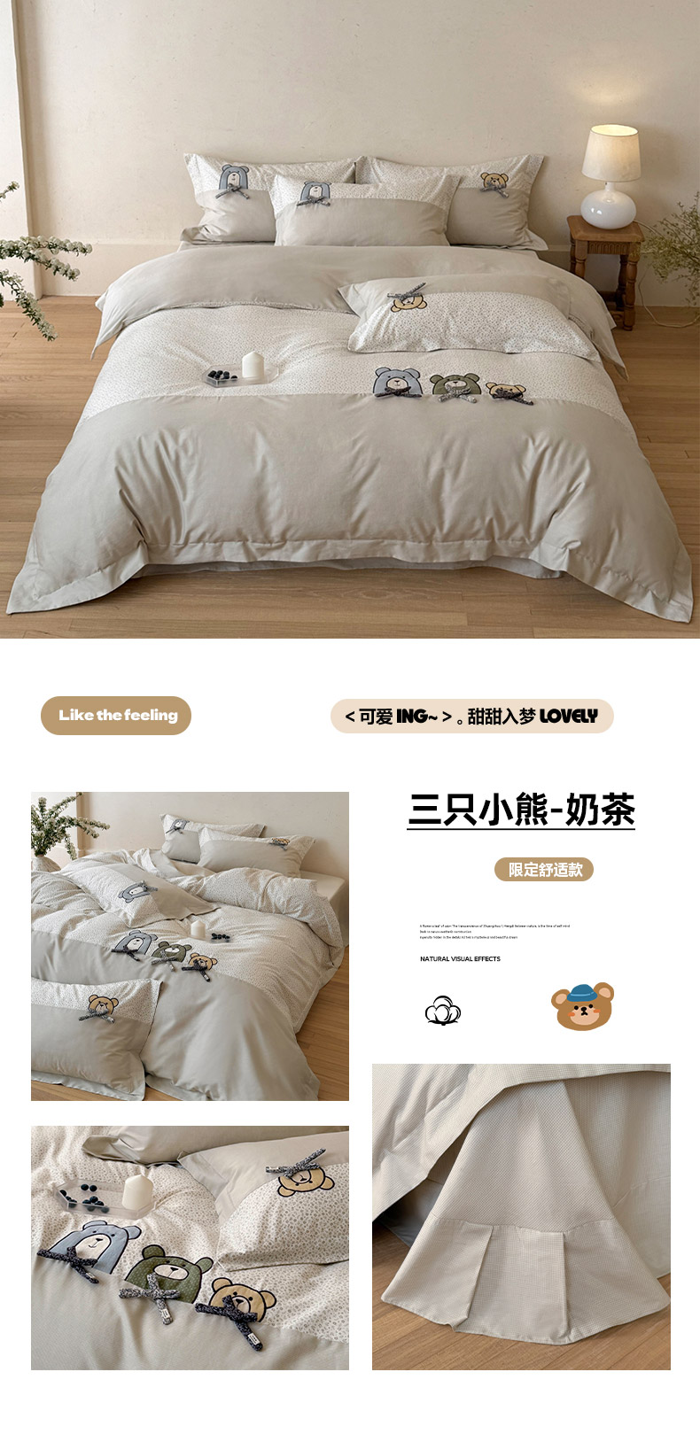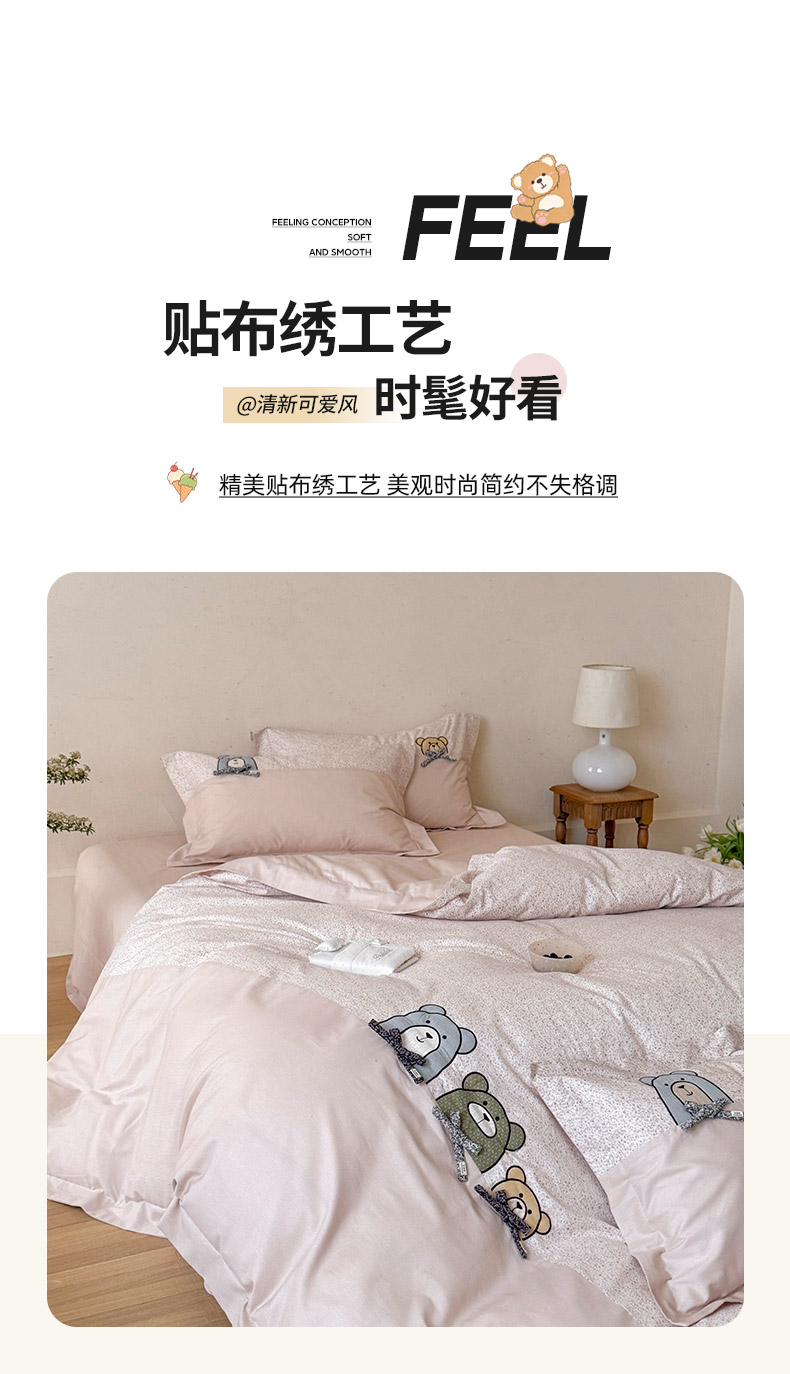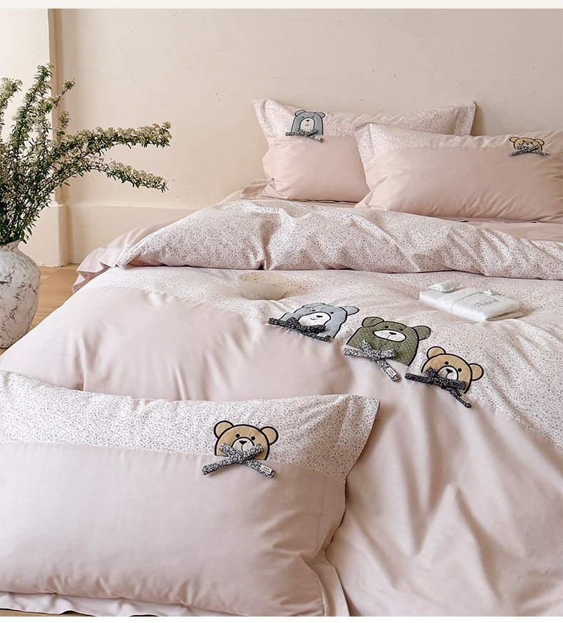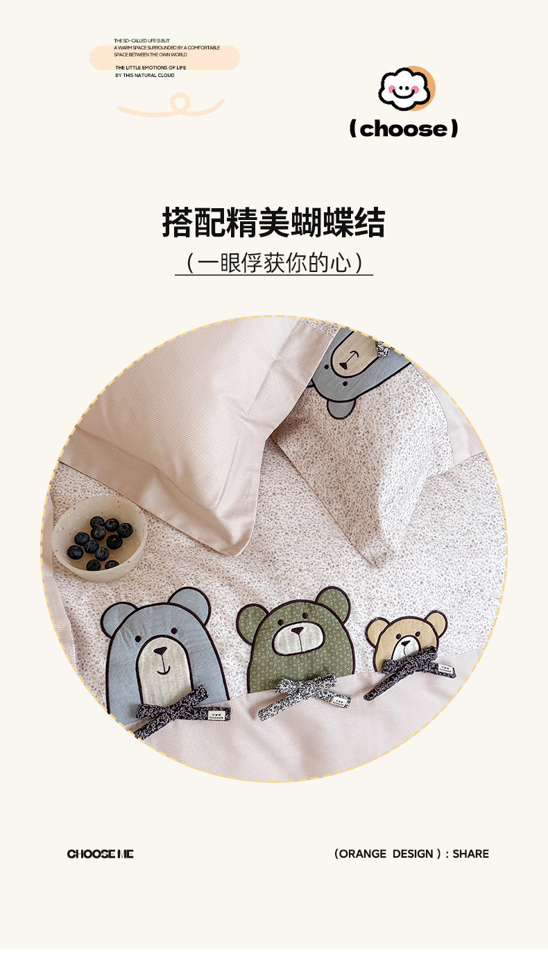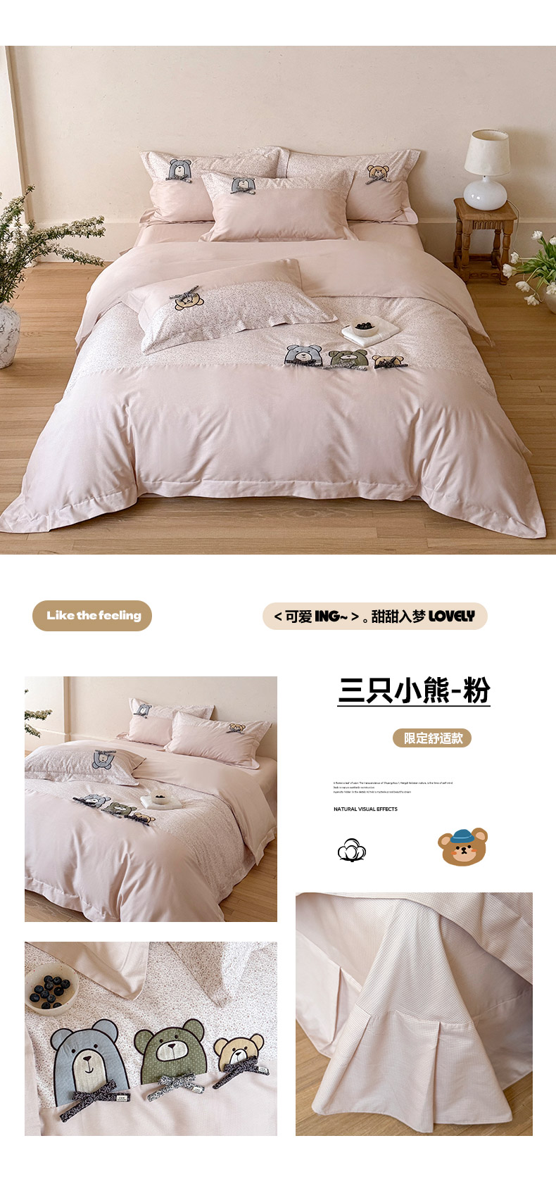 (总)艾唯希家纺 2026新款全棉贴布绣工艺四件套纯棉可爱卡通-三只小熊系列,三只小熊-奶茶,三只小熊-粉,三只小熊-绿