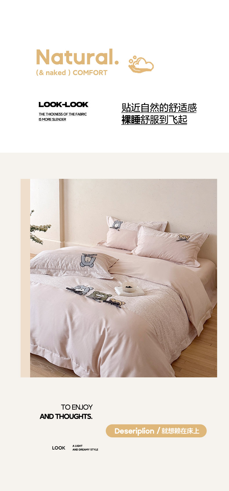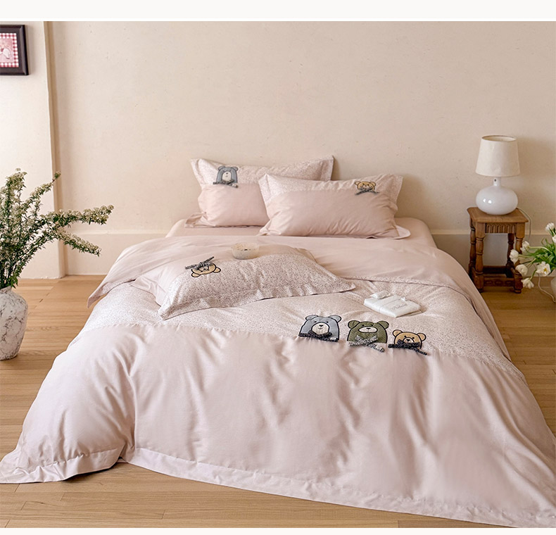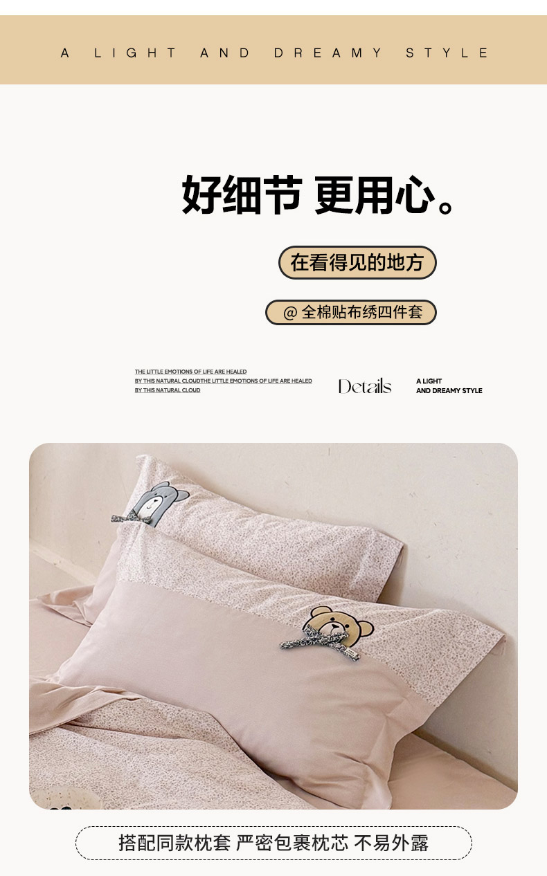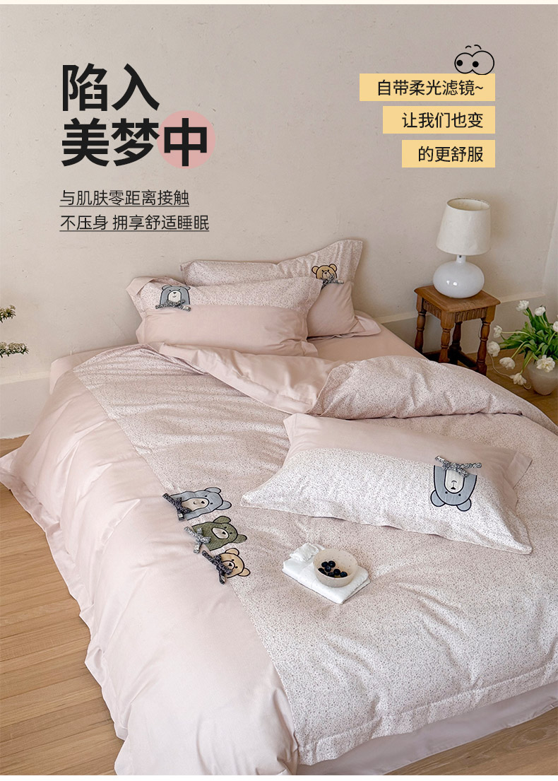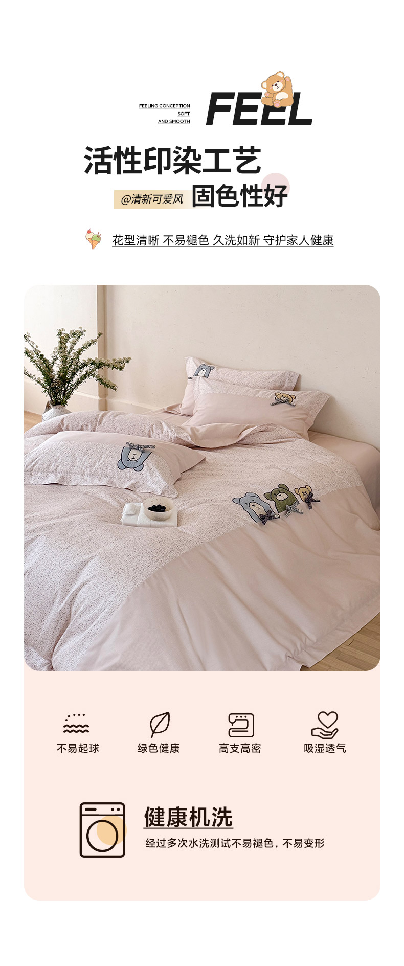 (总)艾唯希家纺 2026新款全棉贴布绣工艺四件套纯棉可爱卡通-三只小熊系列,三只小熊-奶茶,三只小熊-粉,三只小熊-绿