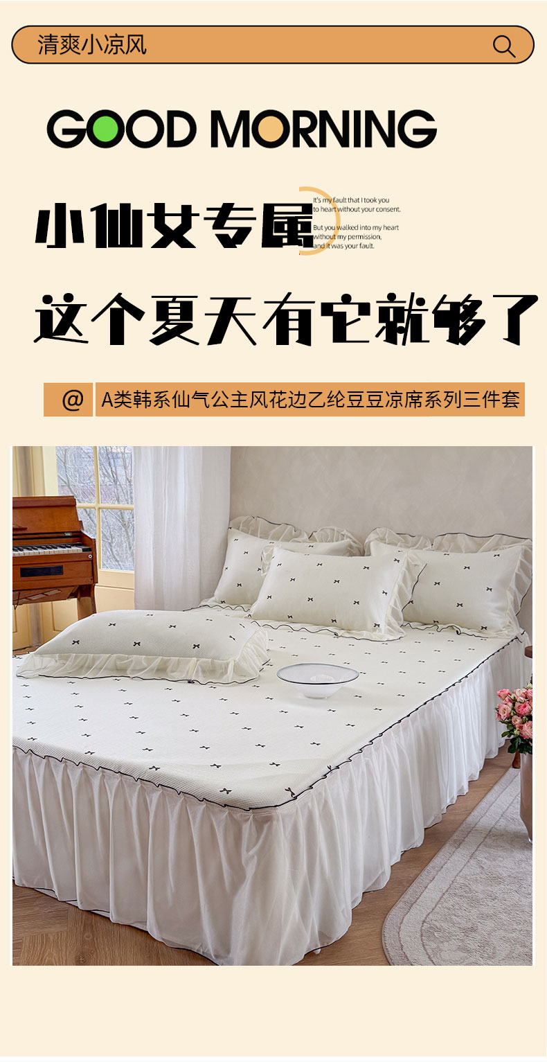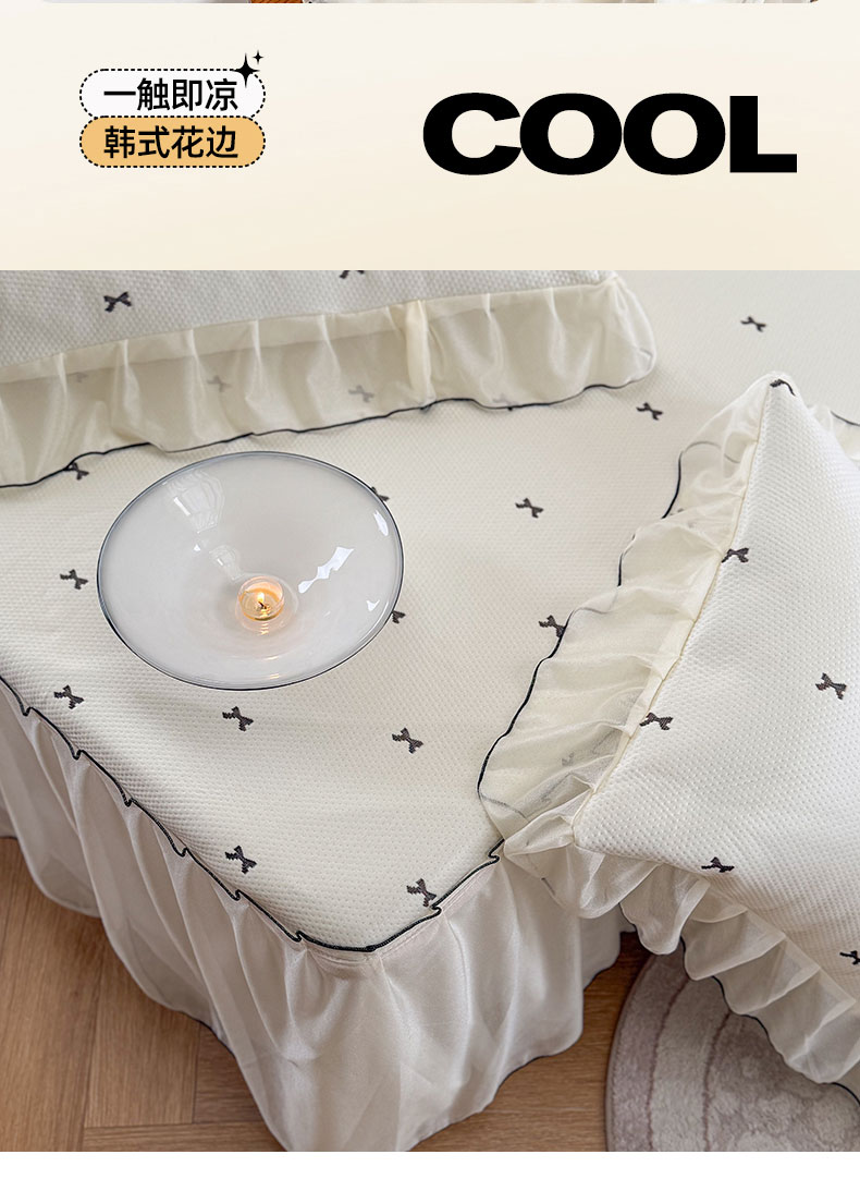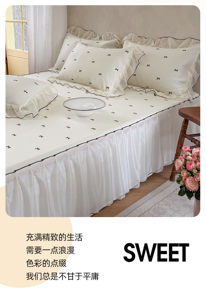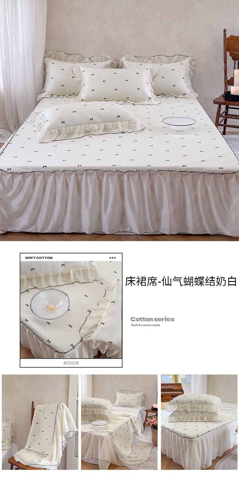 当前位置: 91家纺网 > 商品网购 > 床上用品 > 凉席 > 凉席套件 > 桃子家居 2026新款A类韩系仙气公主风PE凉感中分子床裙凉席蕾丝花边蝴蝶结乙纶豆豆凉席系列三件套 床裙席-仙气蝴蝶结奶白