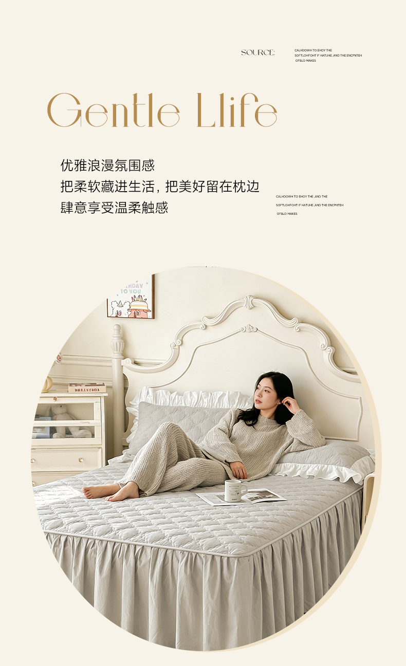 • 91家纺网 家纺一手货源 找家纺 (总)佳笠家居 2026新款A类全棉40支水洗棉少女风花边棉花床笠-场景图,枫舞灰,贵族白,晴空蓝,象牙黄,星空紫,芝夏粉