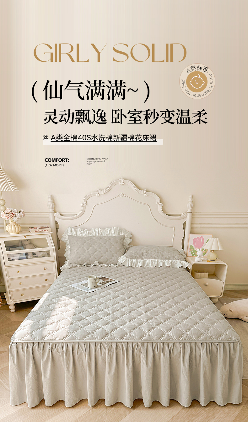 (总)佳笠家居 2026春夏新款A类韩版全棉水洗棉新疆棉花少女风床裙单件床裙单品单床裙-模特图,床裙款-枫舞灰,床裙款-贵族白,床裙款-晴空蓝,床裙款-象牙黄,床裙款-星空紫,床裙款-芝夏粉