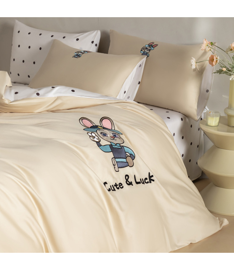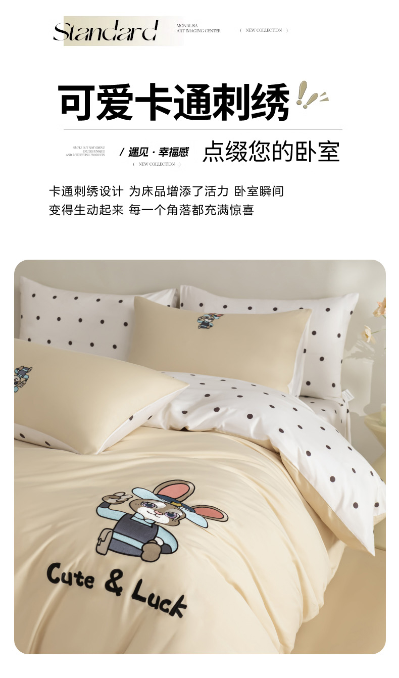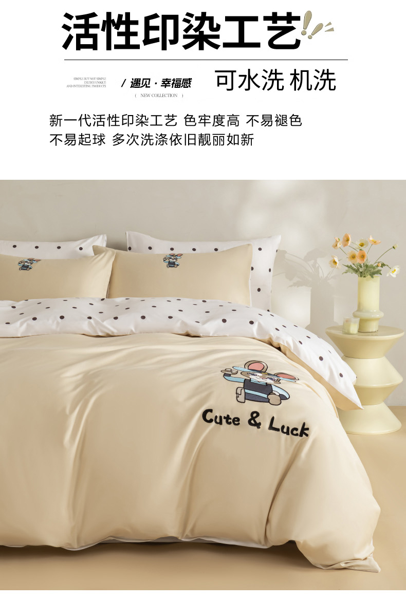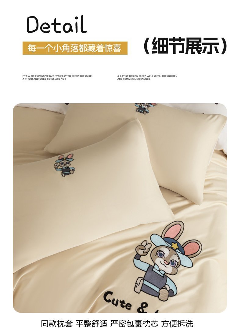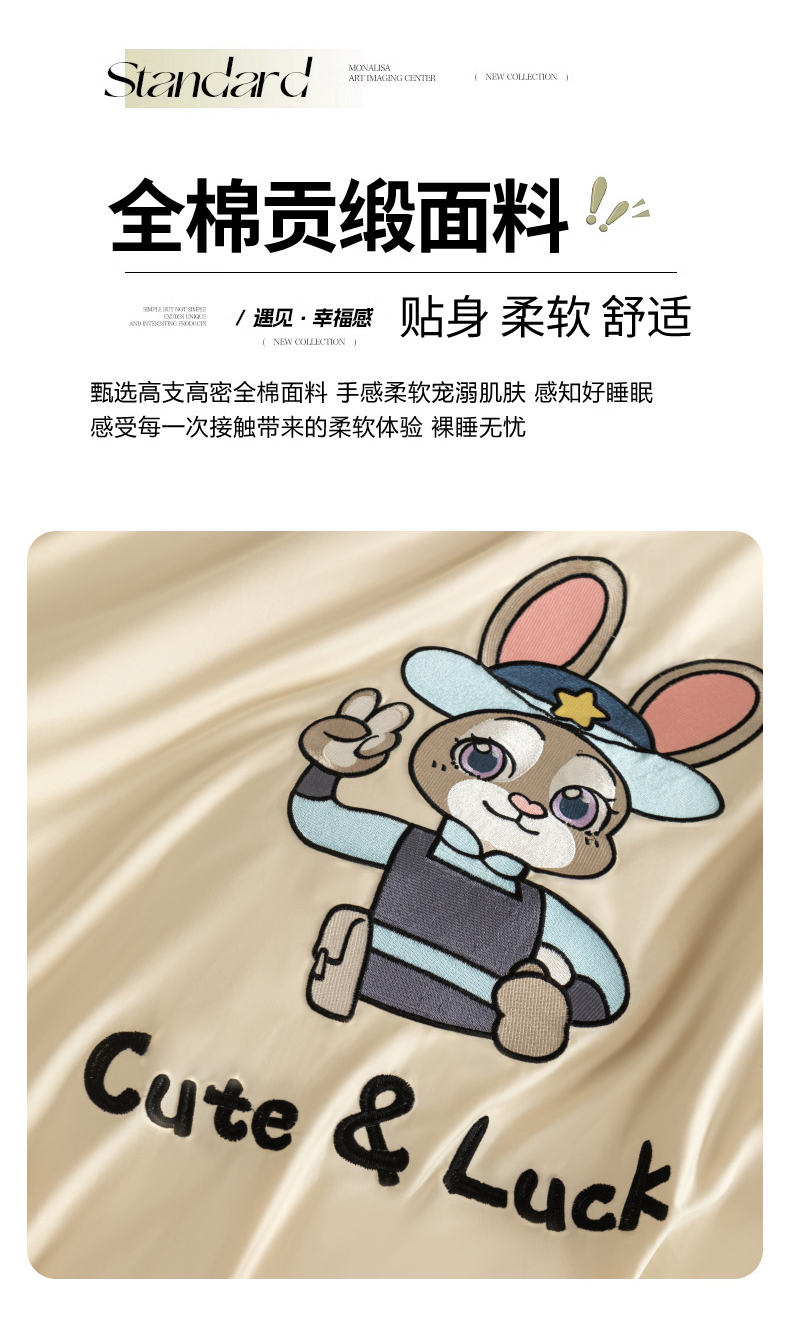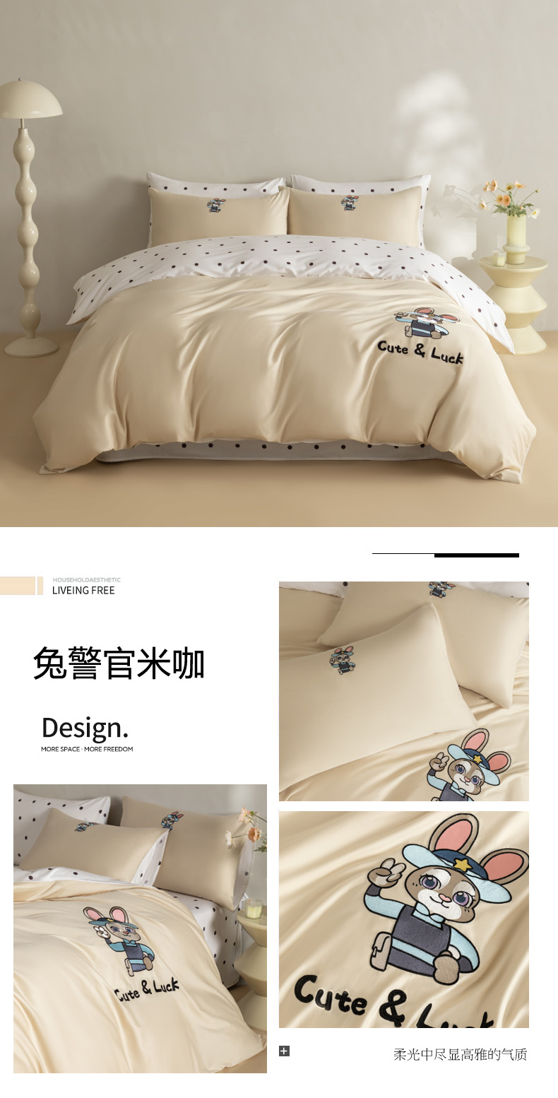 当前位置: 91家纺网 > 商品网购 > 床品套件 > 四件套 > 全棉普通四件套 > 慕尚家纺 2026春夏新款全棉纯棉50s贡缎绣花四件套 兔警官米咖