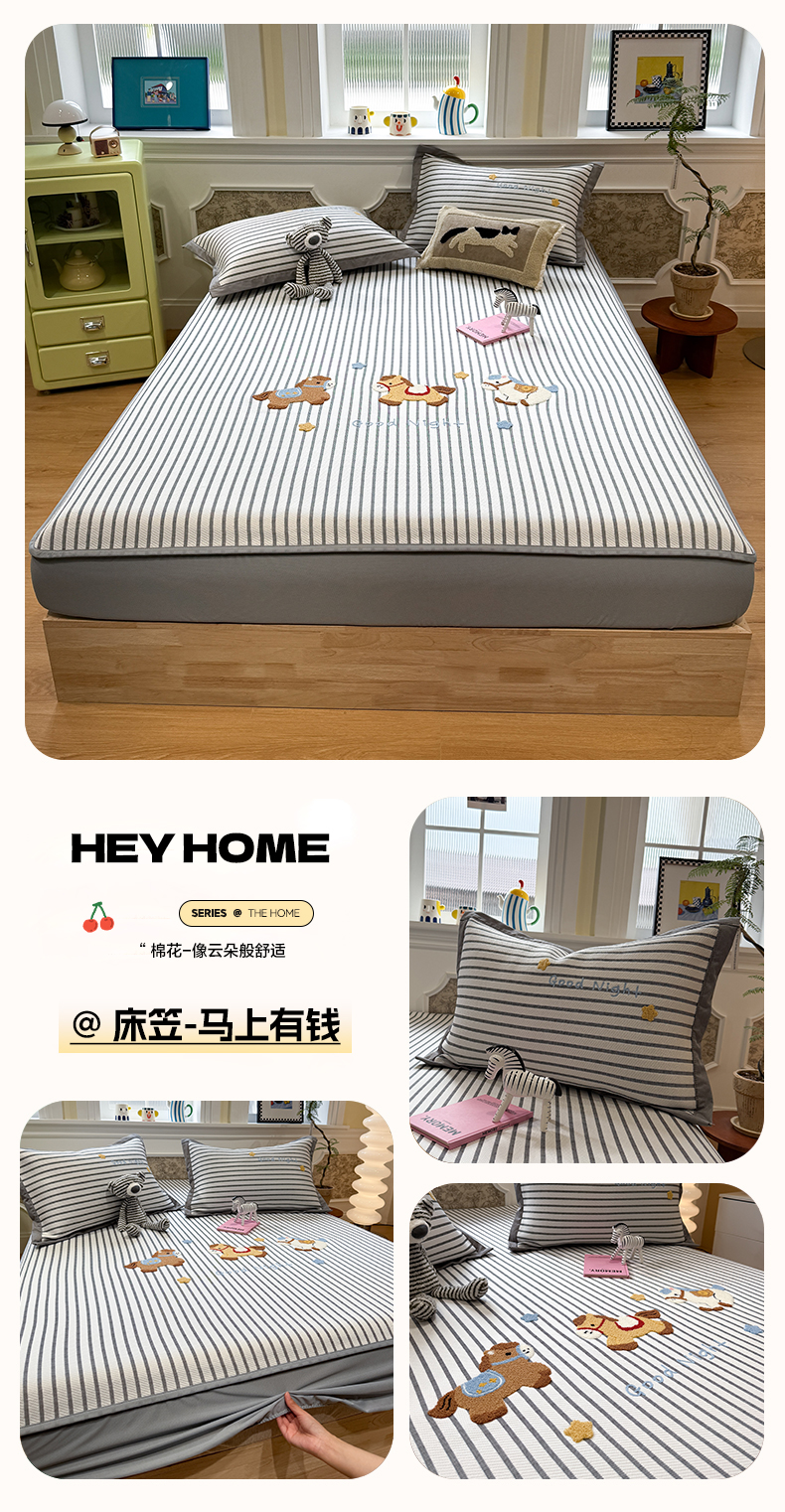 商品名称:雅居纺家纺 2026春夏新款PE凉感提花绣花凉席席子 床笠款-灰条开心狗