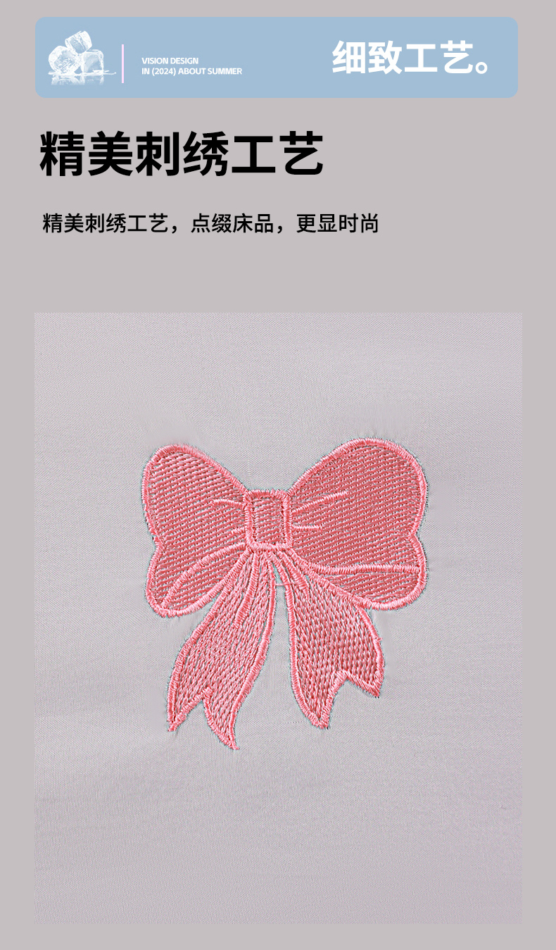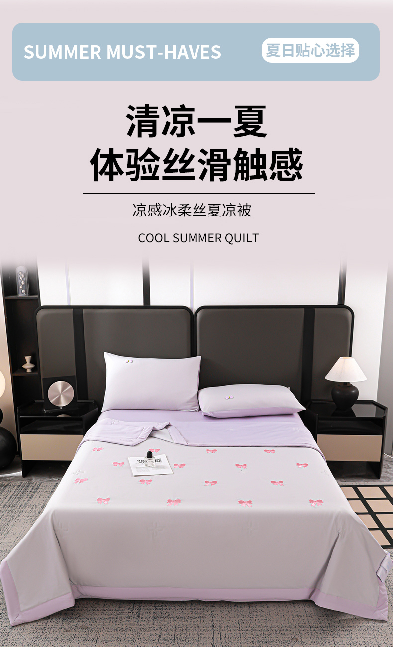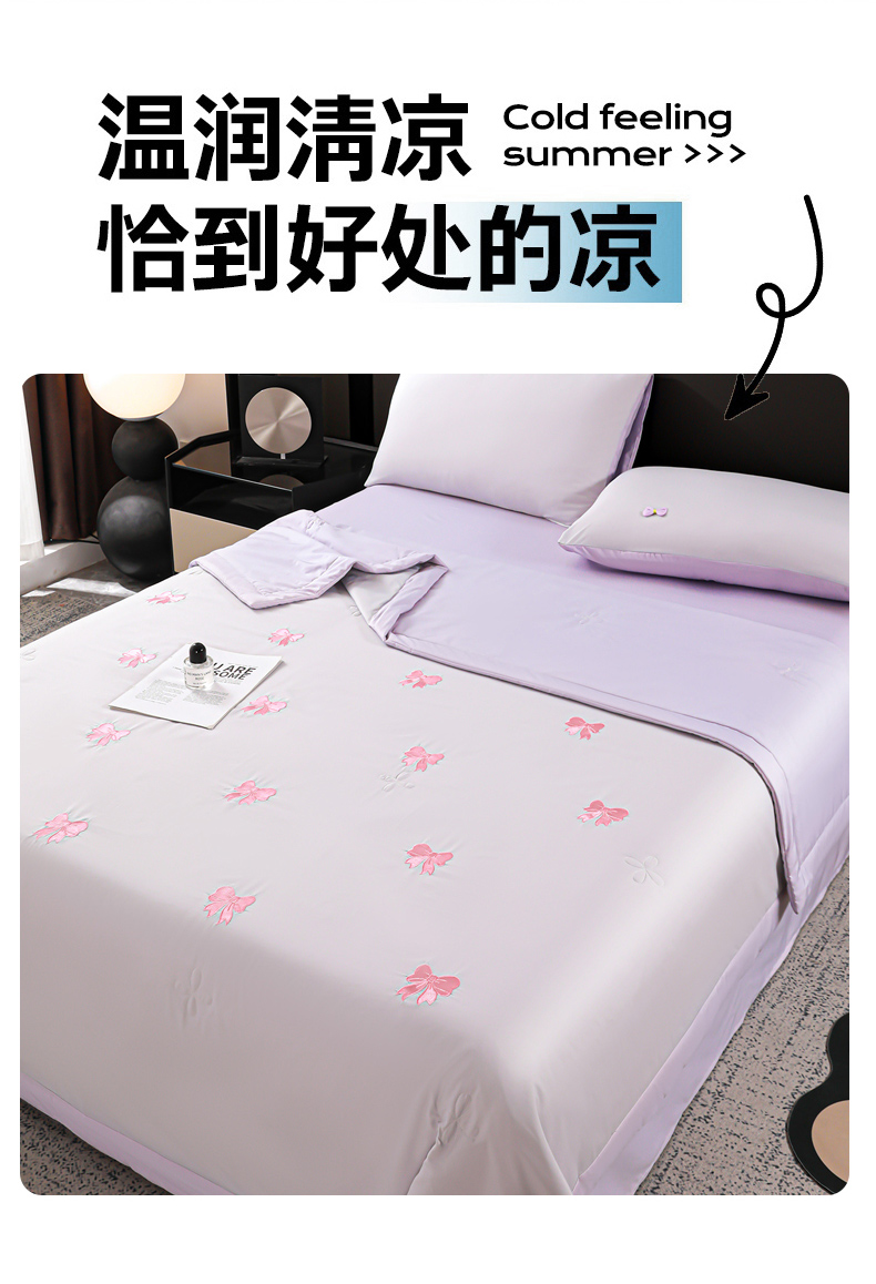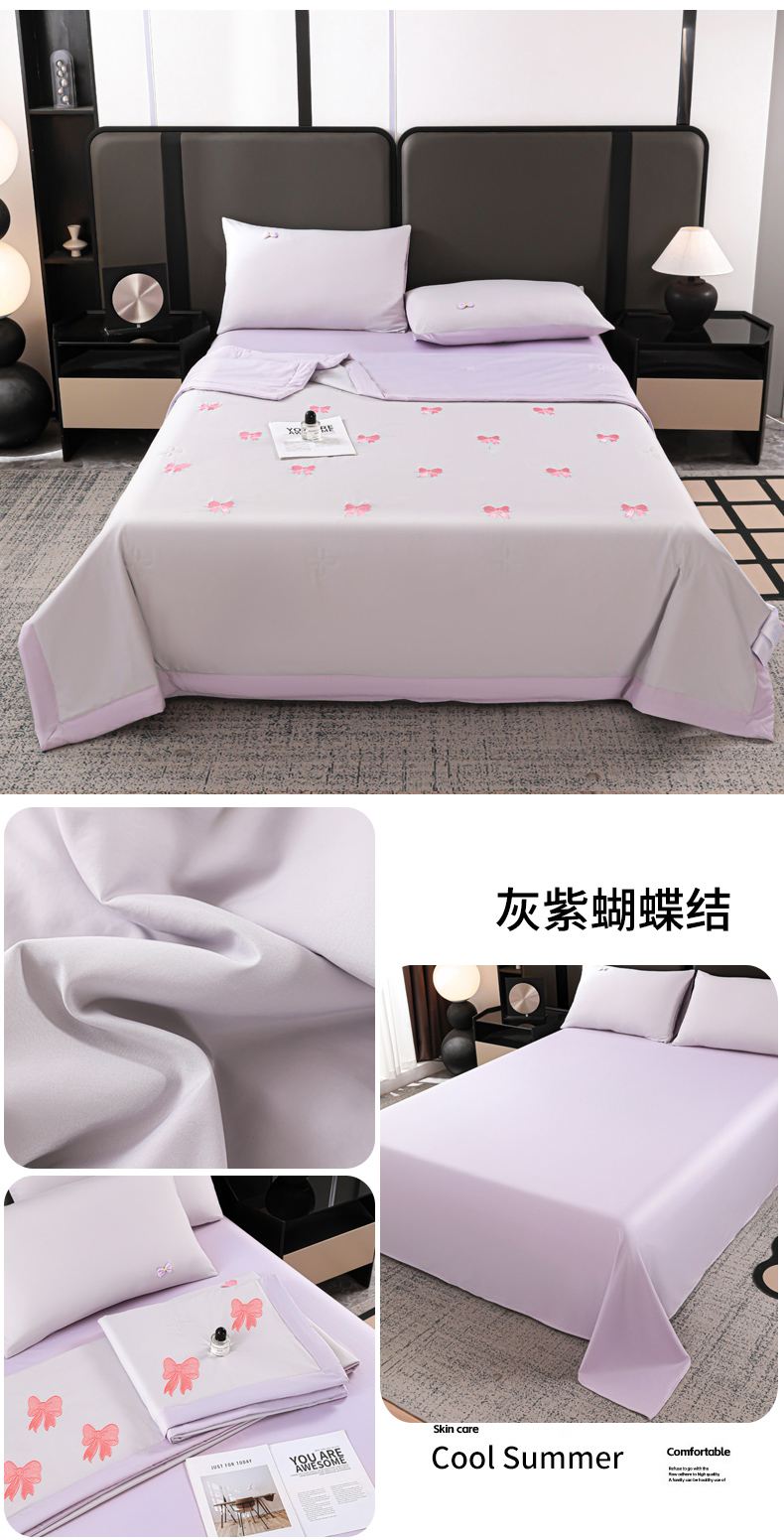 • 91家纺网 家纺一手货源 找家纺 佳鸿家纺 2026新款A类凉感冰柔丝刺绣手包边夏凉被夏被四件套 提供质检报告 灰紫蝴蝶结
