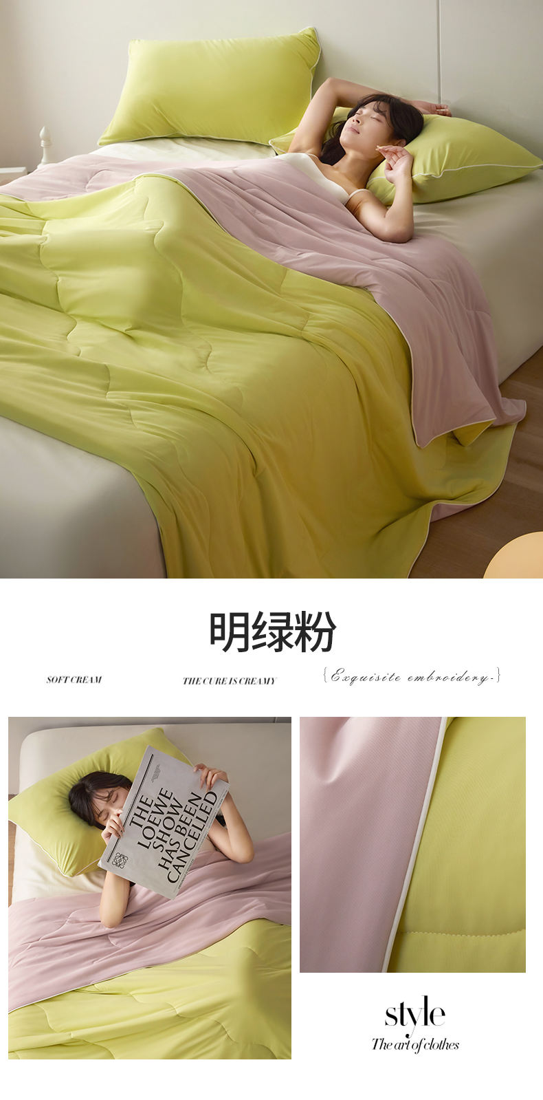 (总)头等舱 2026新款4.0版凉感A类锦氨(165克)55大豆抗菌夏凉被夏被配礼盒模特图,典雅兰,典雅兰拼黄绿,典雅兰拼浅灰,黄绿拼嫣然紫,米黄拼浅绿,浅豆沙拼米黄,浅灰,浅灰拼浅豆沙,浅绿,嫣然紫拼浅灰,配礼盒