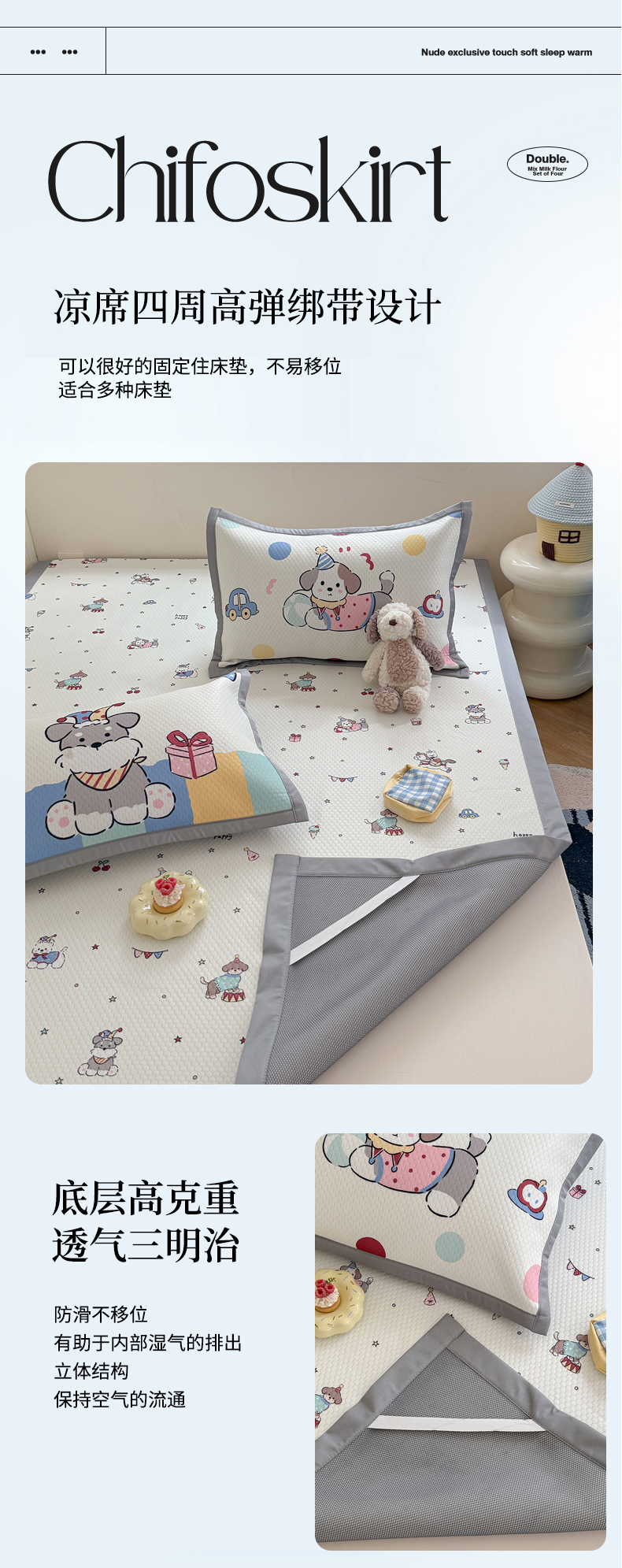 (总)Sweet dreams甜梦 2026新款A类锦氨异性贴布高端豆豆凉席-场景2,调皮狗,抱抱熊,嘎嘎鸭,哈哈蛙,晚安猫,组合