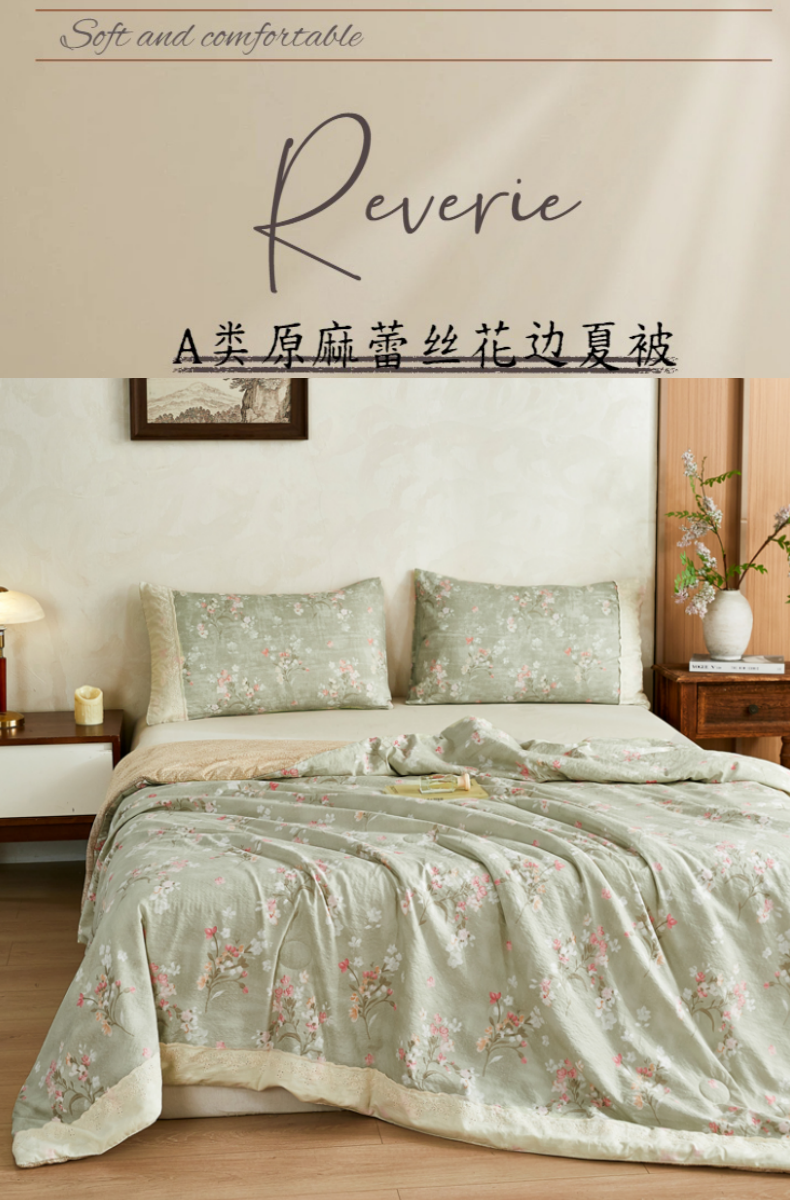 商品名称:圣比熊 2026新款A类夏天原麻全棉蕾丝花边加厚夏被宿舍双人床仿亚麻被子被芯 清风花叙