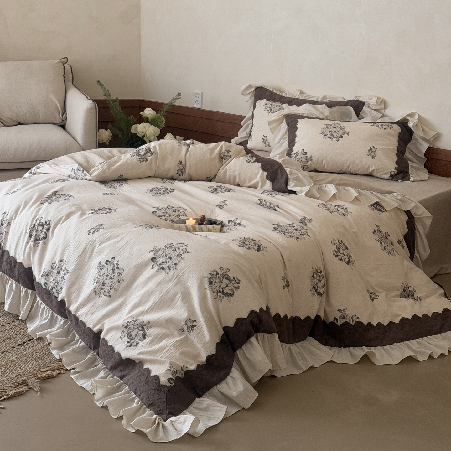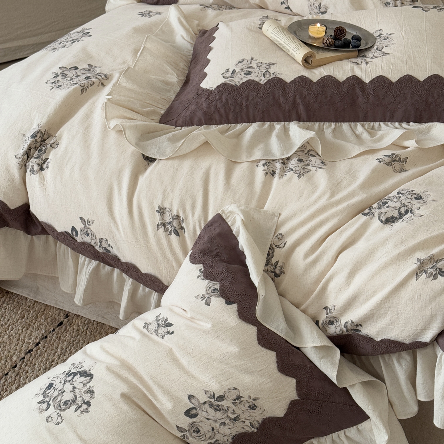 (总)佳汐蓝家纺 2026春夏新款全棉纯棉复古大提花皱皱双层纱四件套-十里蔷薇 控价:卷后不低于398,十里蔷薇-灰色,十里蔷薇-暖咖
